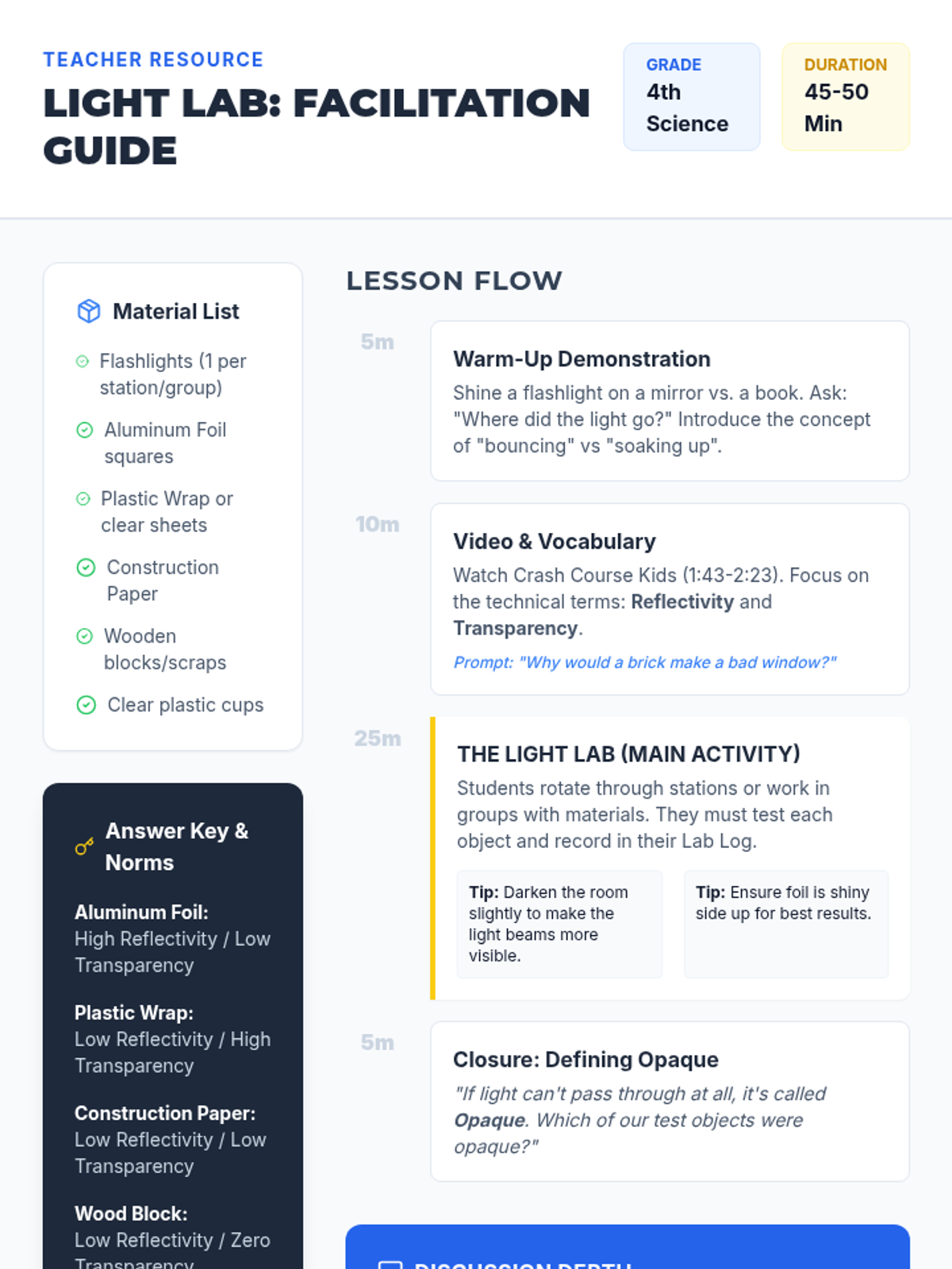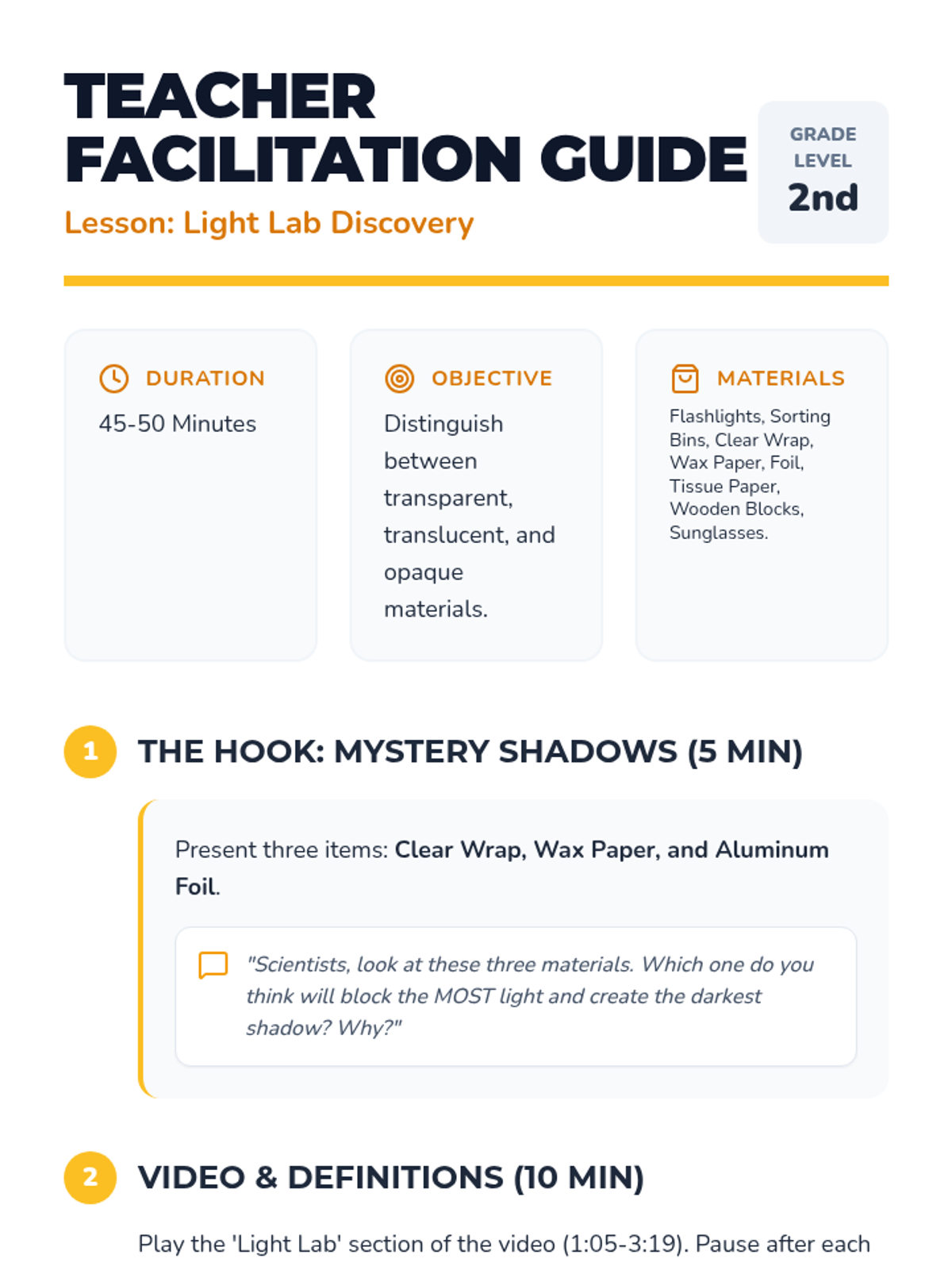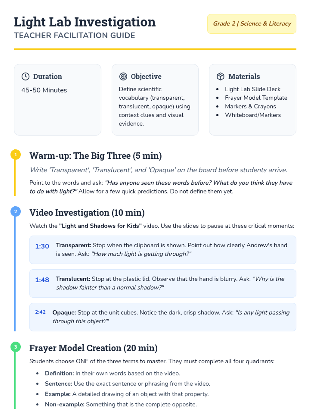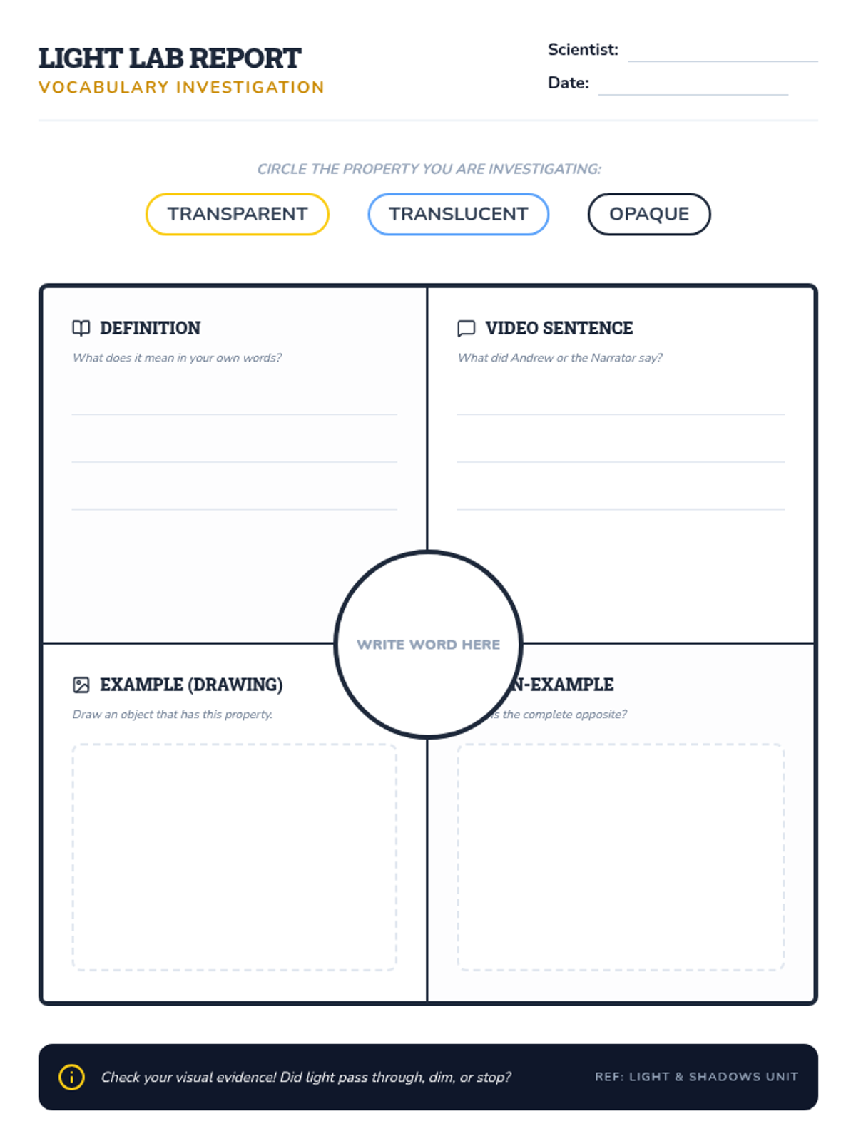 A 2nd-grade science and literacy lesson exploring how light interacts with different materials. Students use a 'Light Lab' video and visual evidence to define and apply the terms transparent, translucent, and opaque.