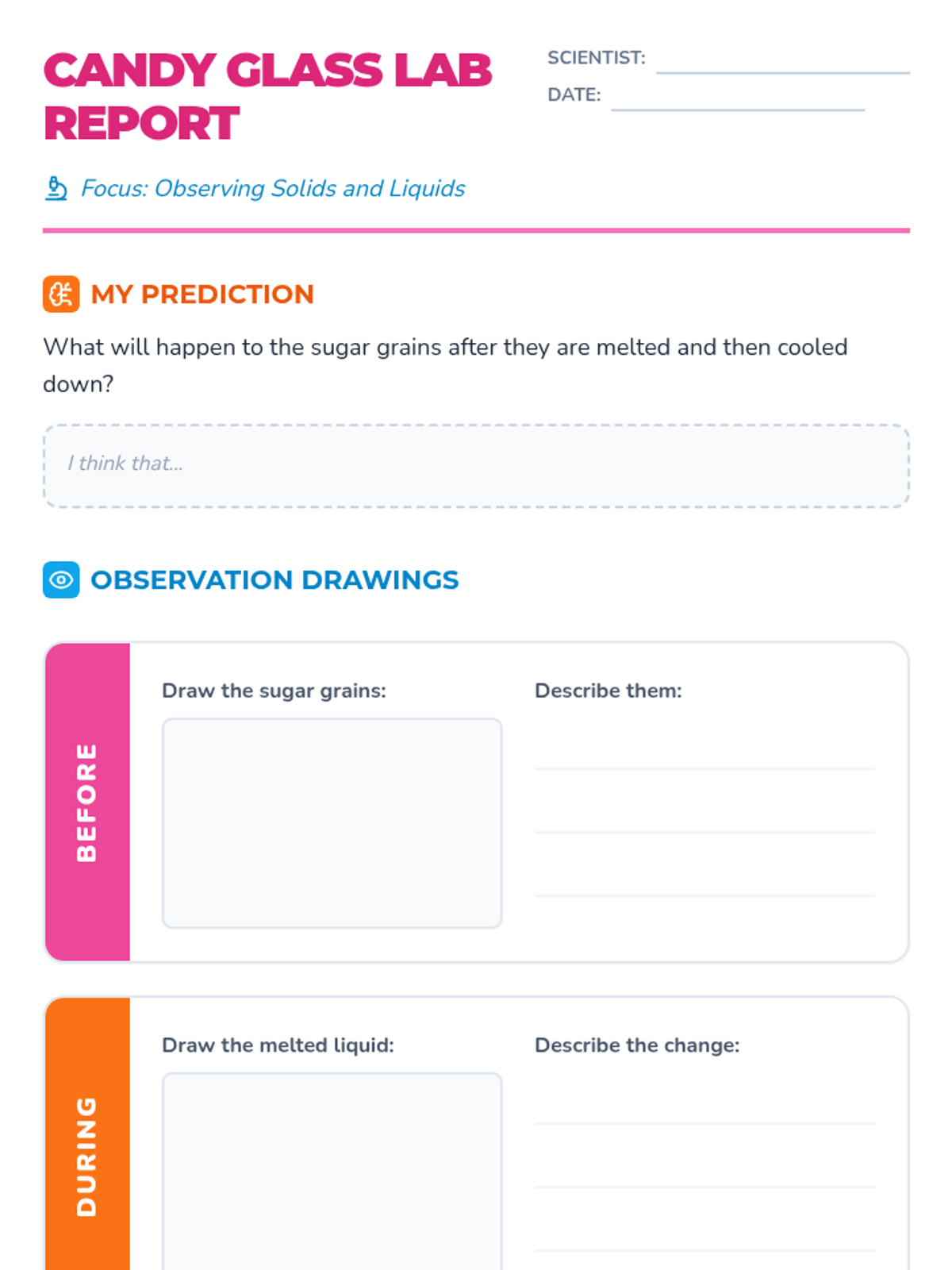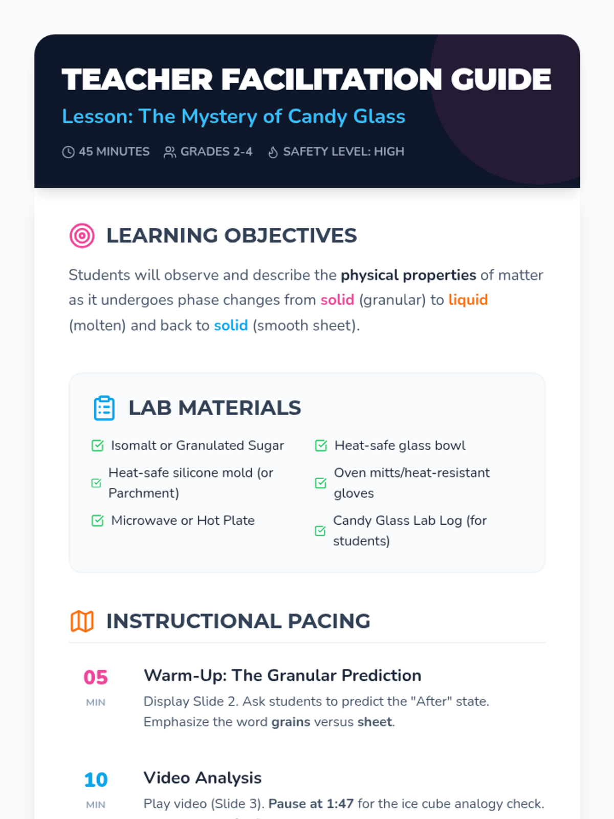A hands-on science lesson where students explore phase changes by creating 'candy glass' from sugar or Isomalt, paralleling the industrial process of glass making from sand.