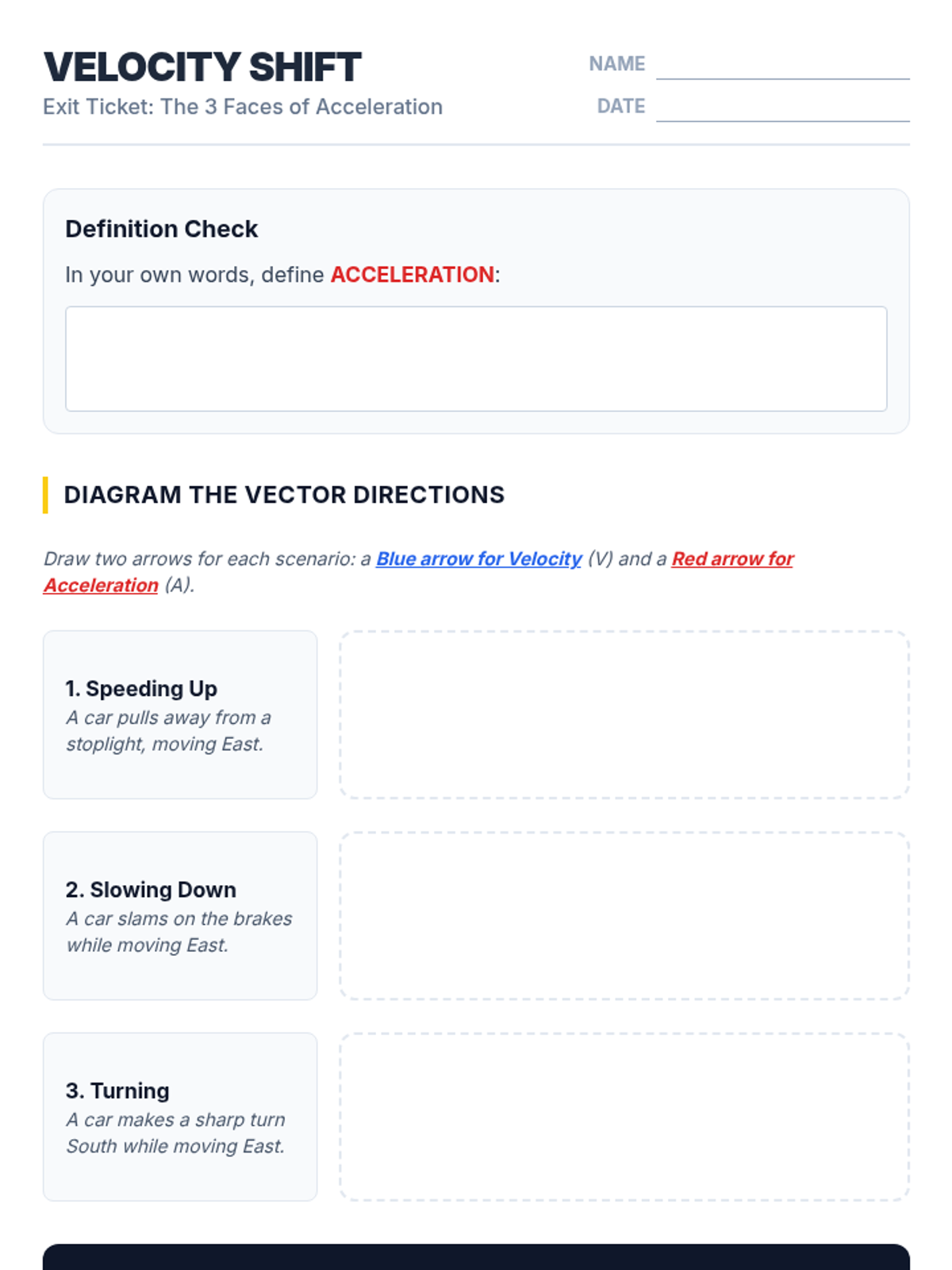 A lesson exploring the vector nature of velocity and acceleration with a specific focus on curved motion and 'negative' acceleration. Students use race track visualizations to draw and analyze vector components.