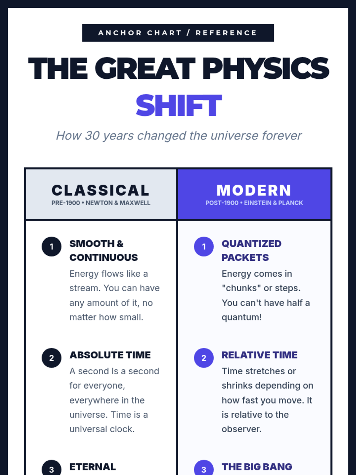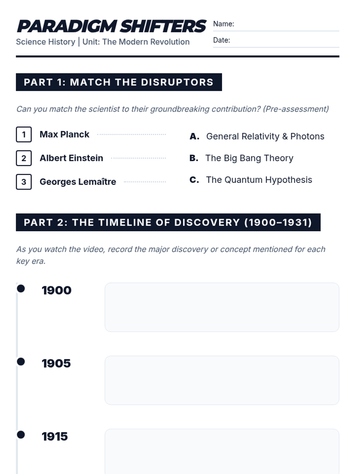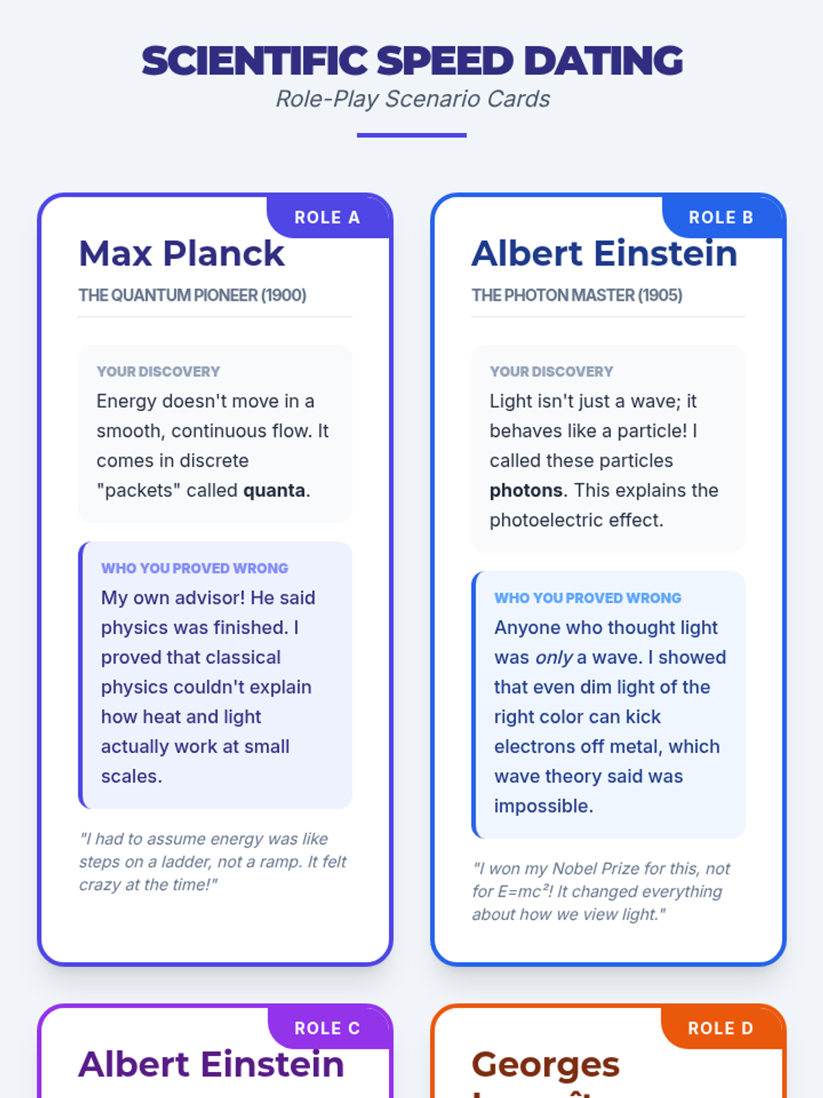 A 10th-grade science history lesson exploring the shift from classical to modern physics through the contributions of Planck, Einstein, and Lemaître. Students evaluate how these figures disrupted the scientific status quo using video analysis and a 'Scientific Speed Dating' role-play activity.