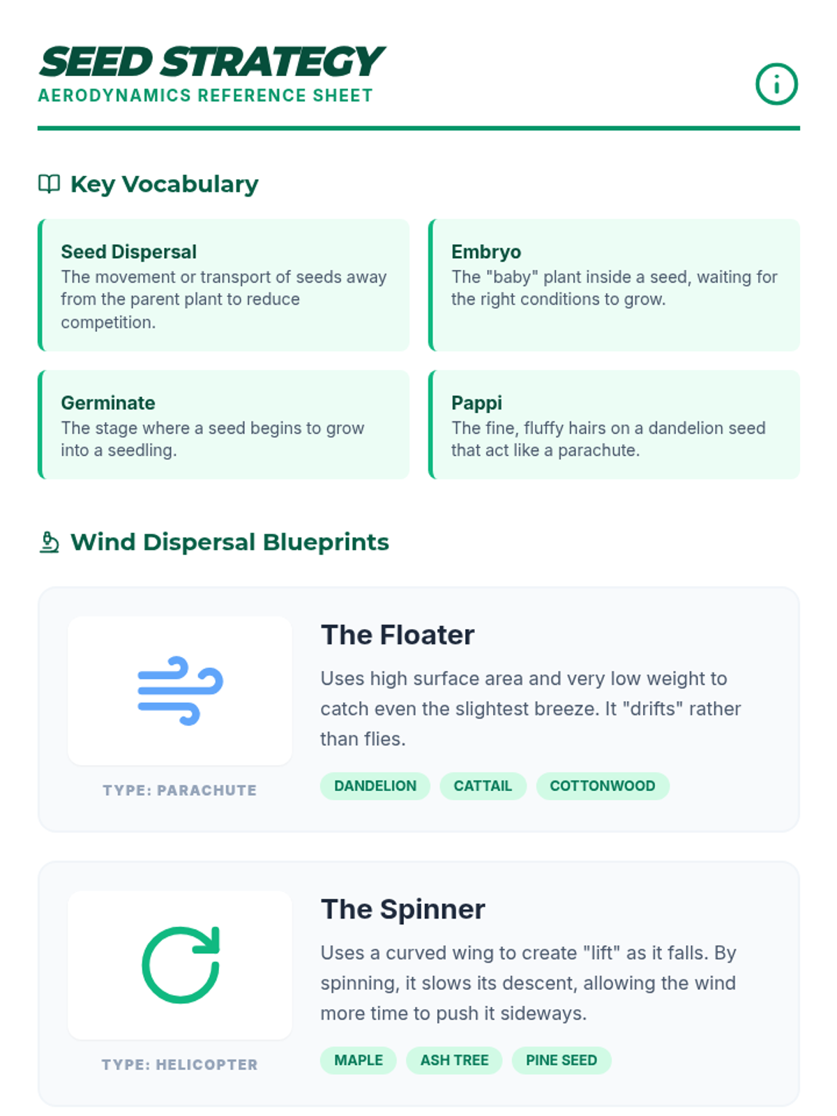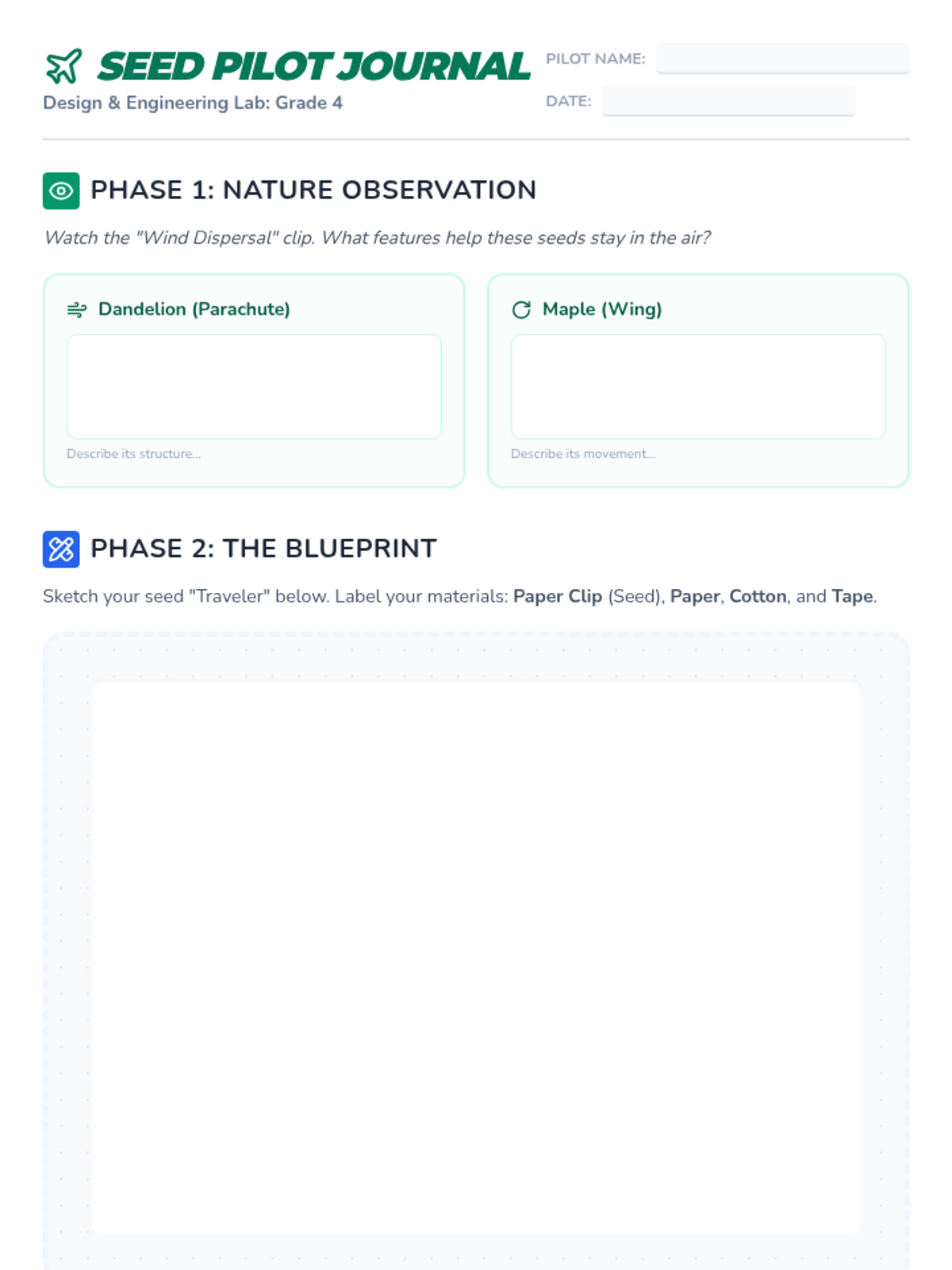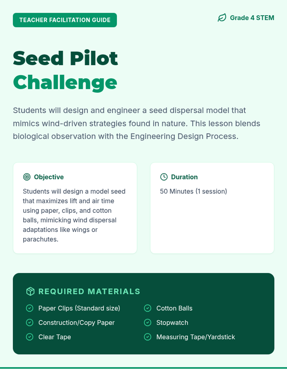 A hands-on STEM lesson where 4th graders explore wind dispersal strategies in nature and use engineering principles to design a seed model that maximizes air time. Students observe dandelions and maple seeds to inspire their own paper and cotton 'Traveler' designs.