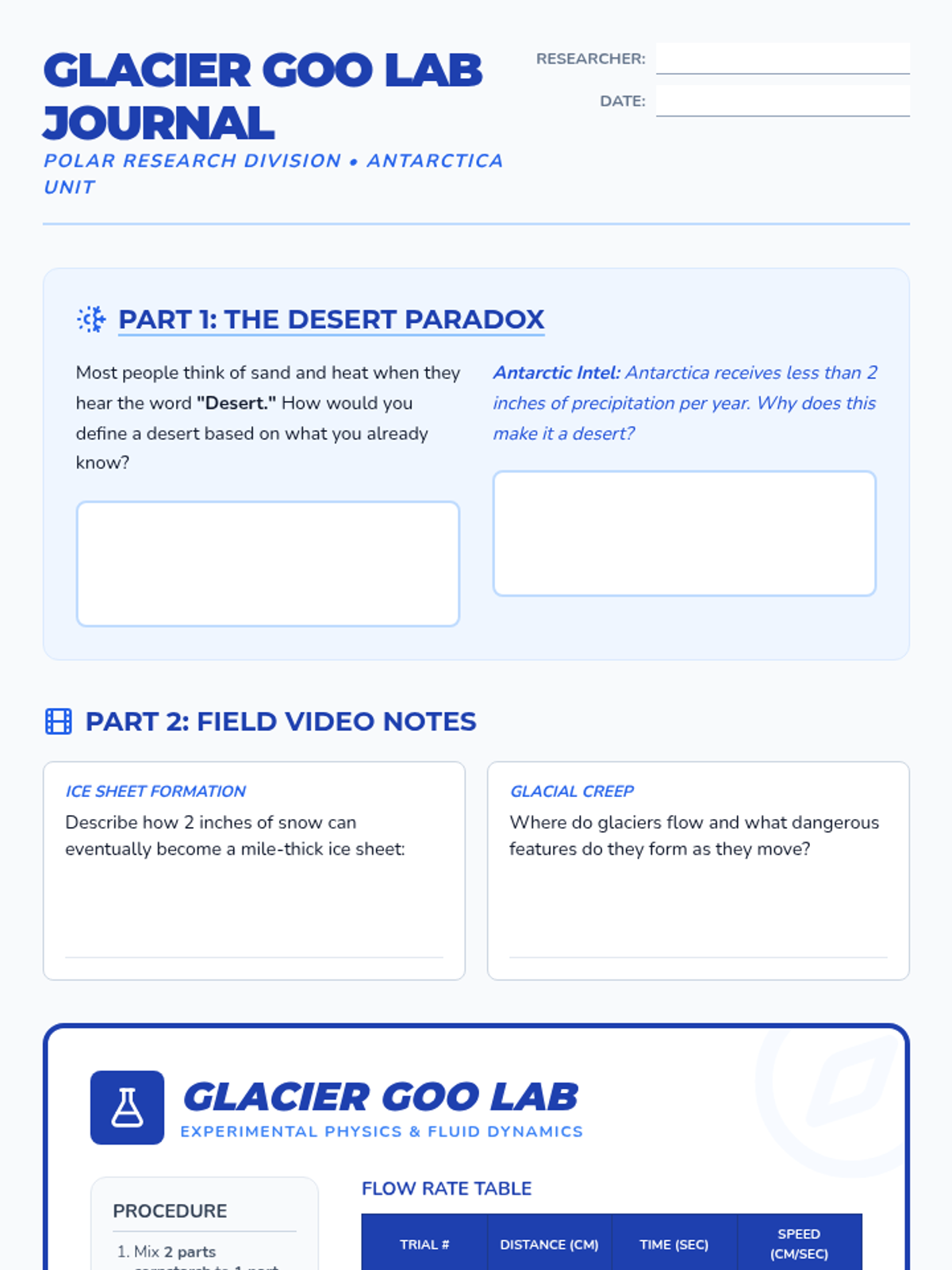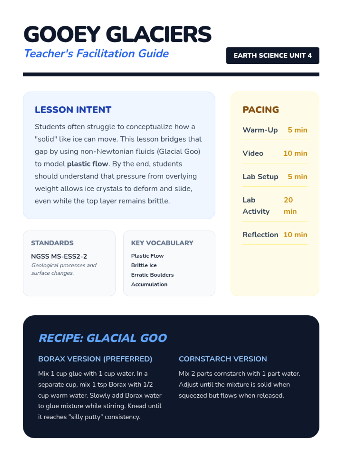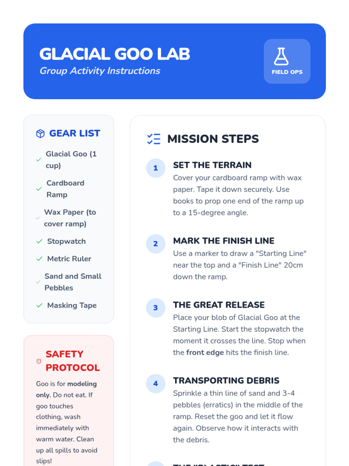 A middle school science lesson exploring the physical properties of glaciers and the mechanics of plastic flow. Students use 'Glacial Goo' to model ice movement and debris transport, connecting physical properties to geological processes.