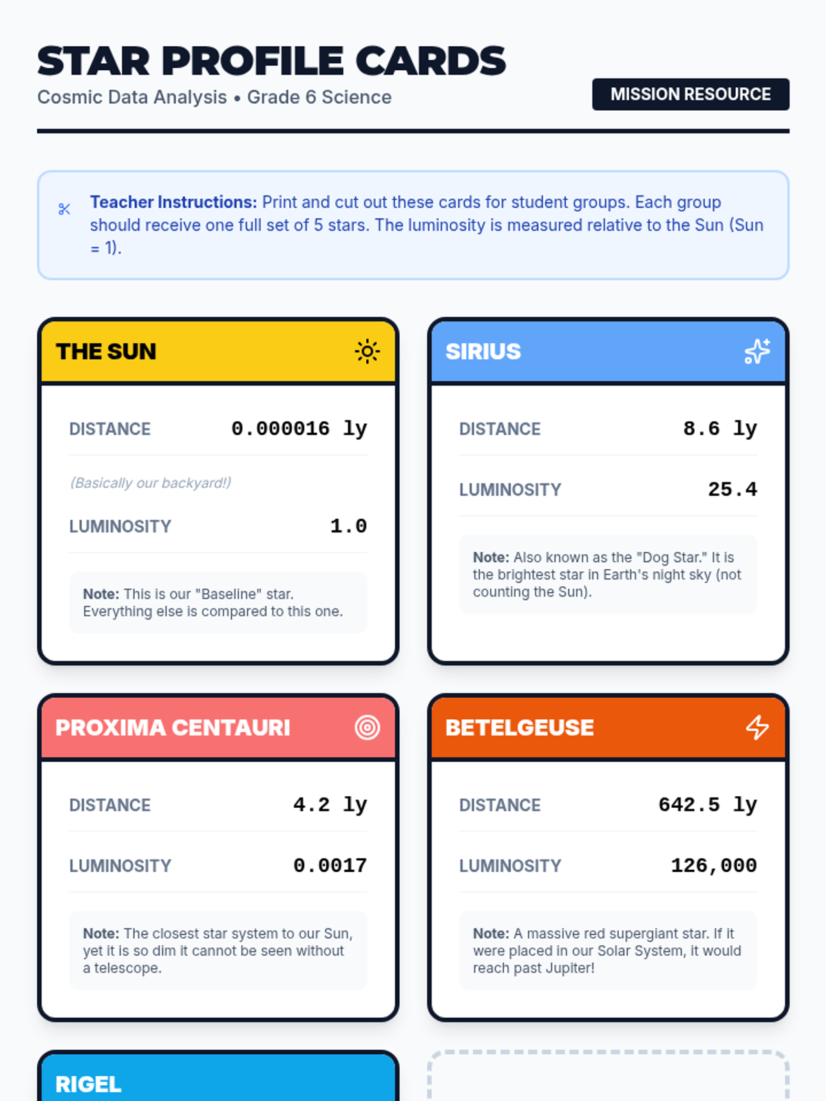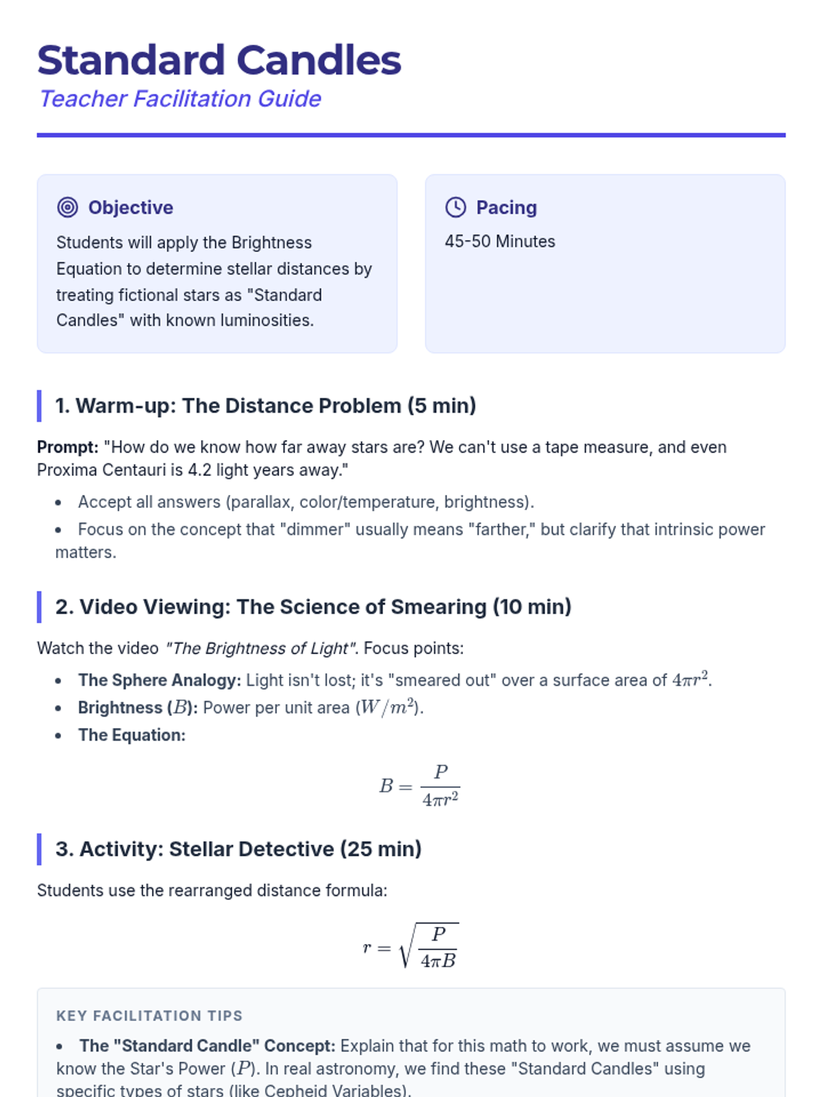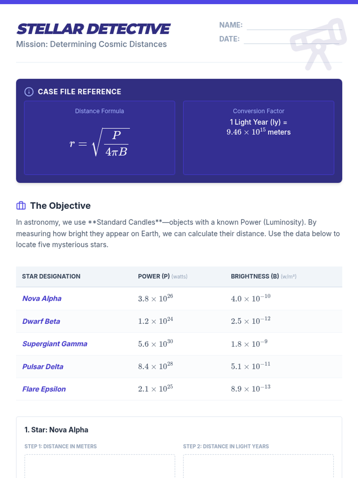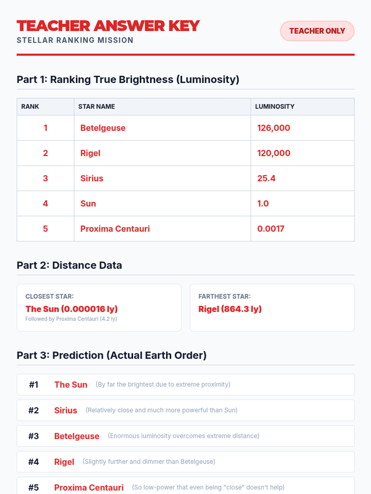 Students will investigate the concepts of luminosity (true brightness) and apparent brightness by analyzing data for five real stars. Through video analysis and a hands-on data ranking activity, they will understand how both intrinsic power and distance influence how we perceive the stars in our night sky.