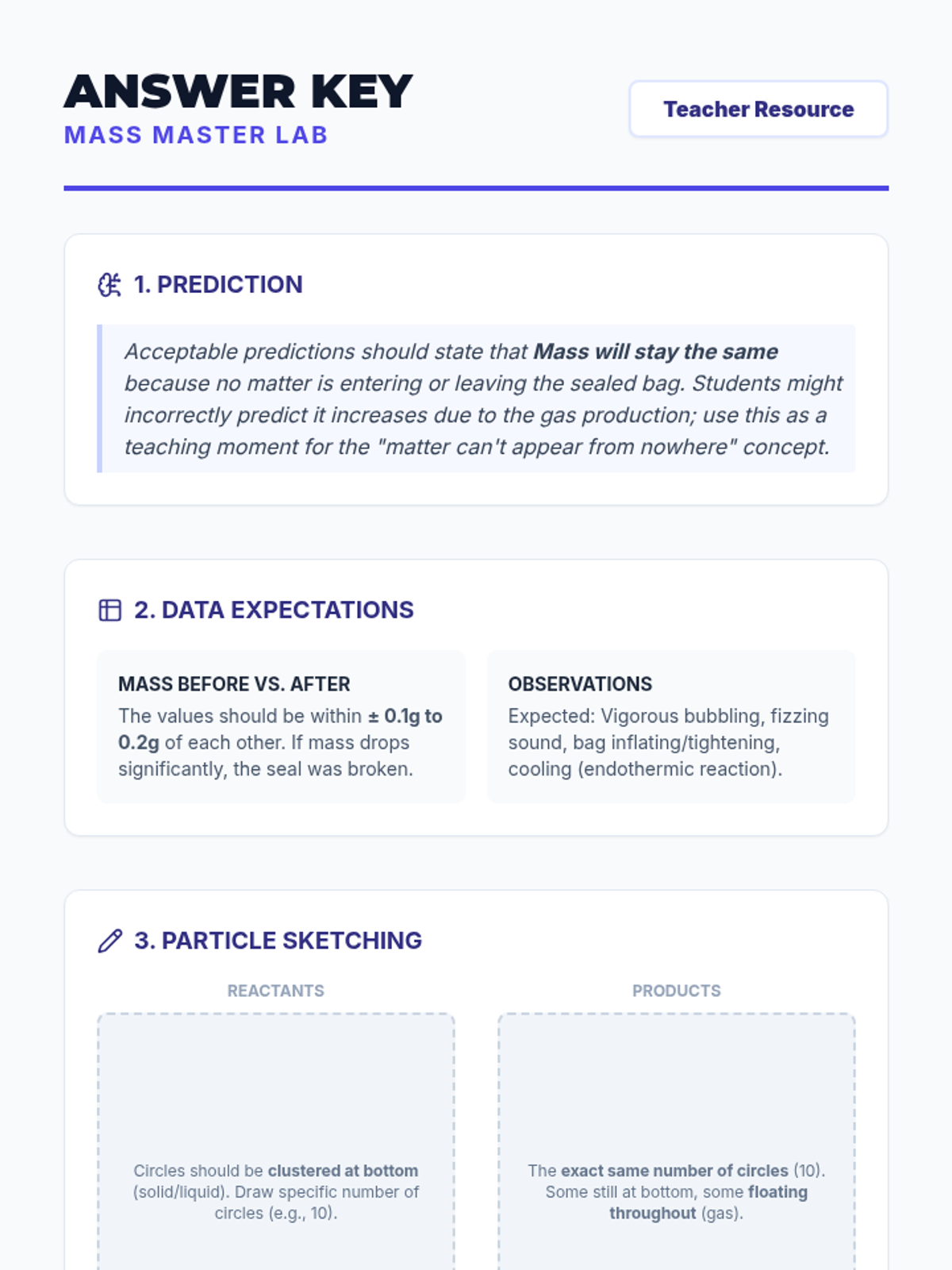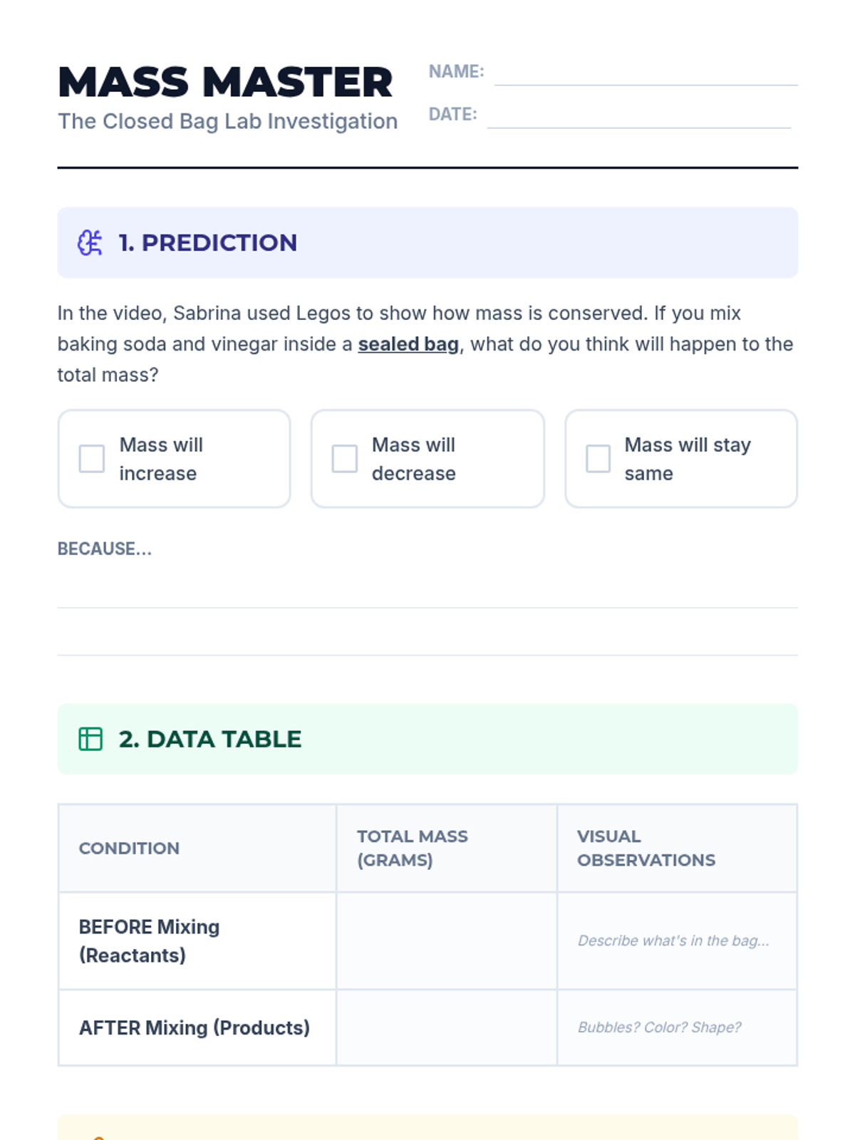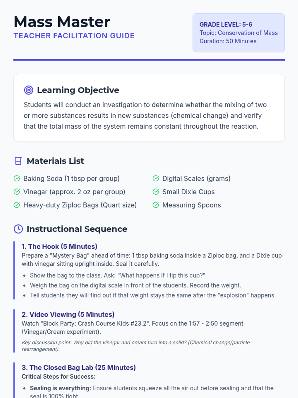 Students investigate the Conservation of Mass through a chemical reaction between baking soda and vinegar in a sealed system. They observe particle rearrangement, identify reactants and products, and verify that mass remains constant even when a gas is produced.