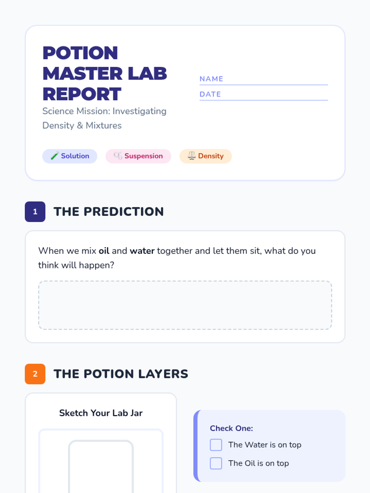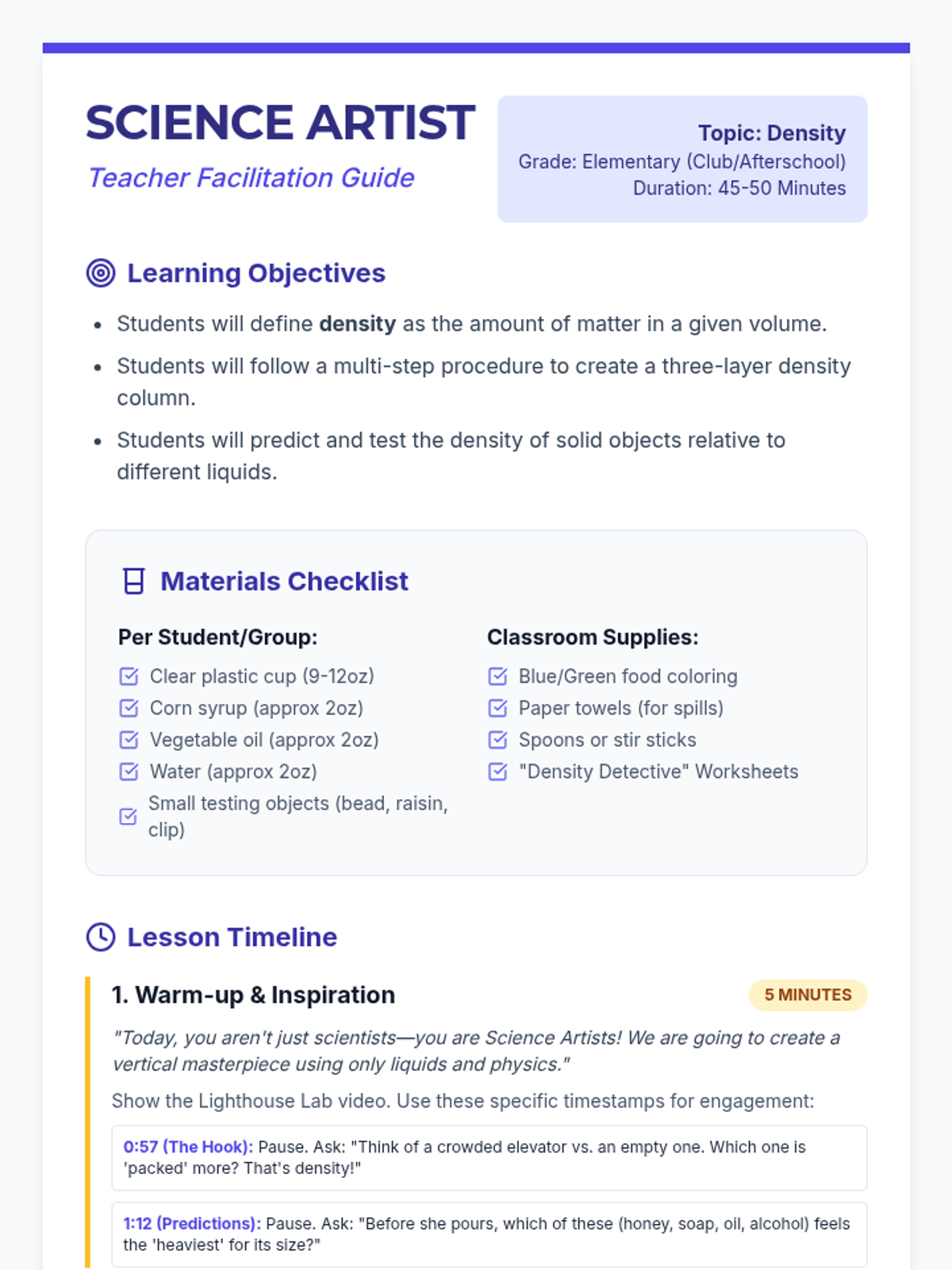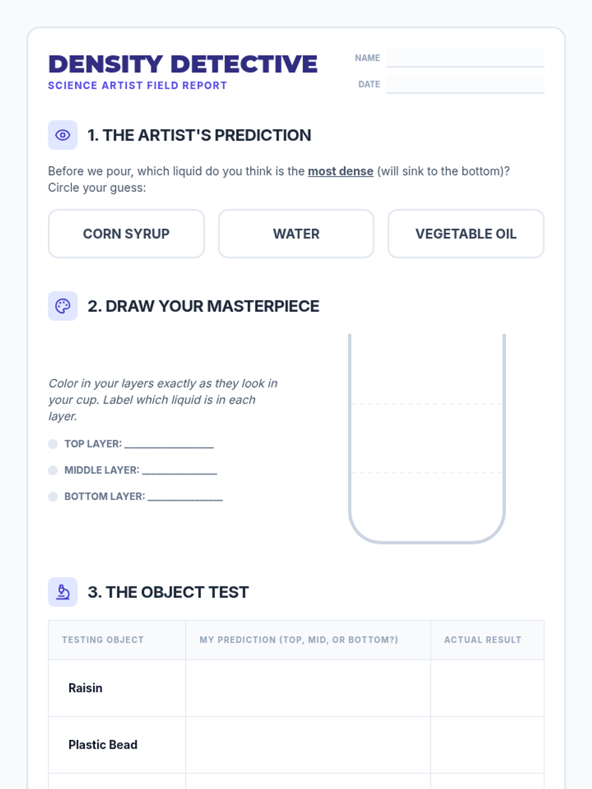 A hands-on science and art lesson where students create a three-layer density column and test how various objects interact with the layers. This lesson uses a 'Science Artist' theme to engage elementary students in the concepts of matter, volume, and density.
