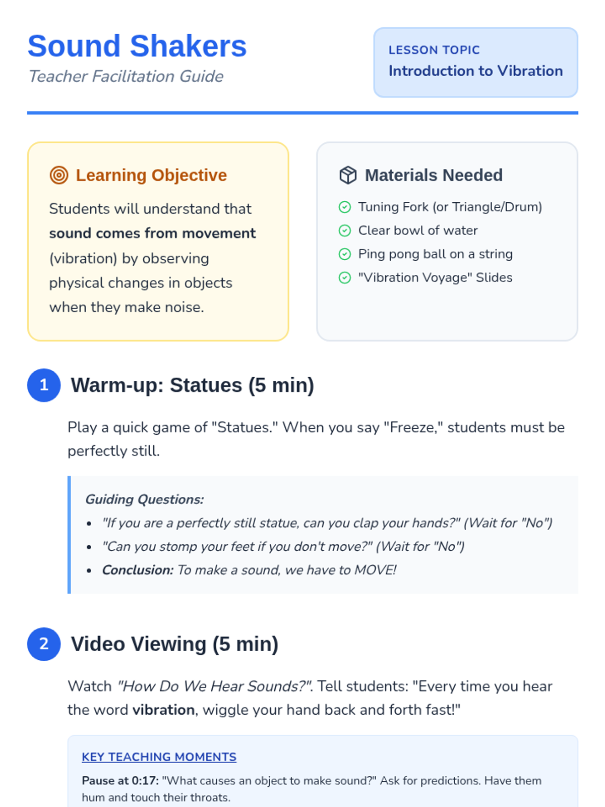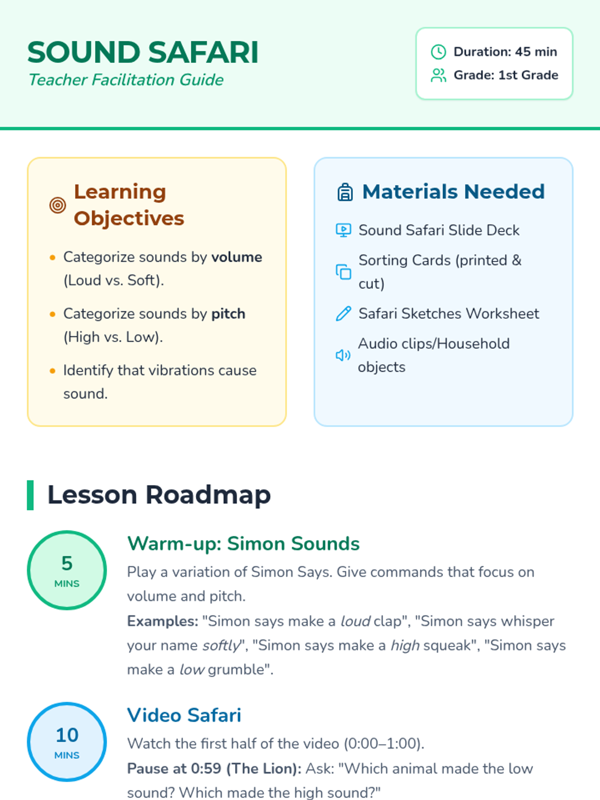 A fun, interactive introduction to the properties of sound—volume and pitch—using a jungle safari theme. Students will explore sounds through games, video, and a hands-on 'Sound Safari' activity.