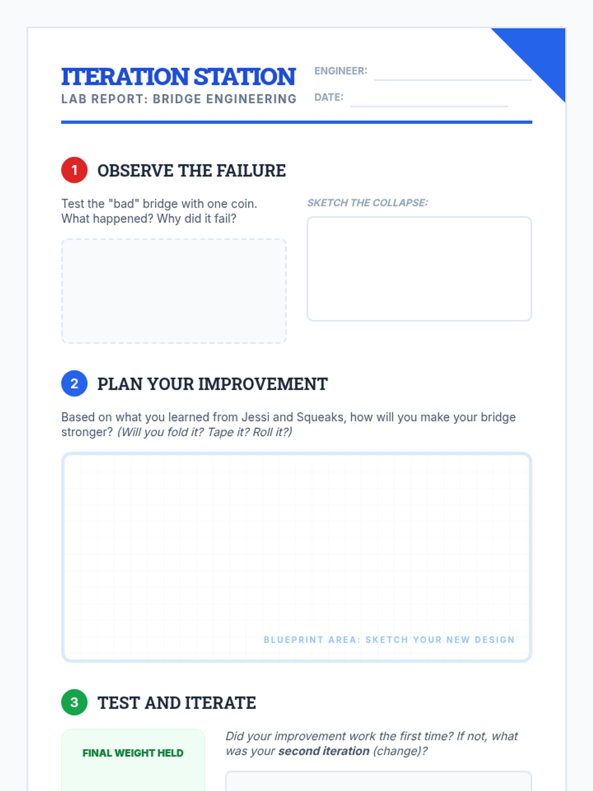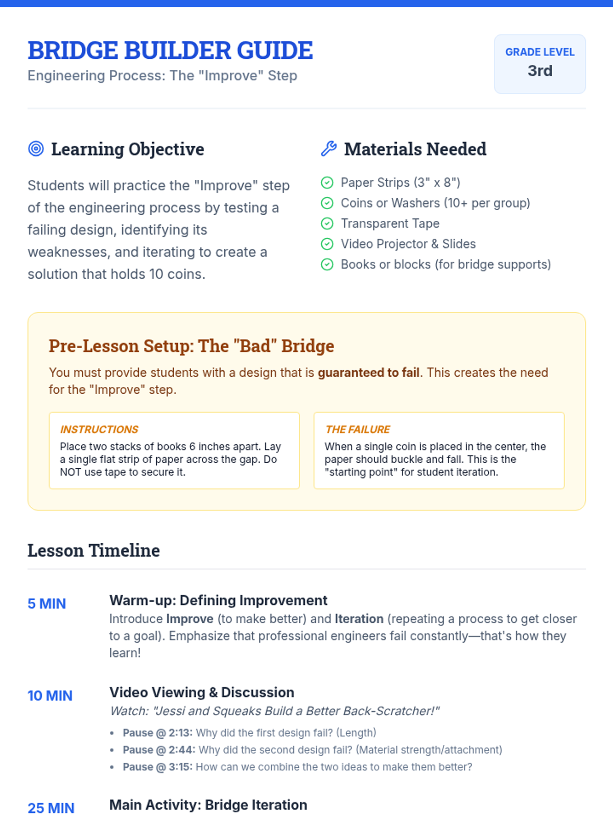 Students explore the 'Improve' step of the engineering process by watching a video demonstration and iterating on a 'failed' paper bridge design to make it hold more weight.