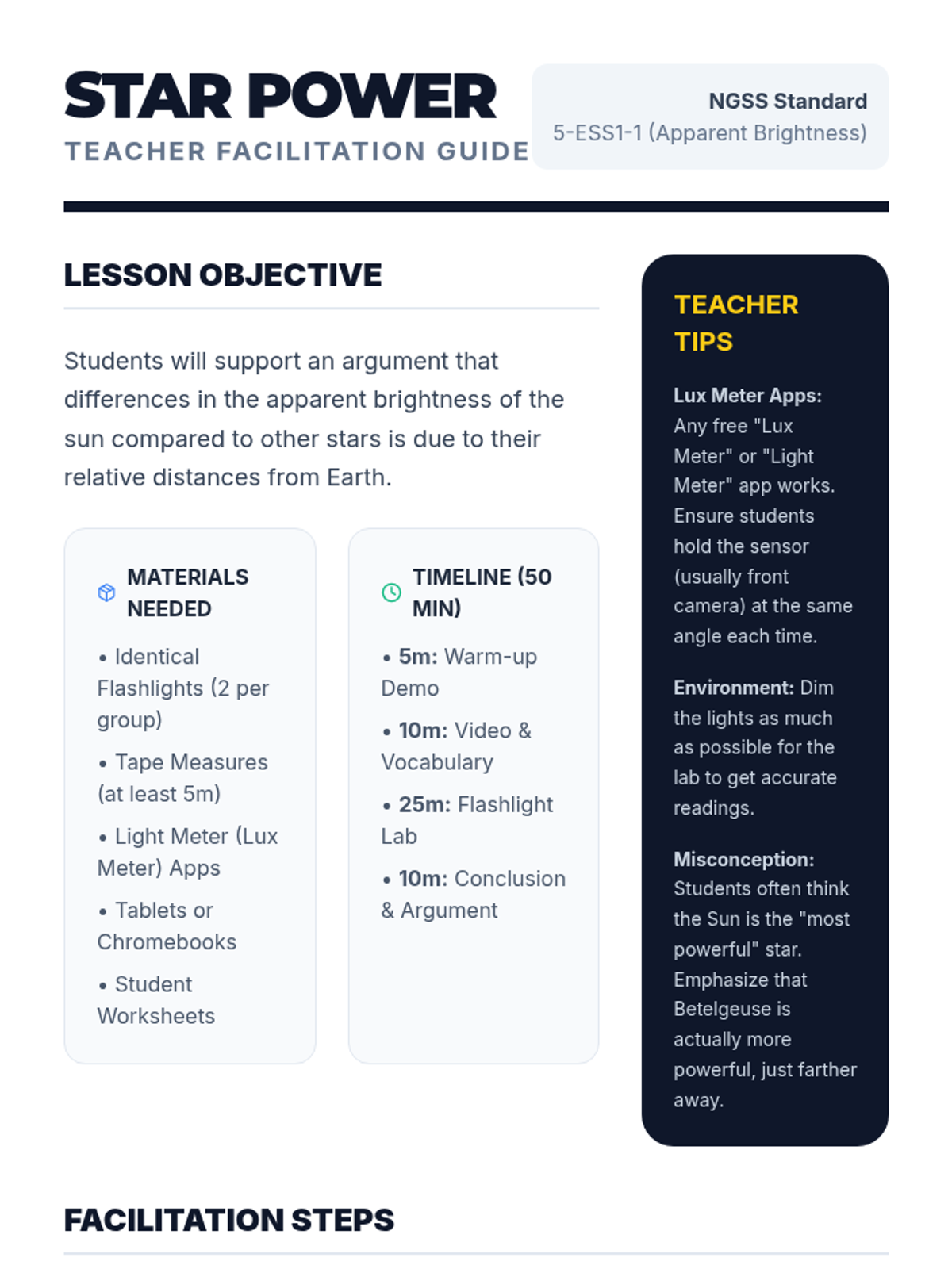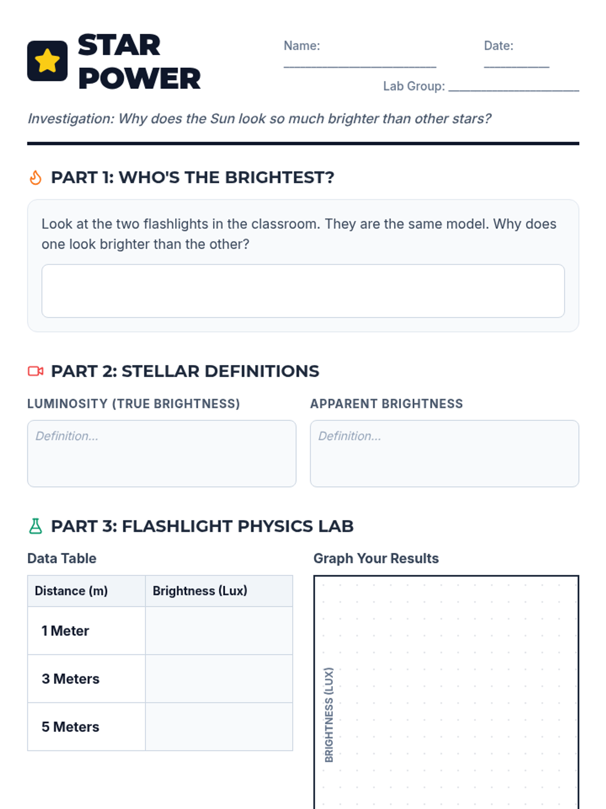 A 5th-grade science lesson exploring why the Sun appears brighter than distant, more powerful stars. Students use a flashlight lab to investigate the relationship between distance and apparent brightness.