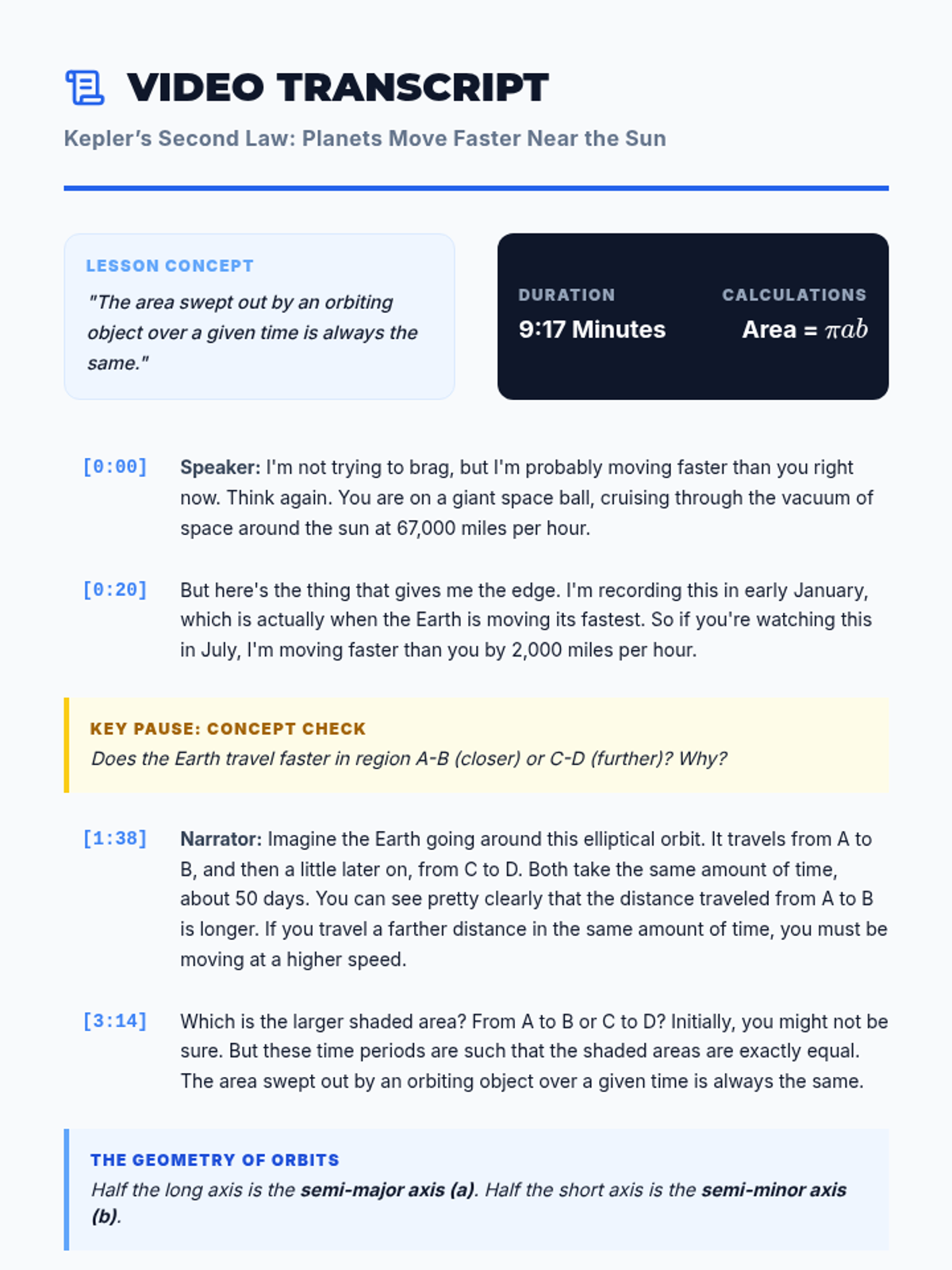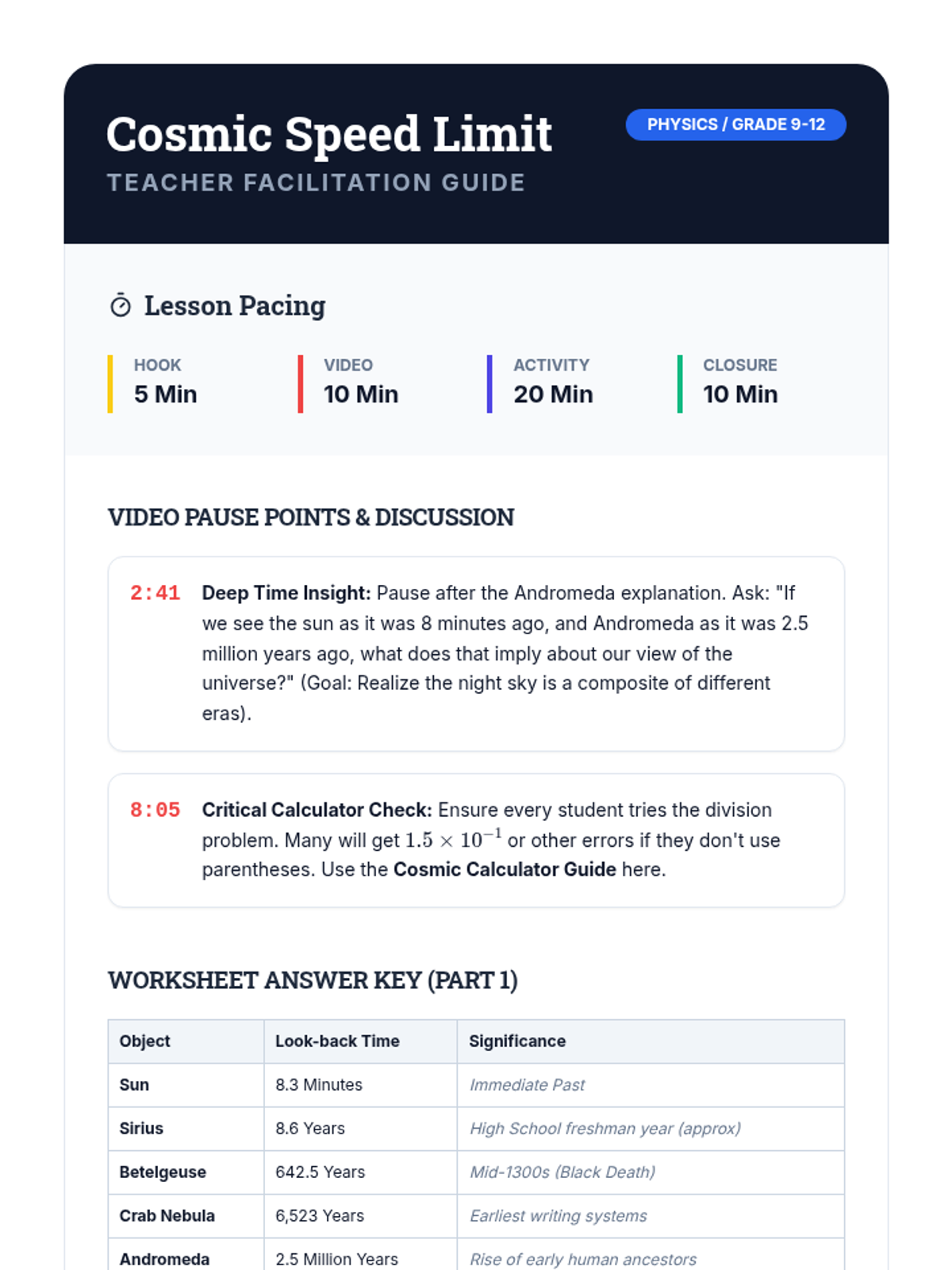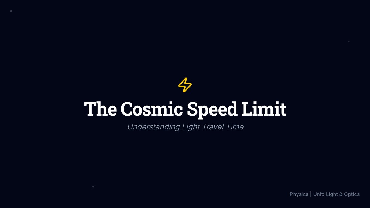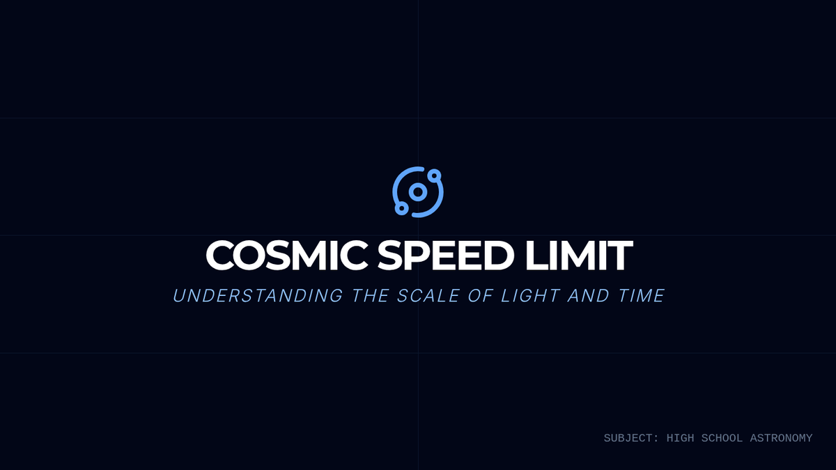 A high school physics lesson exploring the finite speed of light, its role as a cosmic speed limit, and the profound implication that looking into space is looking back in time.