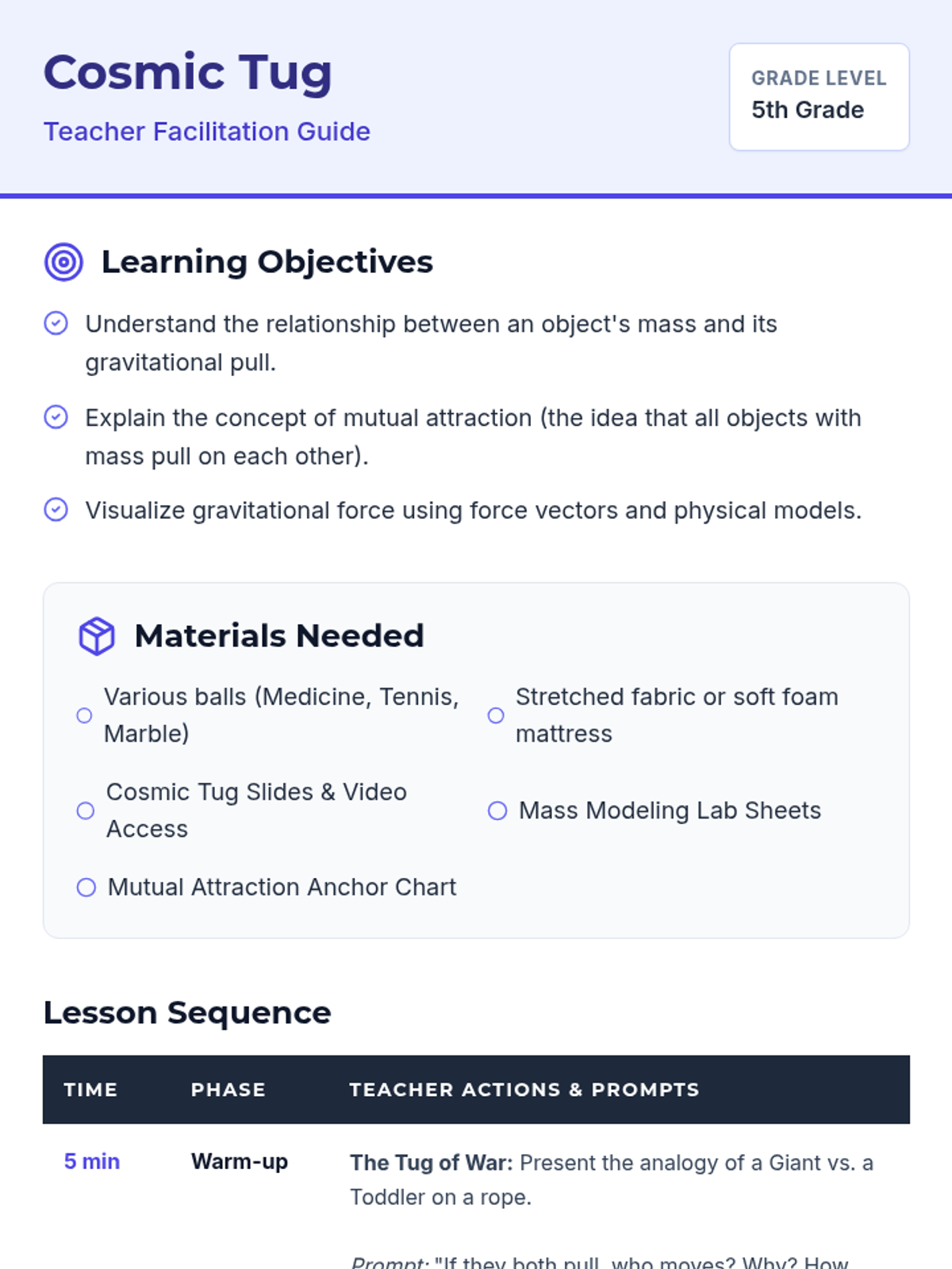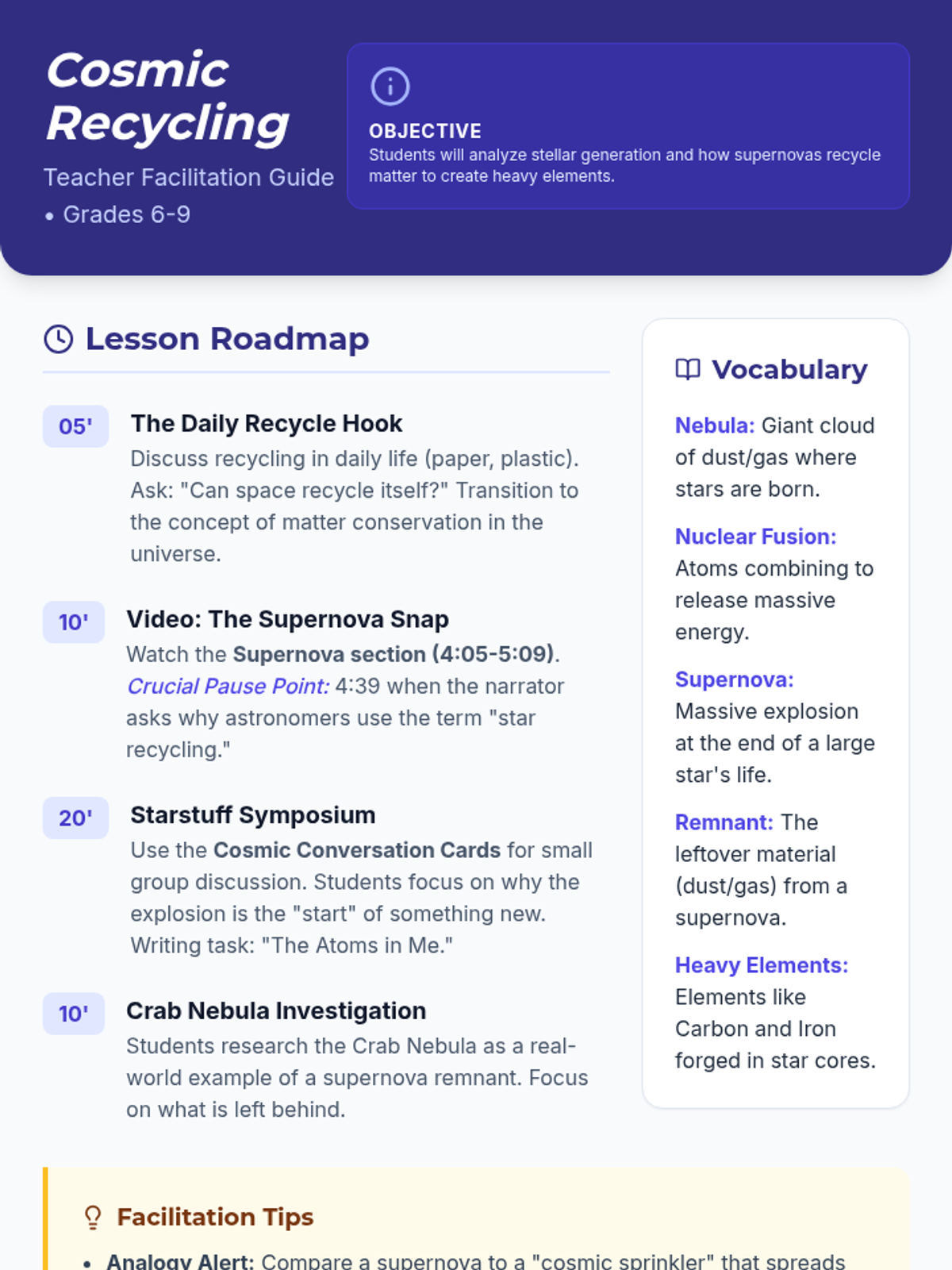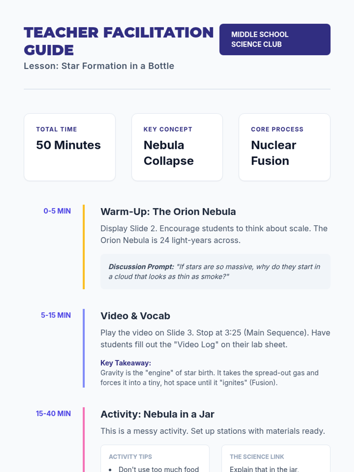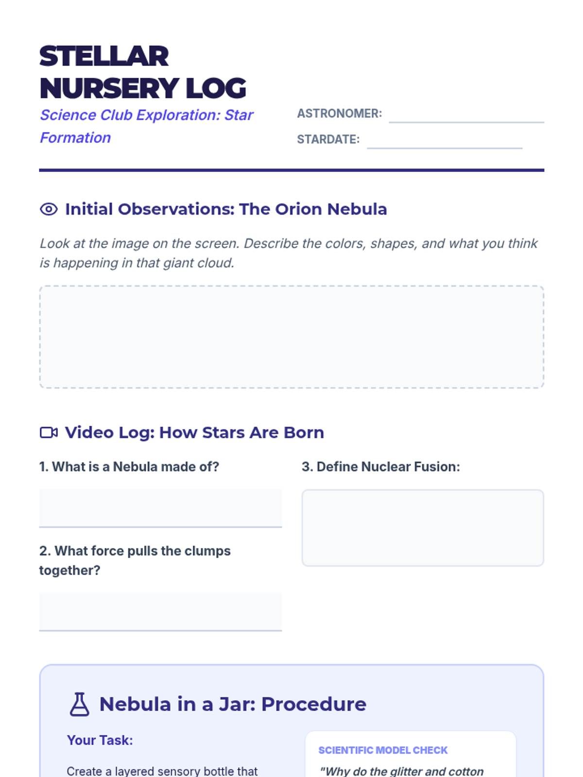 Students explore the birth of stars by creating a 'Nebula in a Jar' sensory bottle, modeling how gravity pulls interstellar dust and gas together to form protostars. The lesson includes a video on the stellar lifecycle and a research activity on astronomical misnomers.