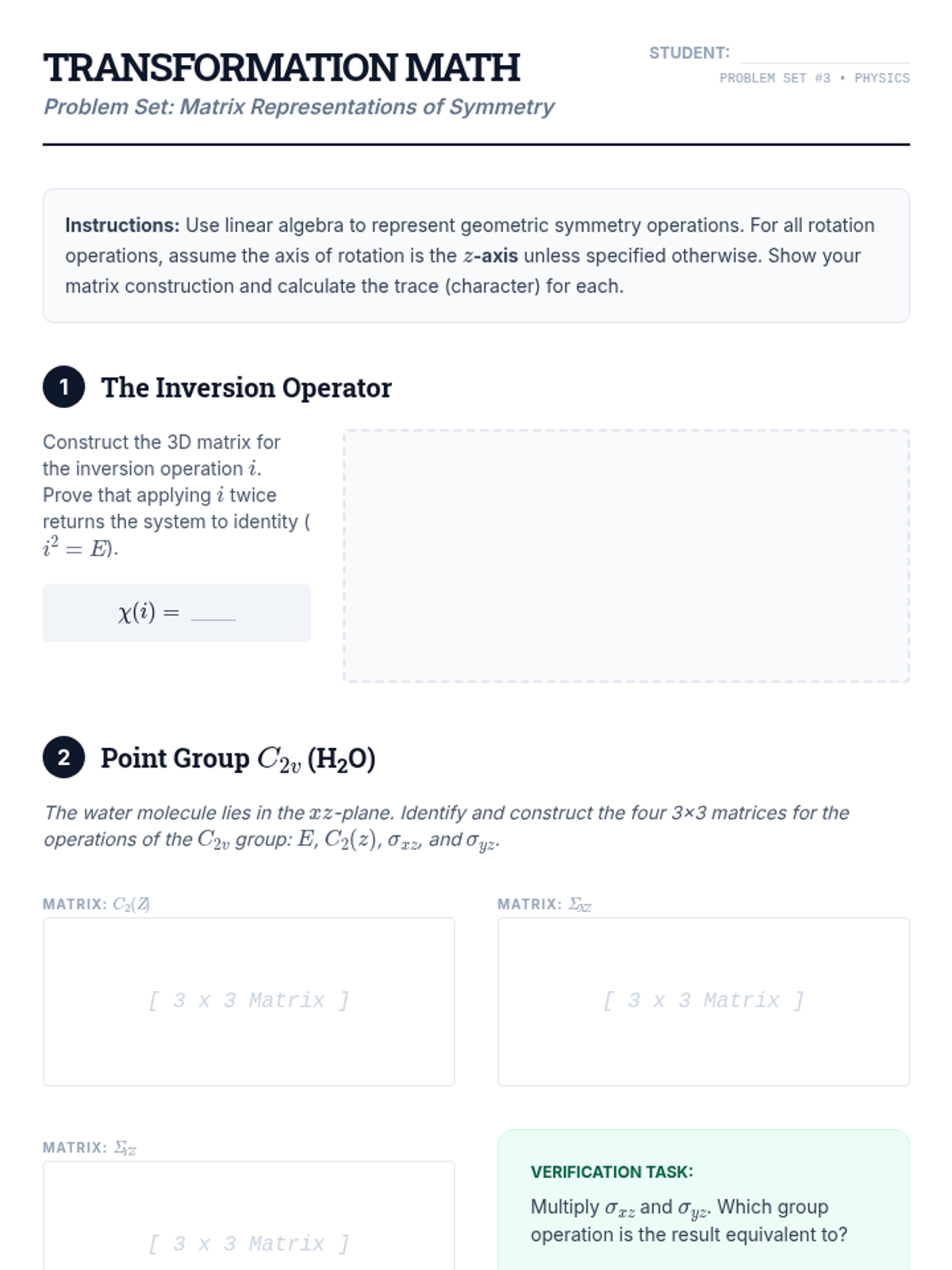 Students translate geometric operations into linear algebra, creating transformation matrices for rotations and reflections and bridging visual understanding with computational formalism.