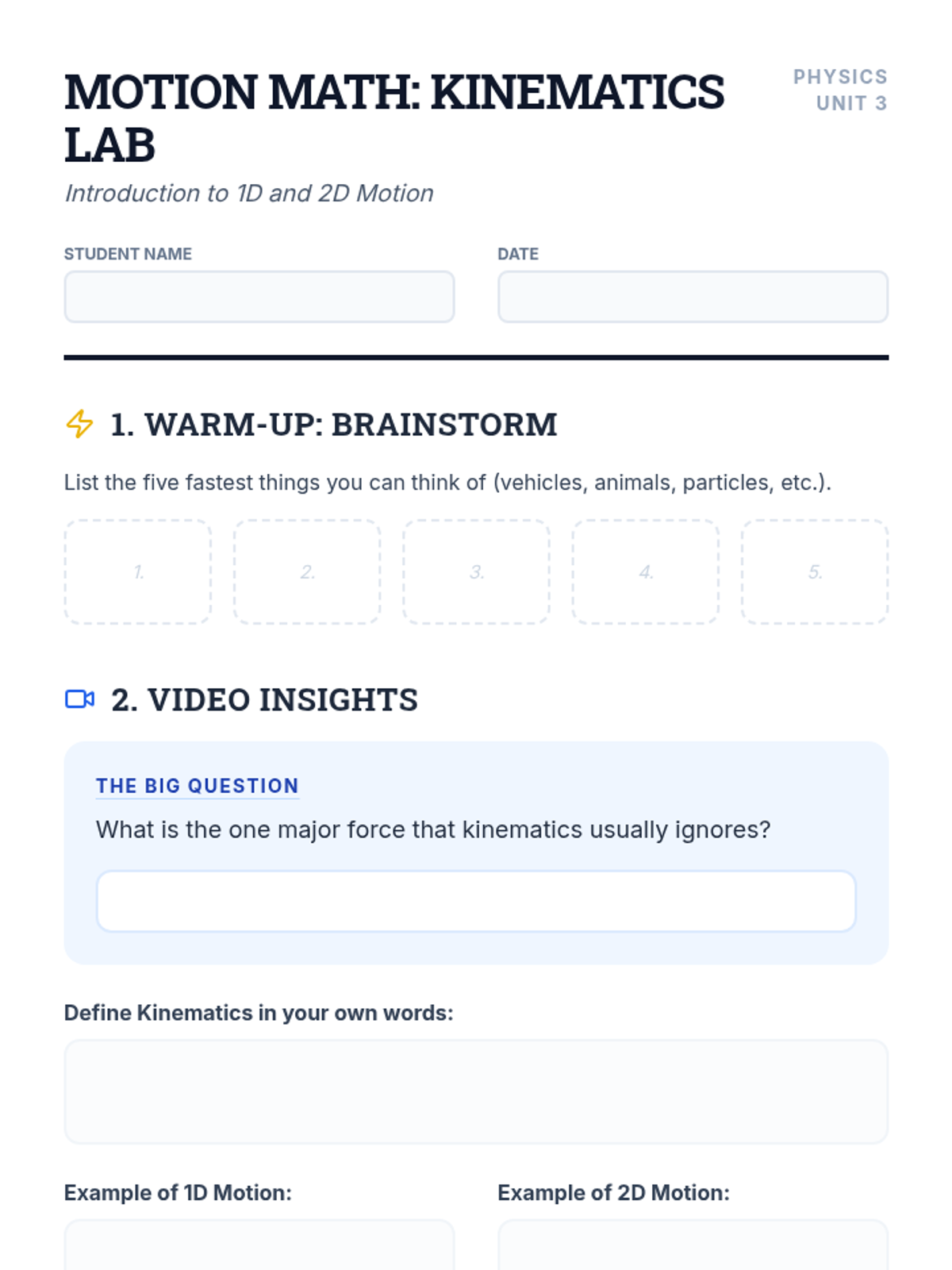 An introductory physics lesson defining kinematics and exploring the transition from 1D to 2D motion through physical activity and video analysis.
