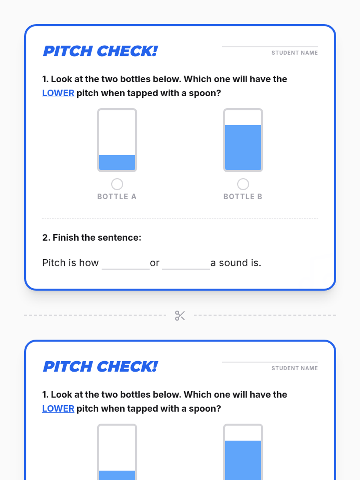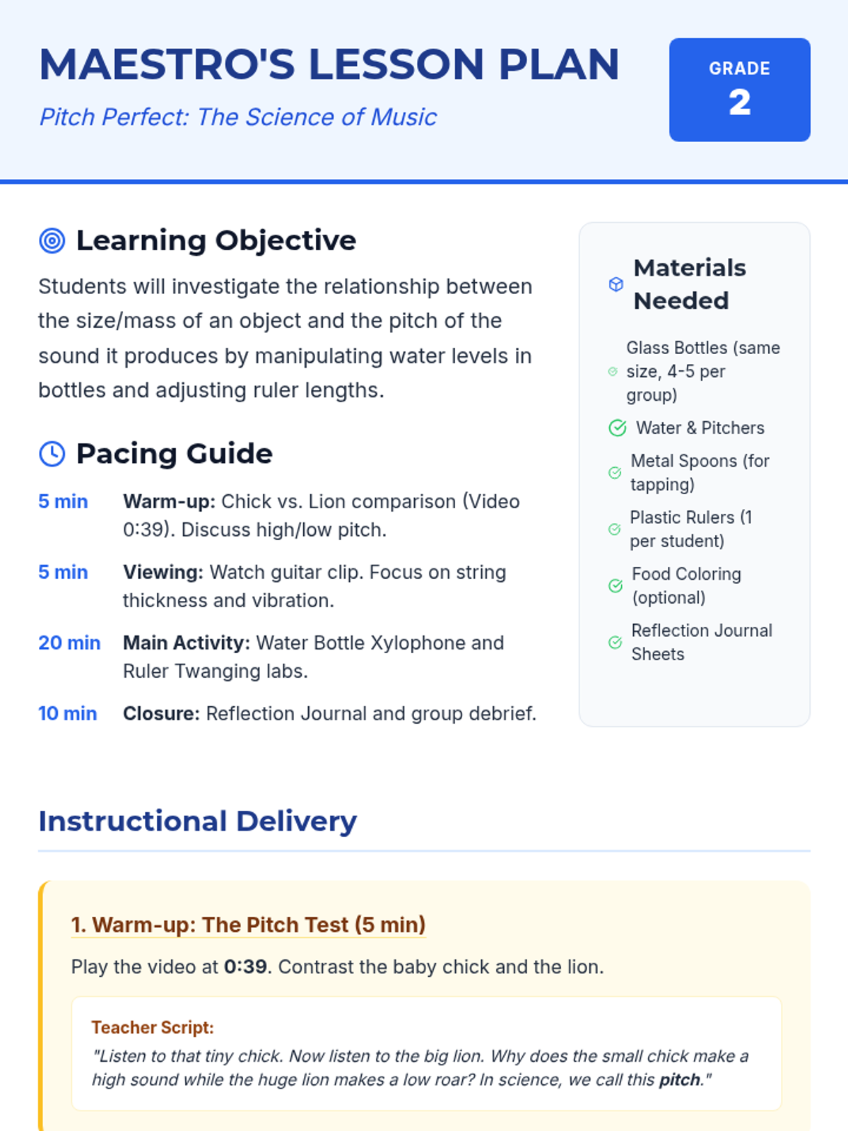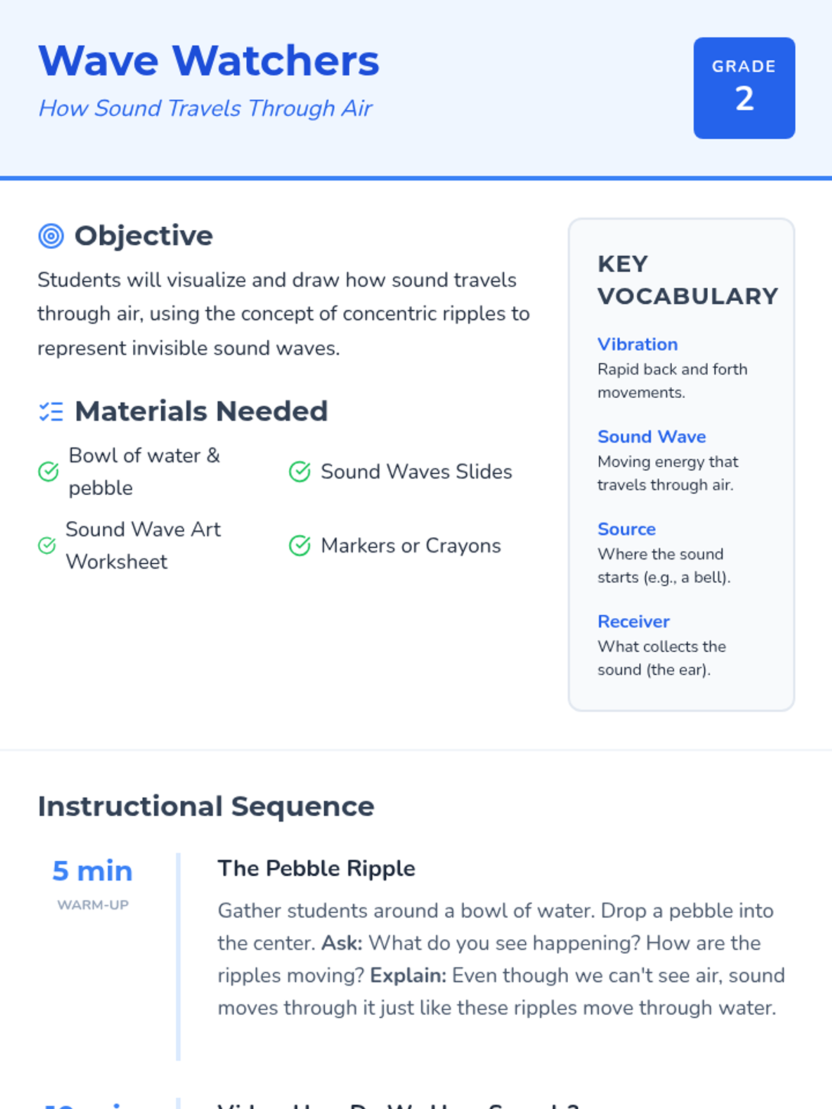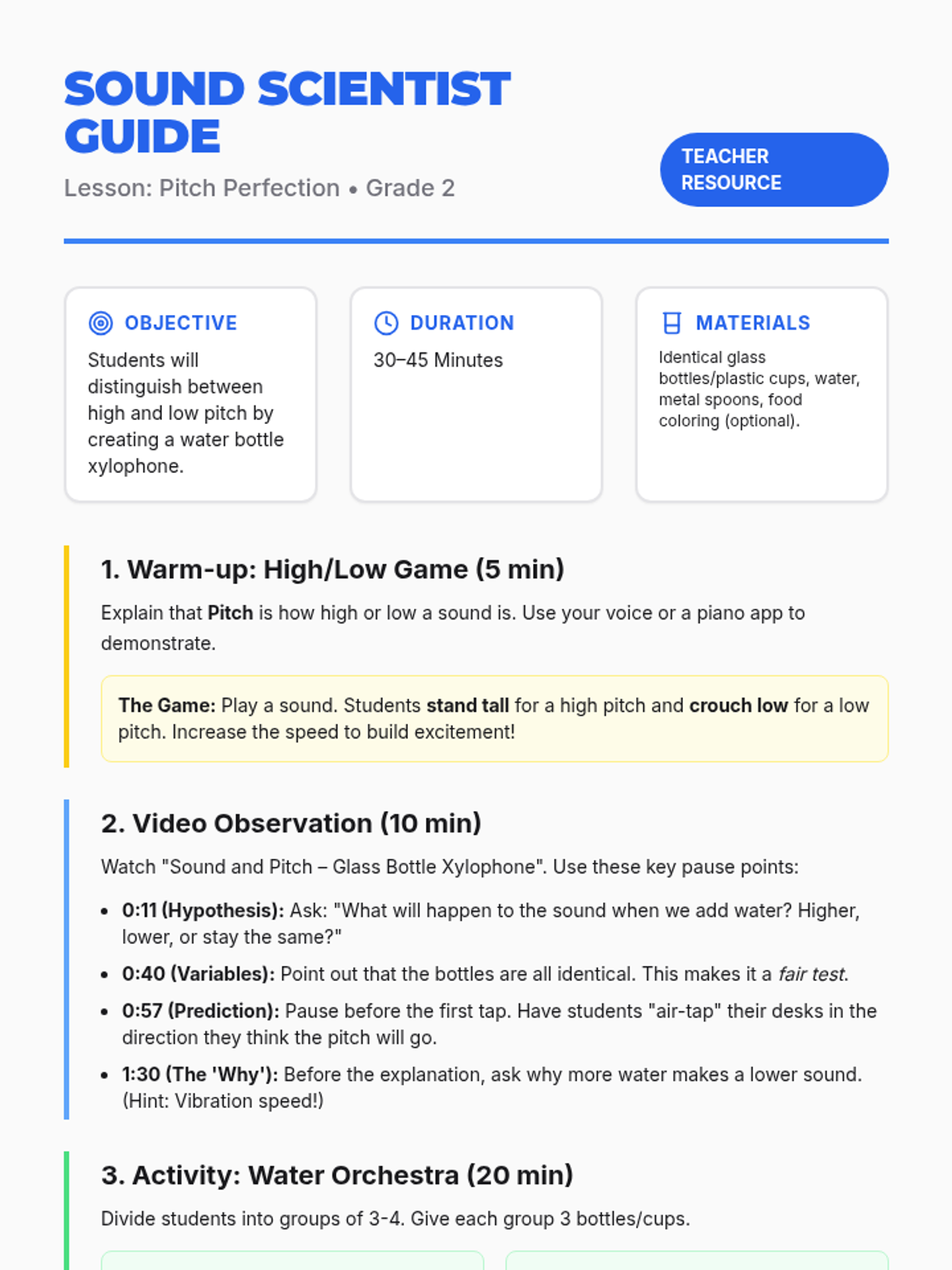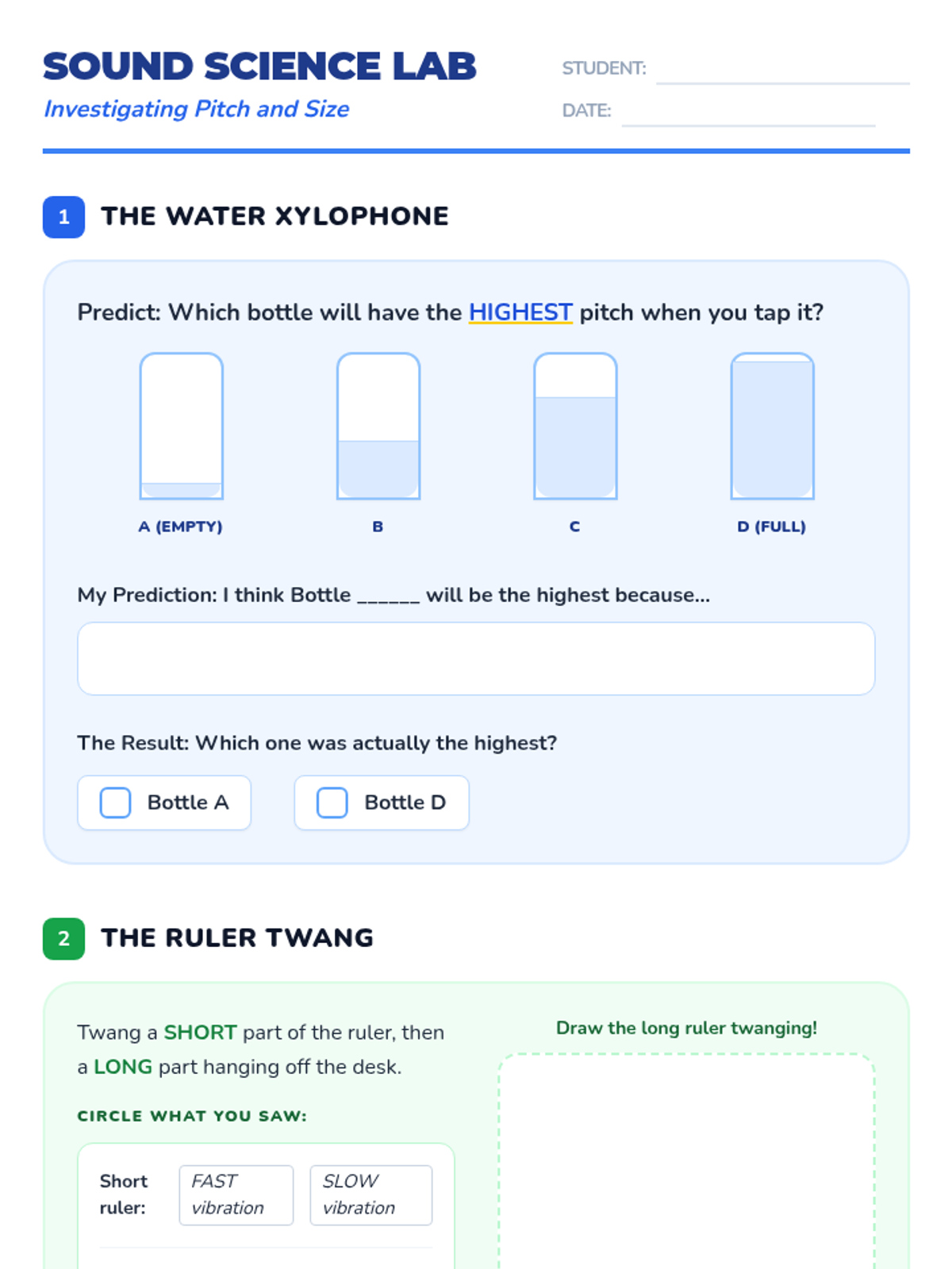 A 2nd-grade science lesson exploring the relationship between vibration, size, and pitch through hands-on experiments with water bottles and rulers. Students will watch a video on sound waves and apply their knowledge to create a musical 'xylophone'.
