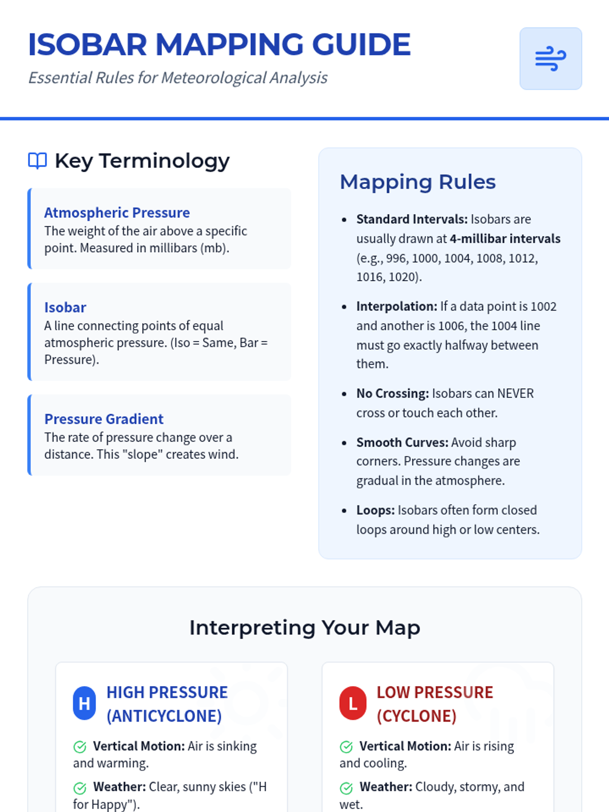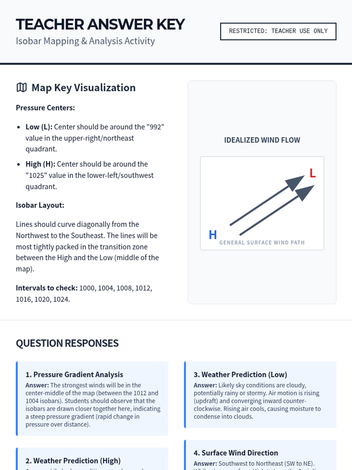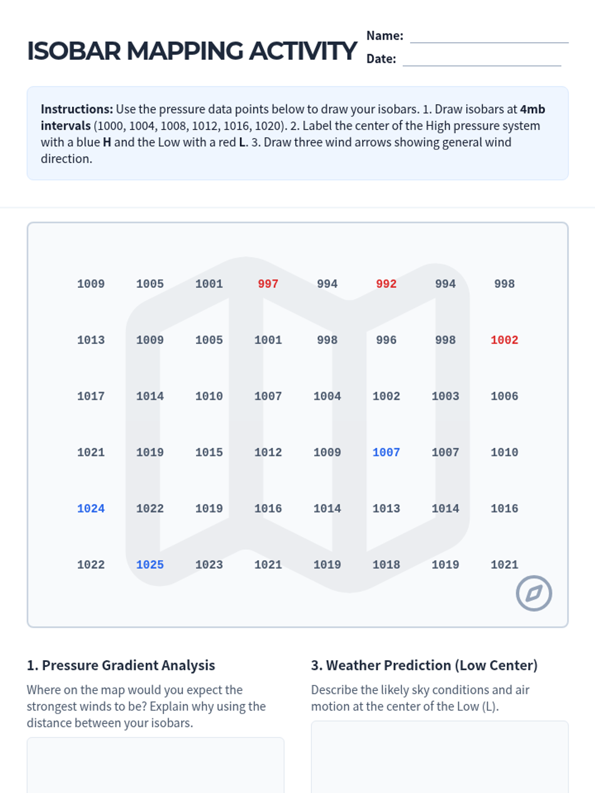 A comprehensive lesson for high school students on atmospheric pressure, wind formation, and weather patterns. Students learn to map isobars using raw data and predict weather outcomes based on pressure systems.