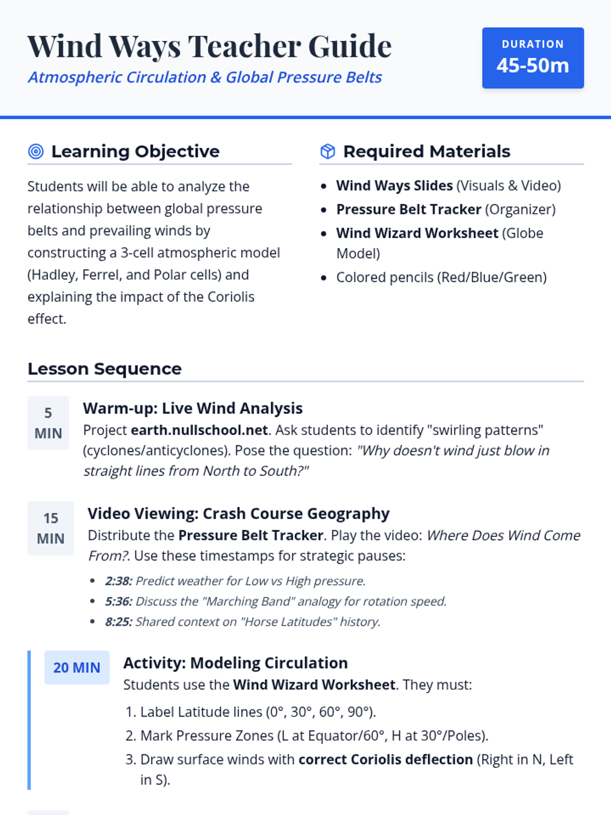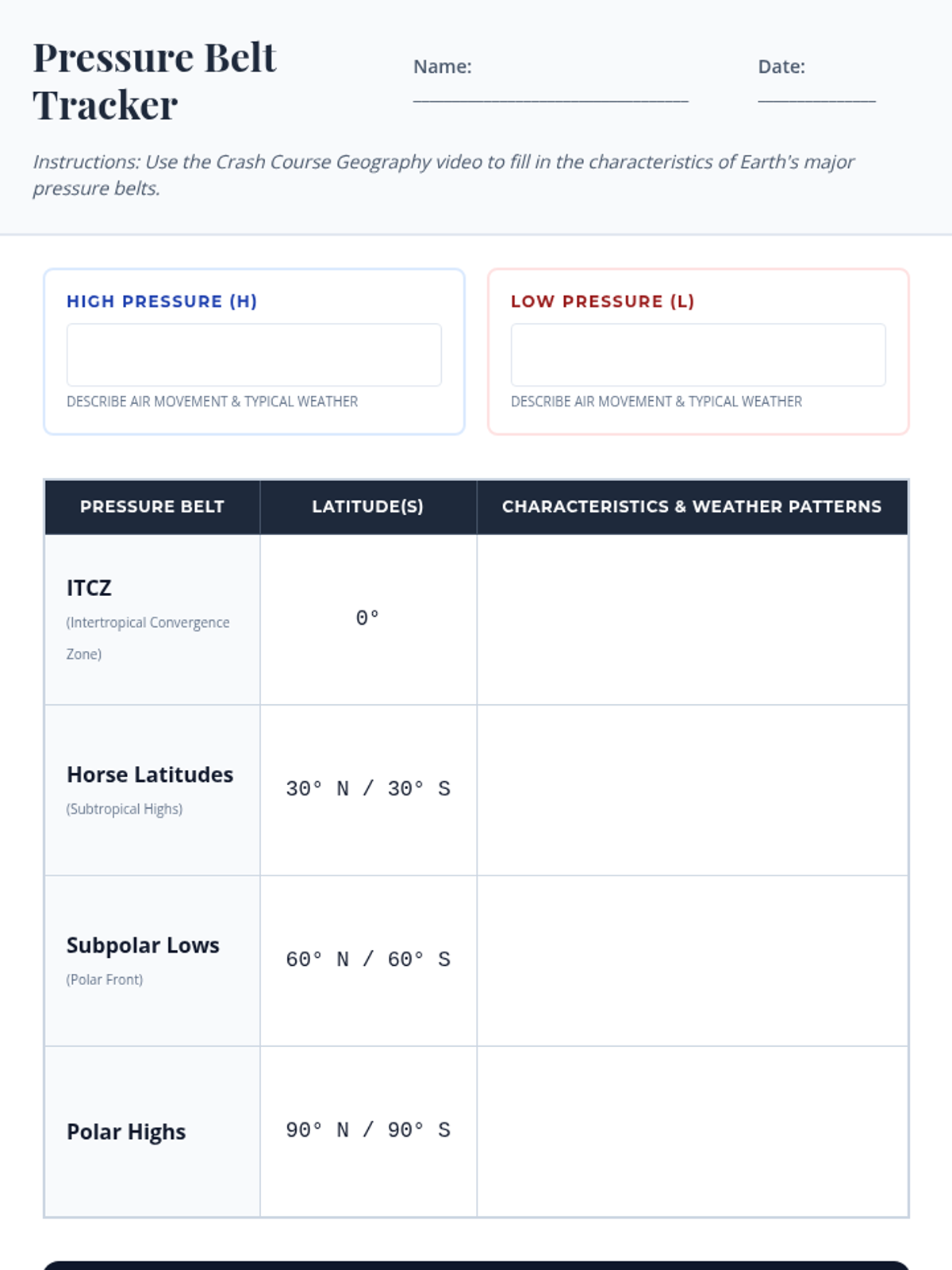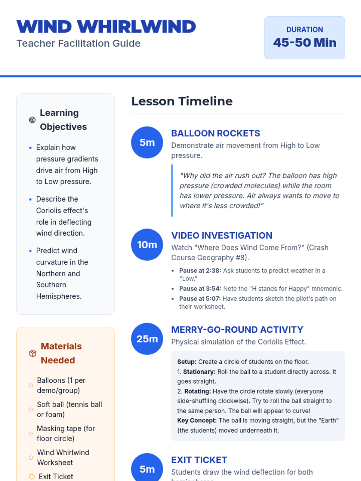 A comprehensive lesson for high school students on atmospheric pressure, wind formation, and weather patterns. Students learn to map isobars using raw data and predict weather outcomes based on pressure systems.