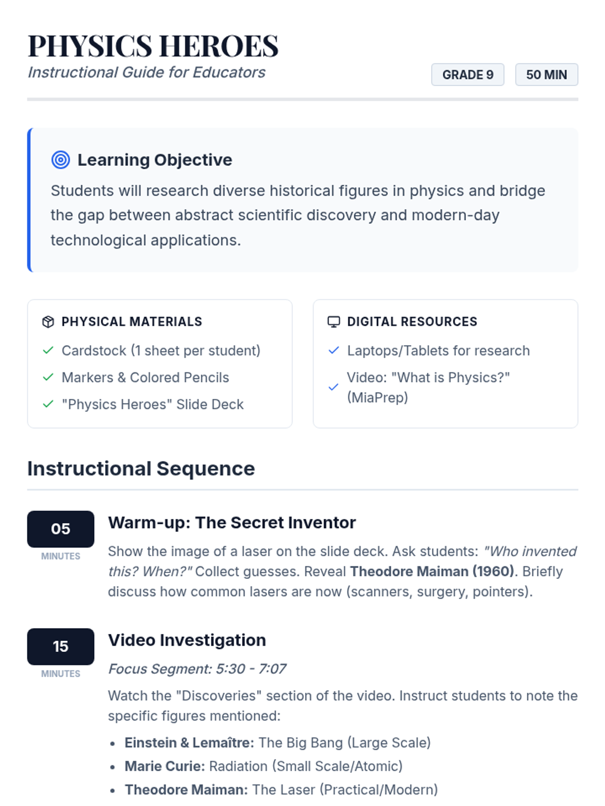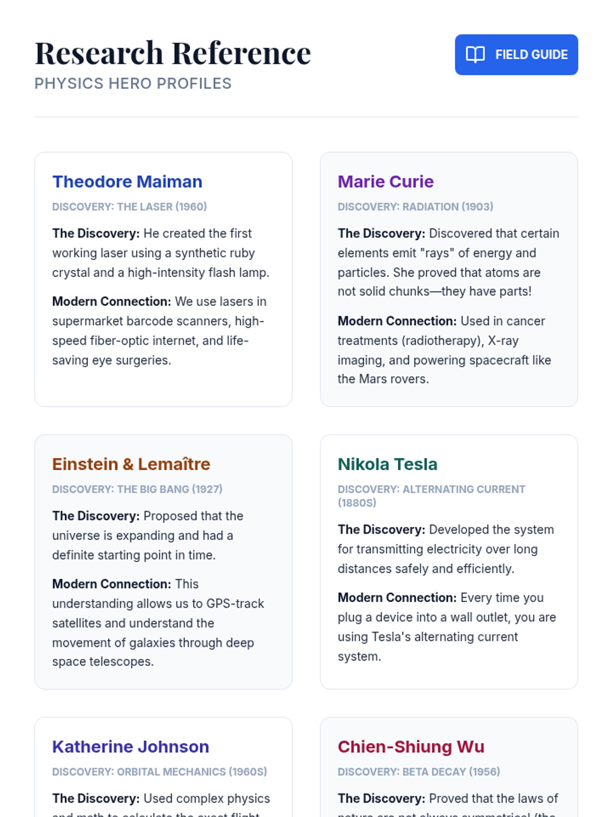 Students explore the impact of diverse historical physicists by researching their discoveries and connecting them to modern-day technology through a creative trading card activity.
