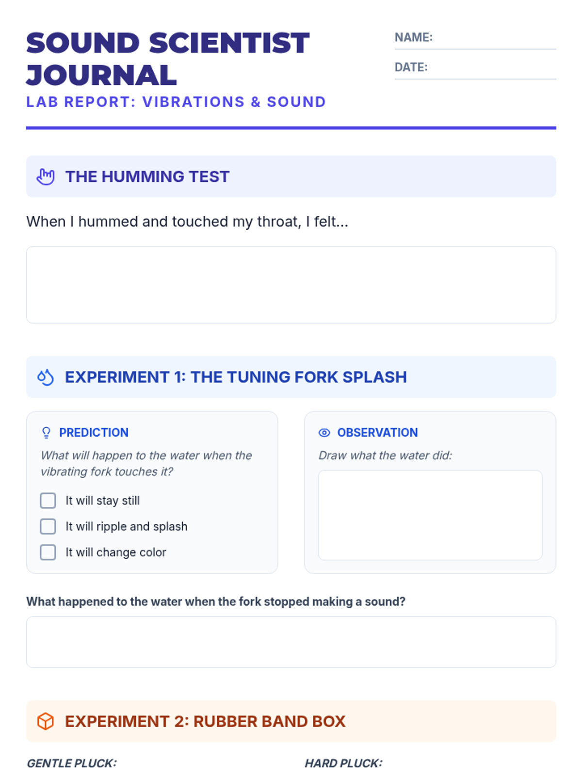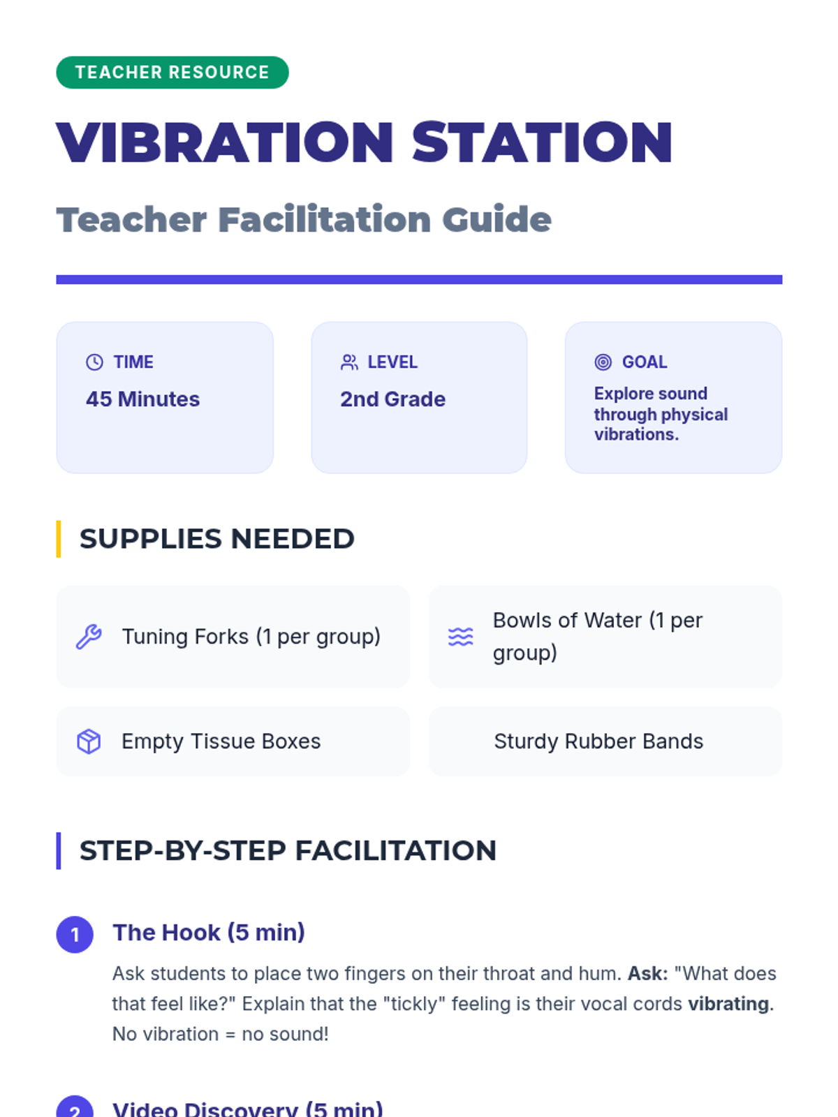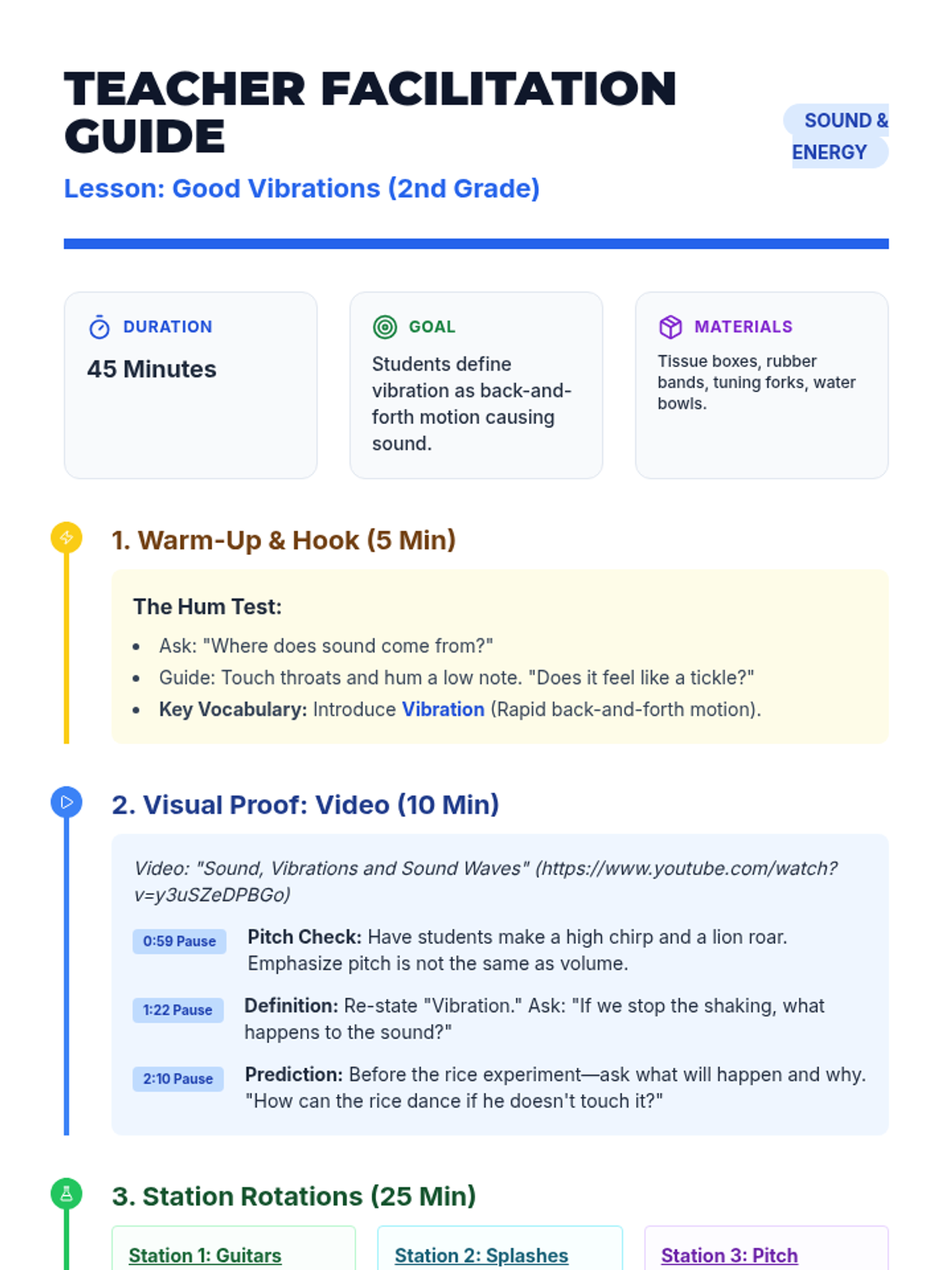 An interactive 2nd-grade lesson exploring how sound is created by vibrations through body humming, instrument building, and water experiments. Students observe 'invisible' energy using rubber bands and tuning forks to connect physical motion to the sounds they hear.