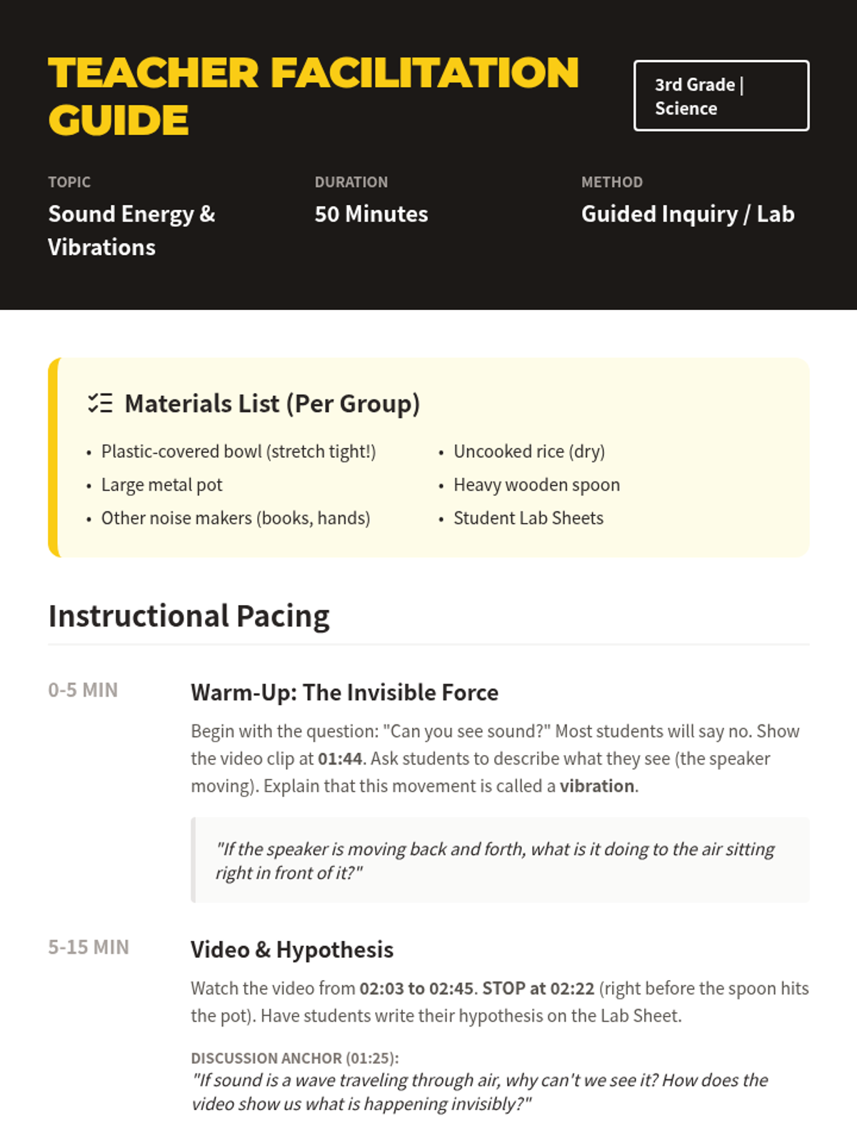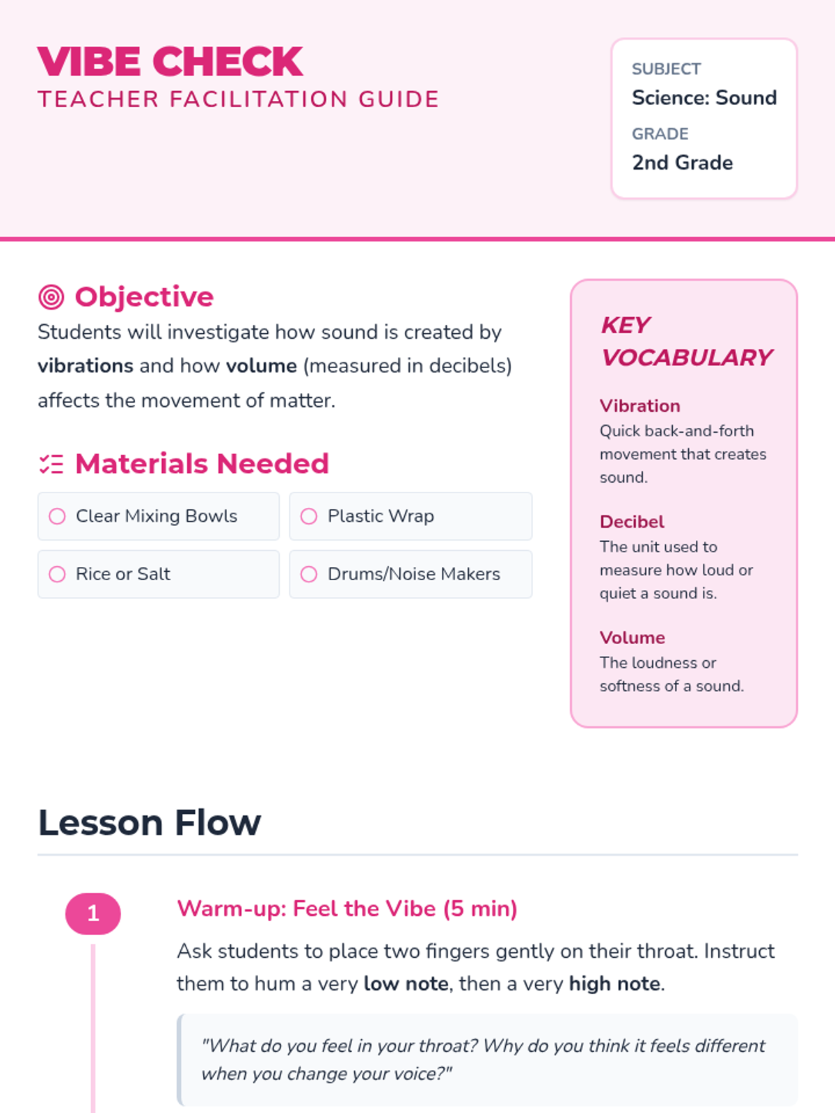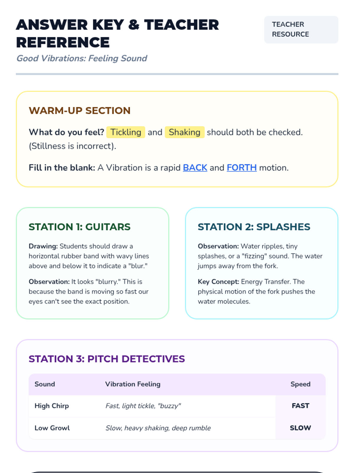 An interactive 2nd-grade lesson exploring how sound is created by vibrations through body humming, instrument building, and water experiments. Students observe 'invisible' energy using rubber bands and tuning forks to connect physical motion to the sounds they hear.