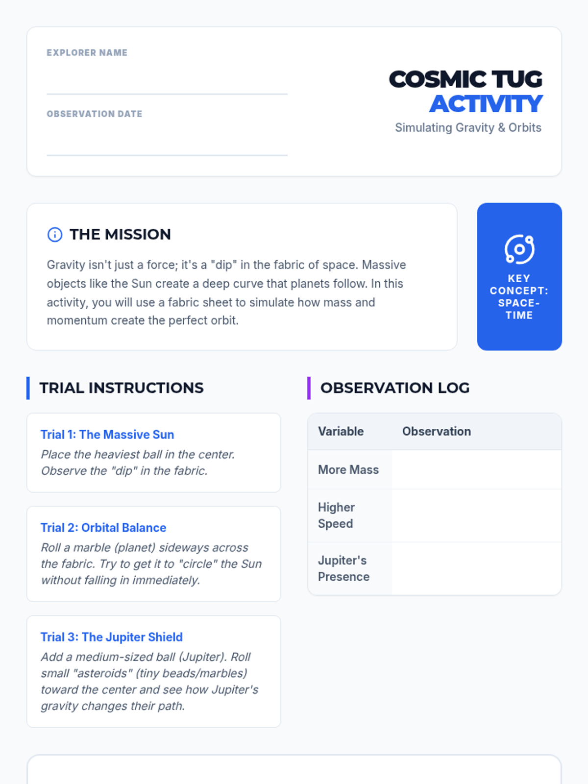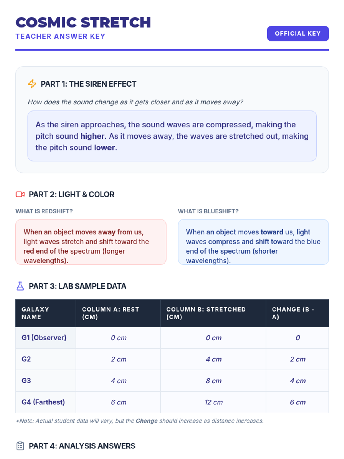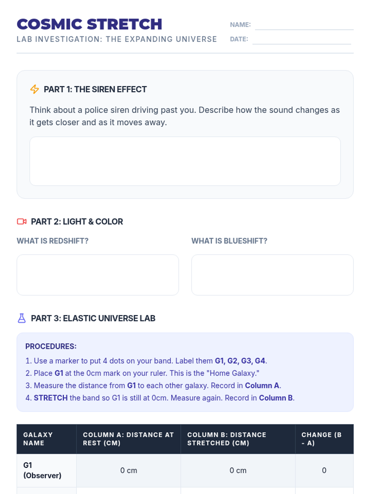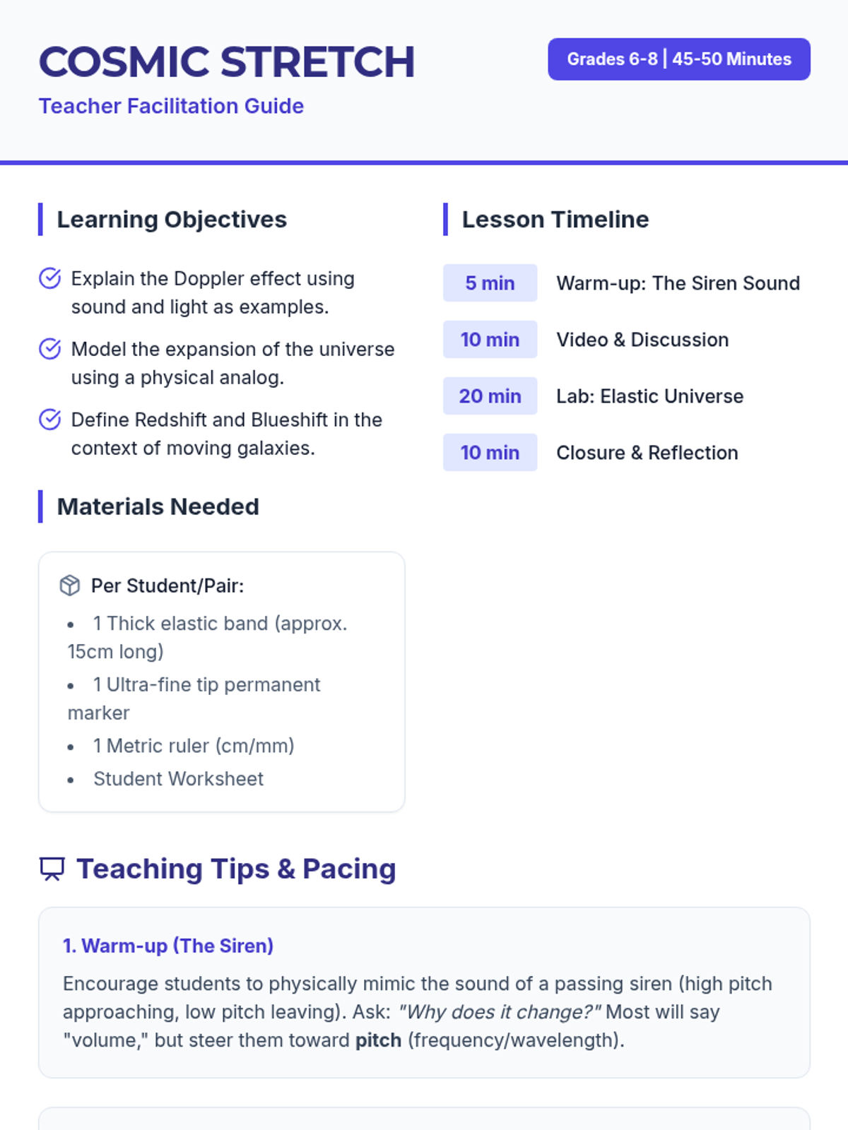 A hands-on exploration of the expanding universe using elastic bands to model redshift and Hubble's Law. Students will connect the Doppler effect to light waves and understand how astronomers use color to map the movement of galaxies.