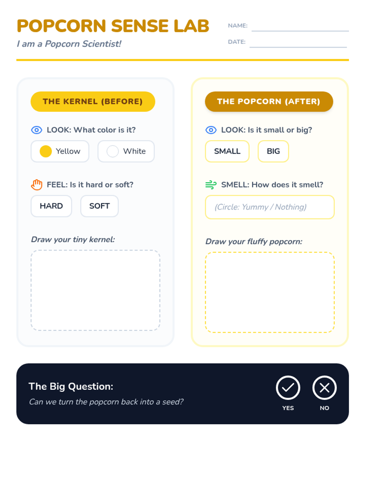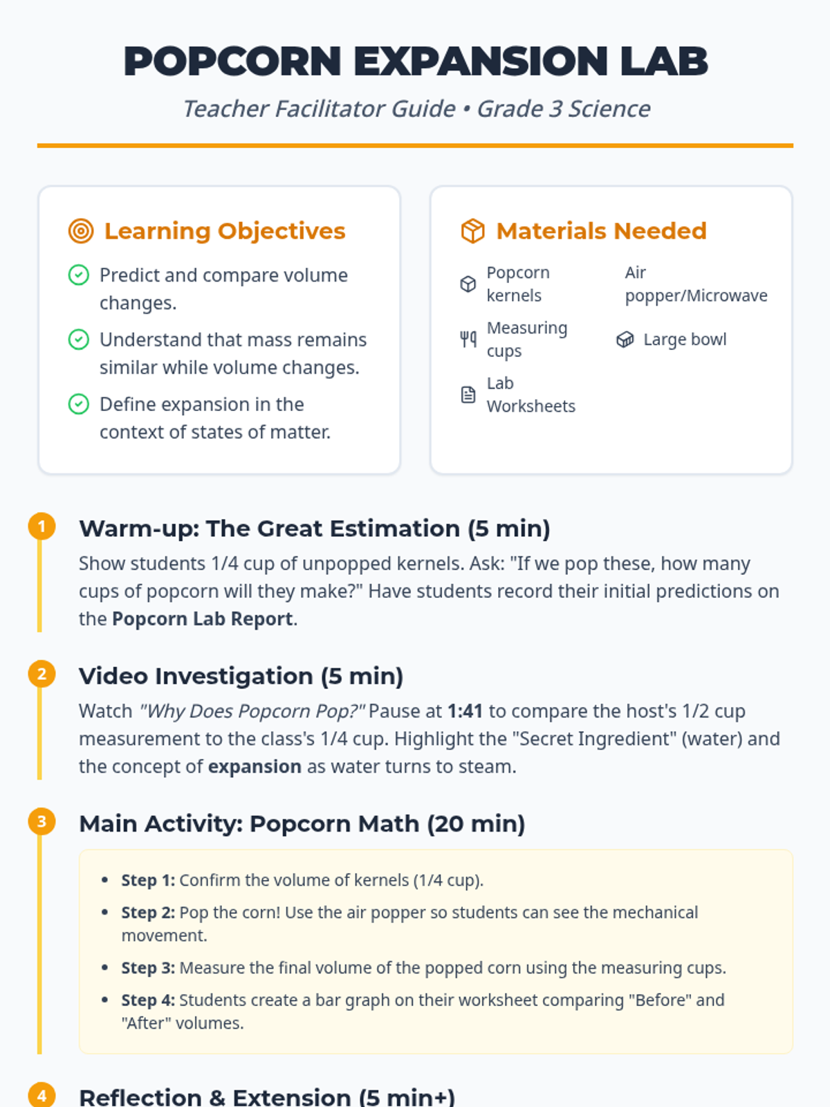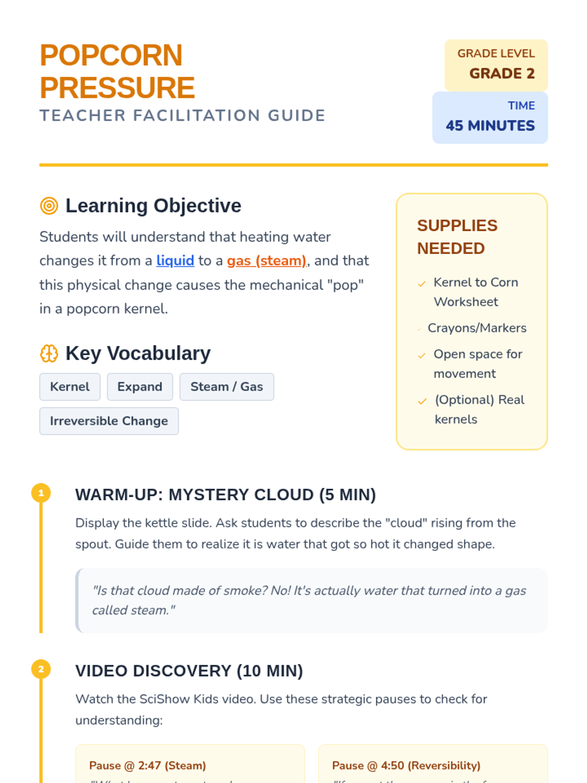 Students explore physical changes by using their five senses to observe the transformation of a hard corn kernel into fluffy popcorn. The lesson includes a video-guided discussion, a sensory lab, and a creative extension project.