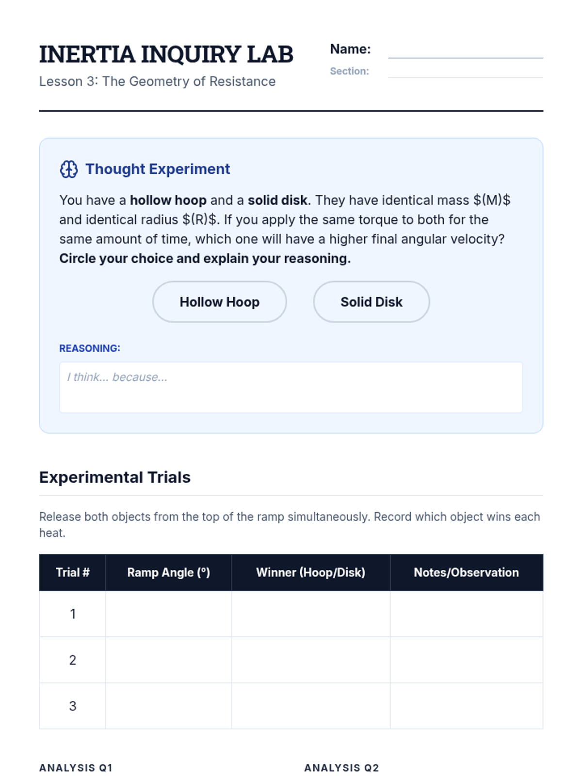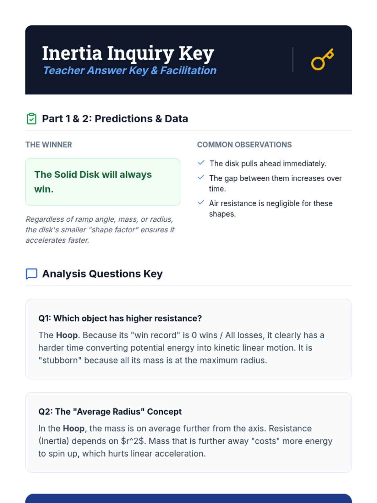 Through inquiry-based exploration, students derive the fundamental differences in rotational inertia between hoops and disks, focusing on mass distribution.
