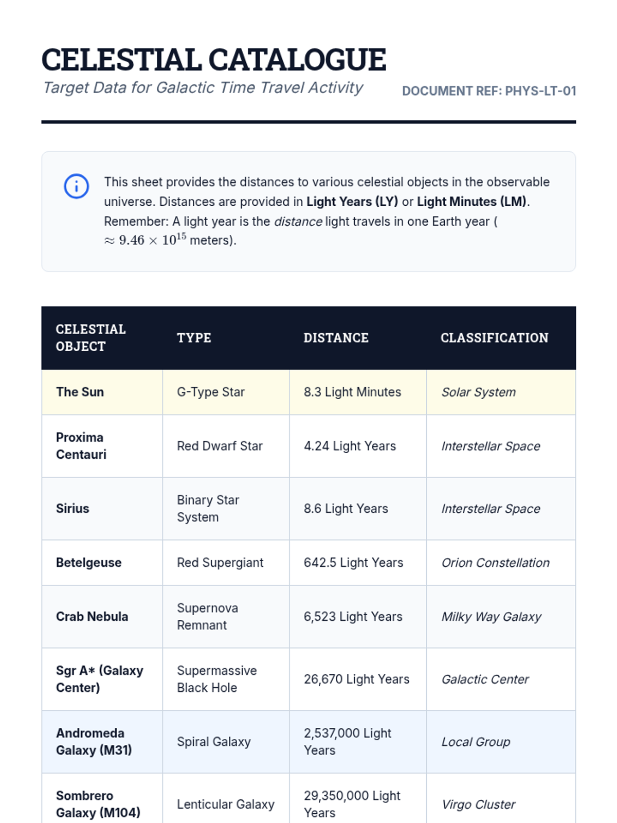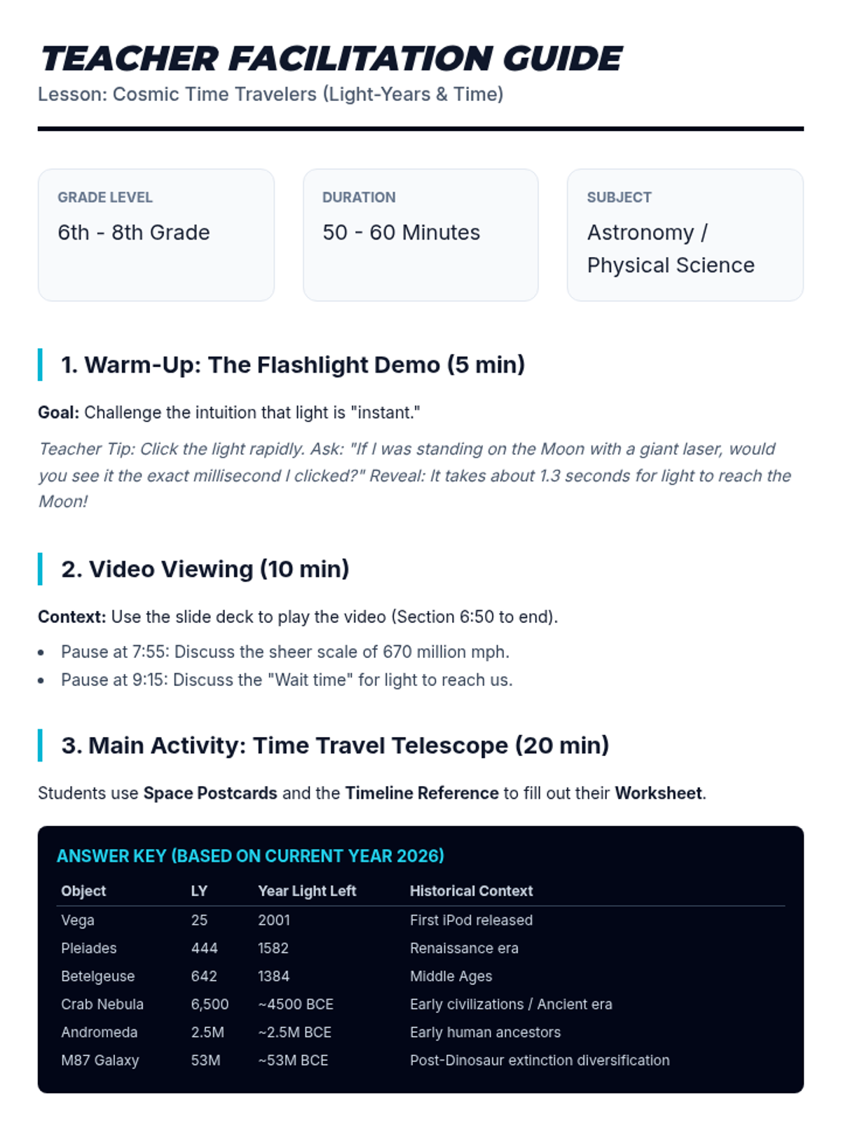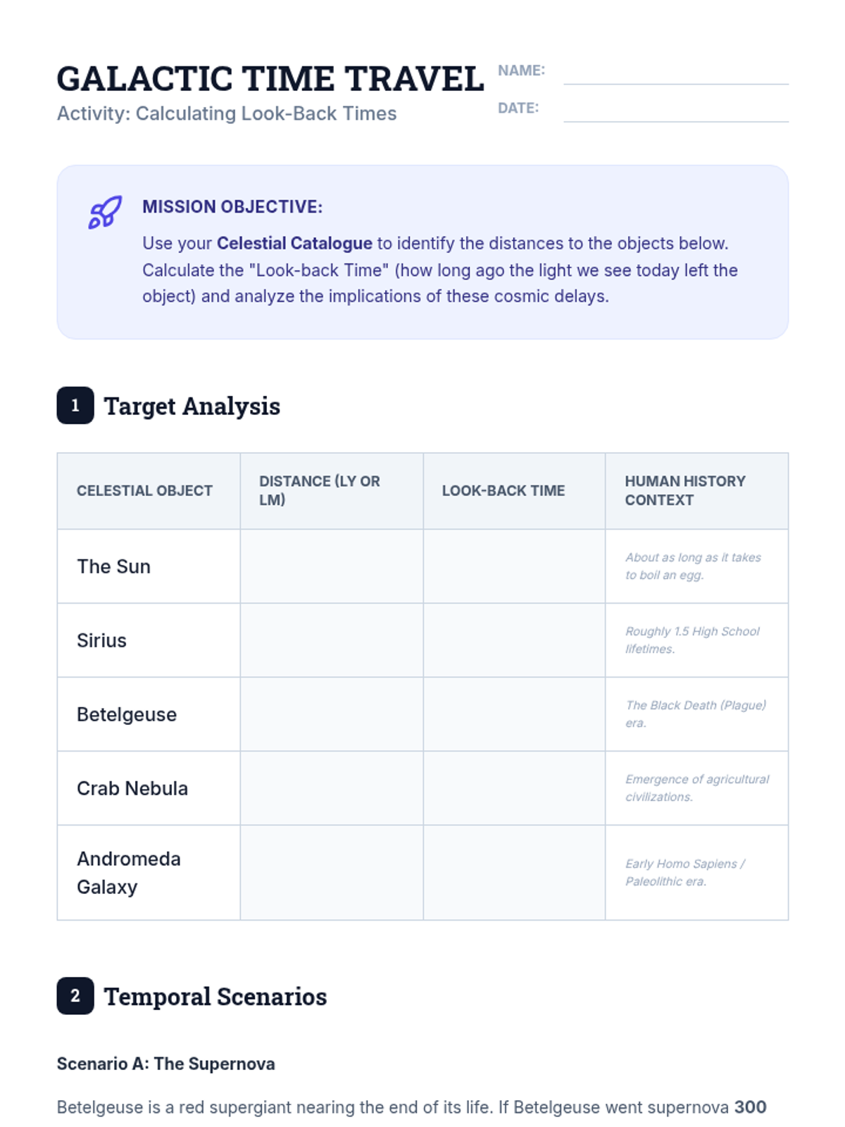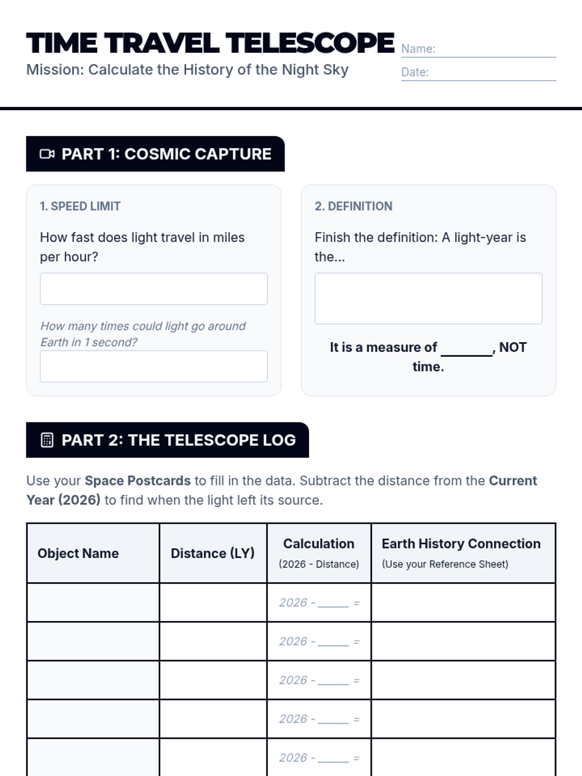 Students explore the concept of light-years, understanding them as units of distance rather than time, and discover why observing the night sky is essentially looking into the past. Through the 'Time Travel Telescope' activity, they calculate historical timestamps for light from distant celestial objects and map them against Earth's history.