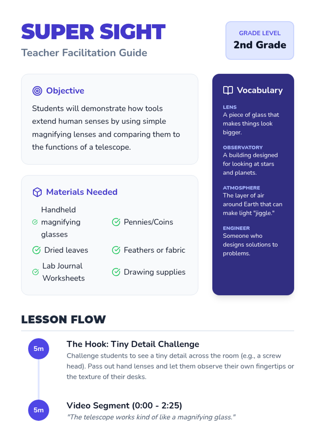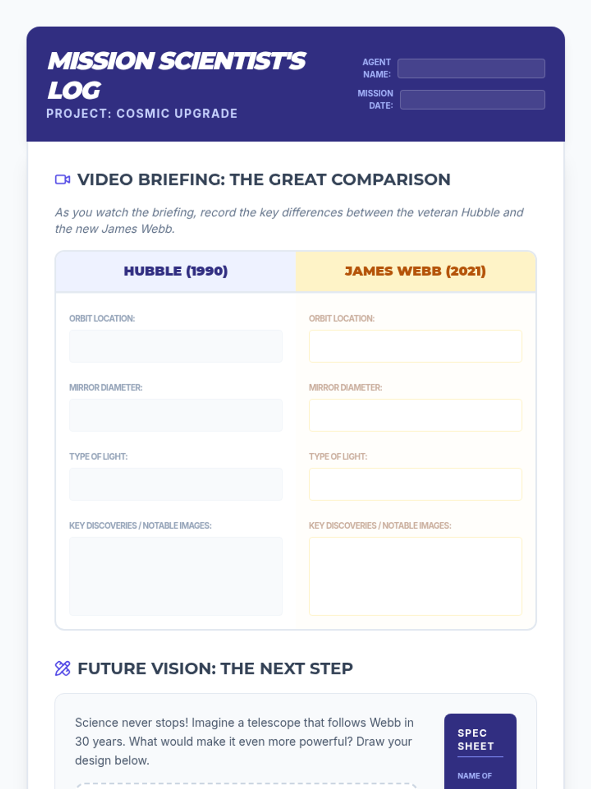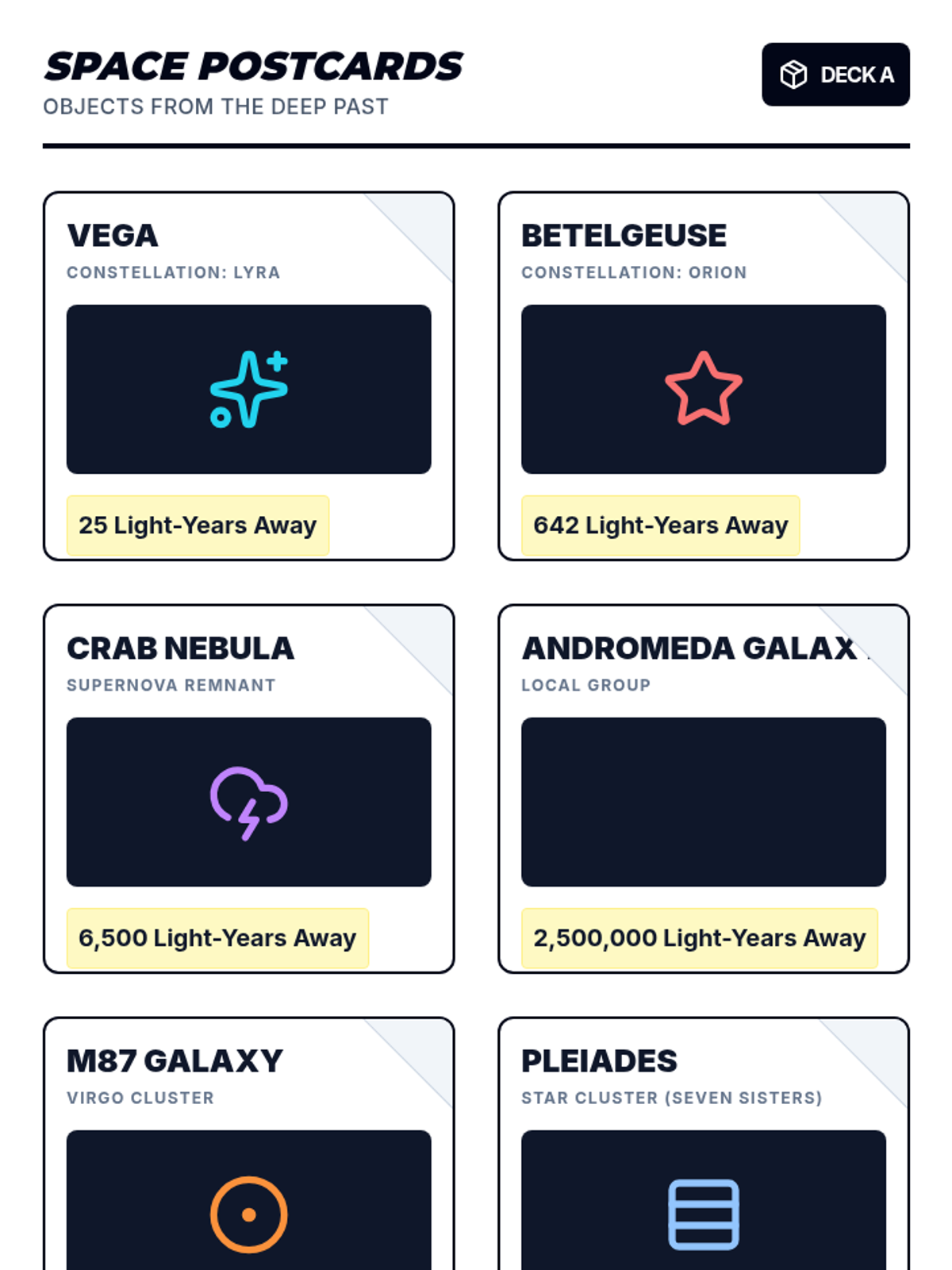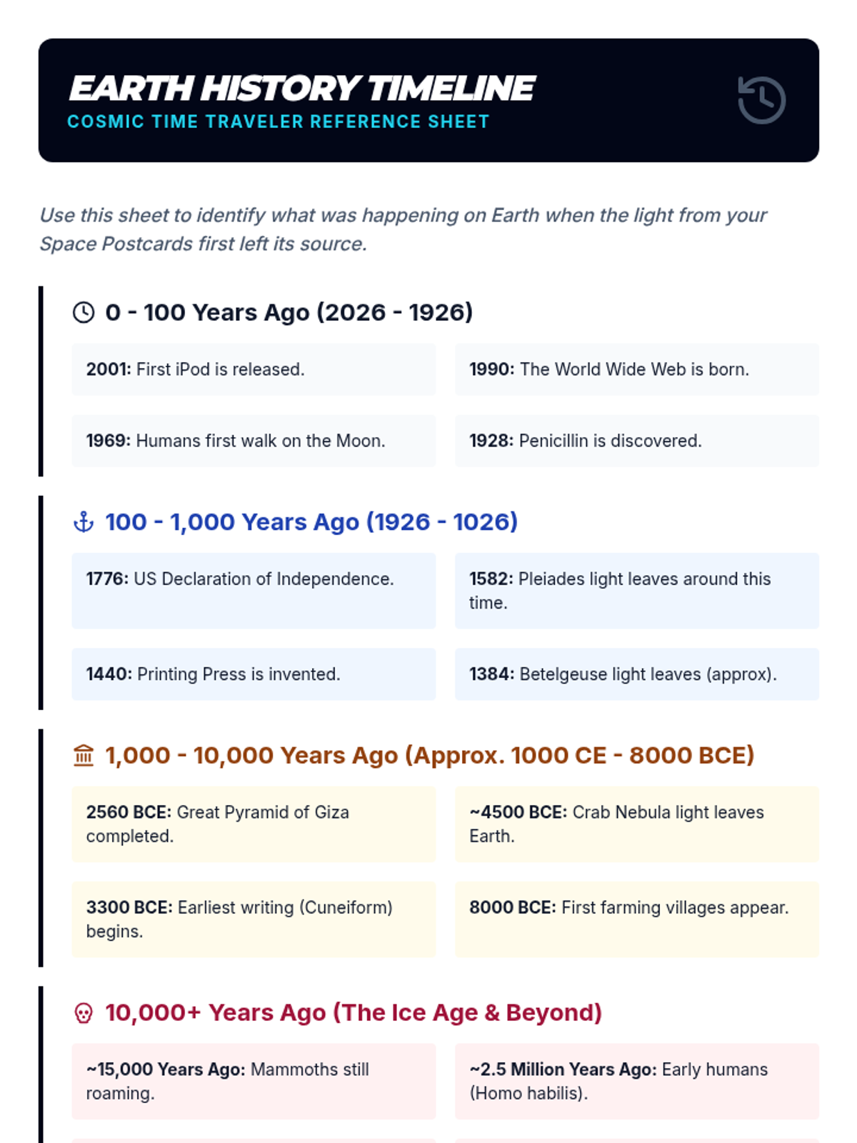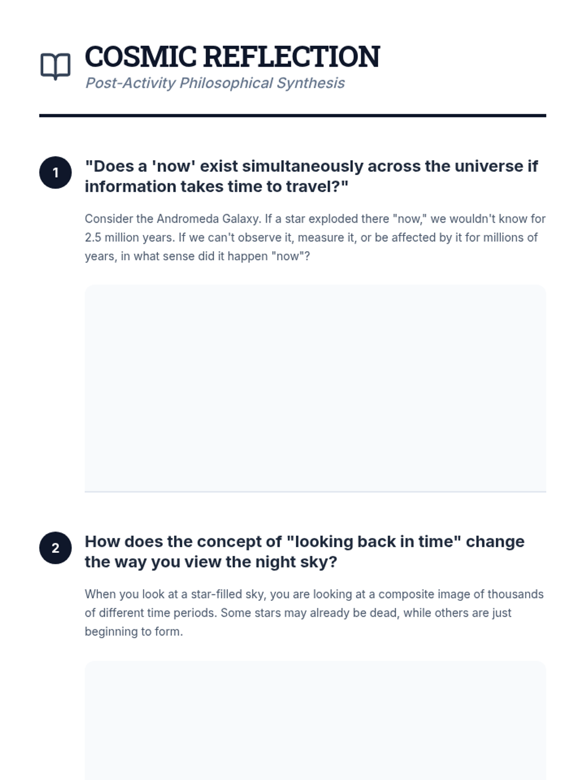 Students explore the concept of light-years, understanding them as units of distance rather than time, and discover why observing the night sky is essentially looking into the past. Through the 'Time Travel Telescope' activity, they calculate historical timestamps for light from distant celestial objects and map them against Earth's history.