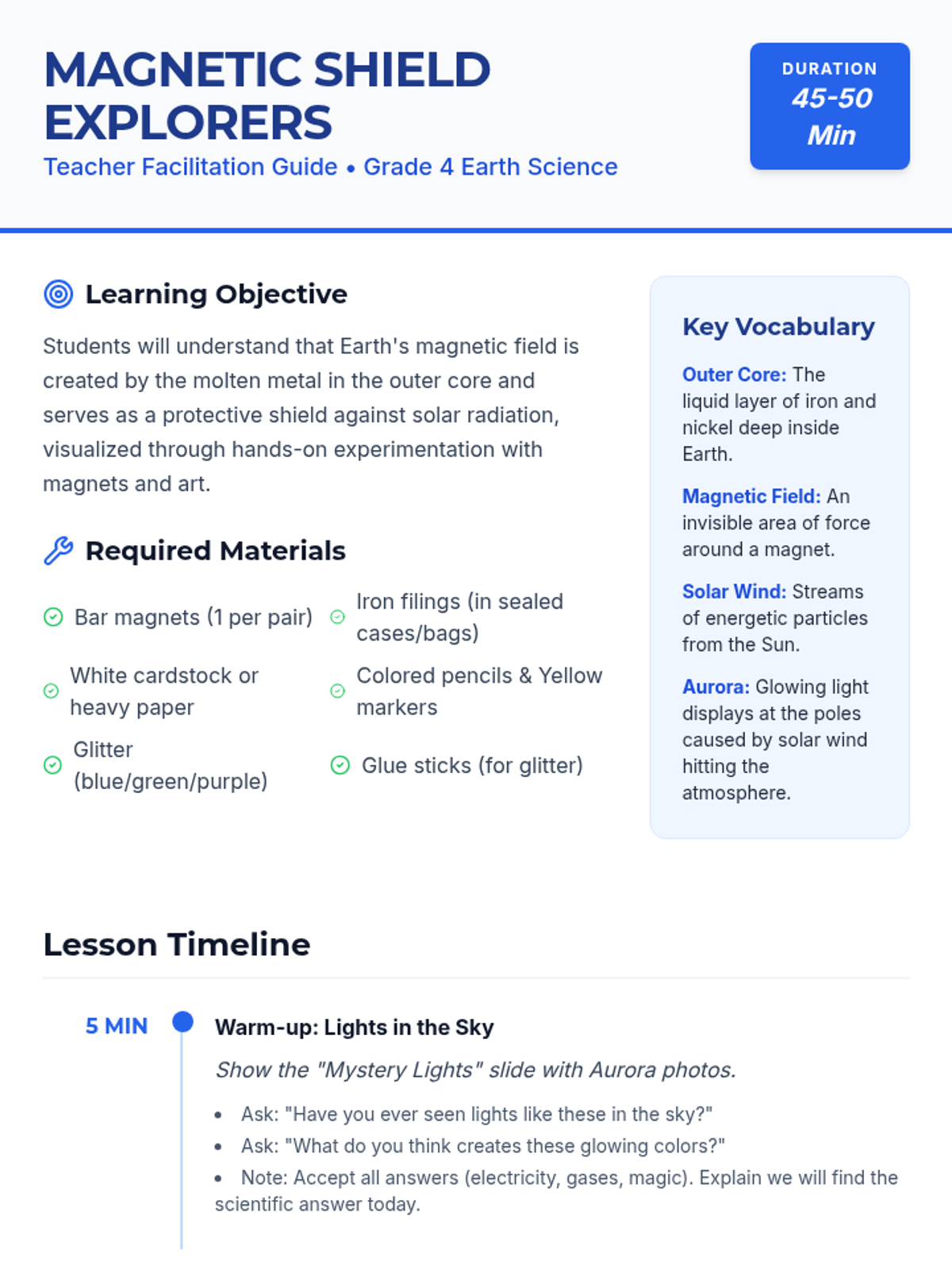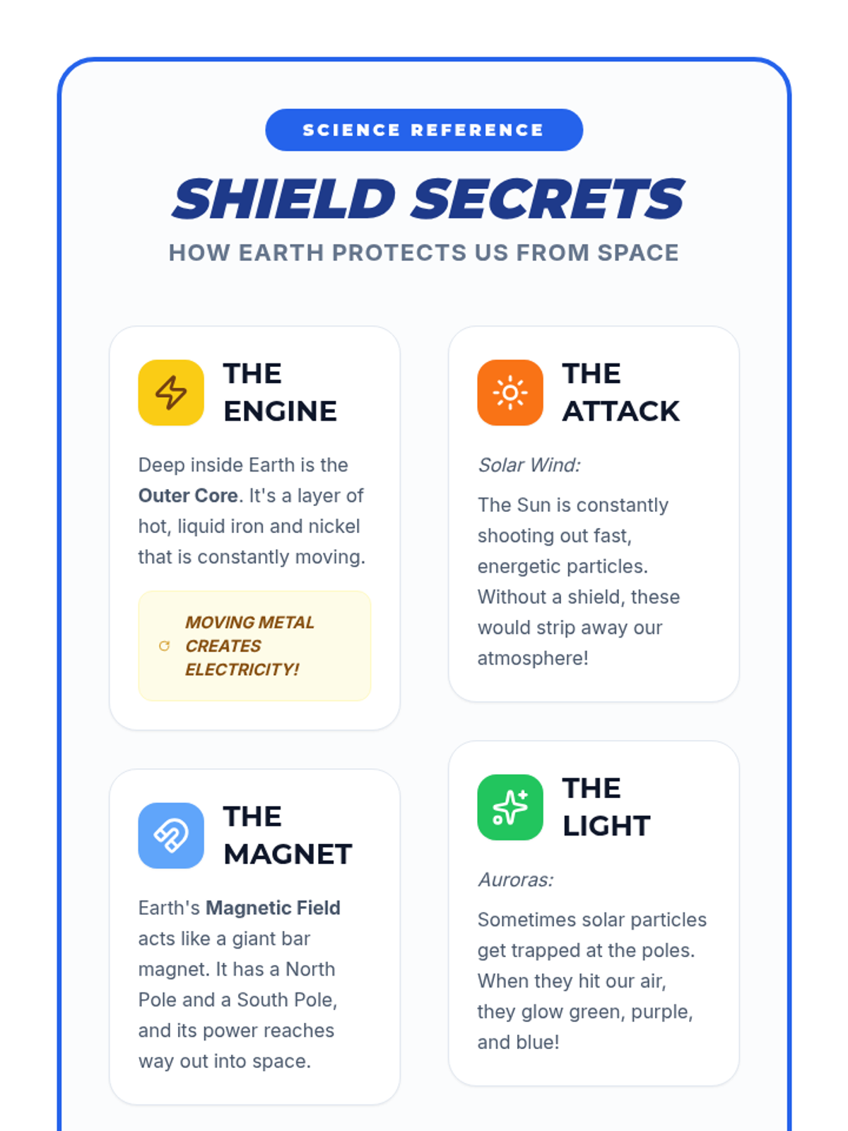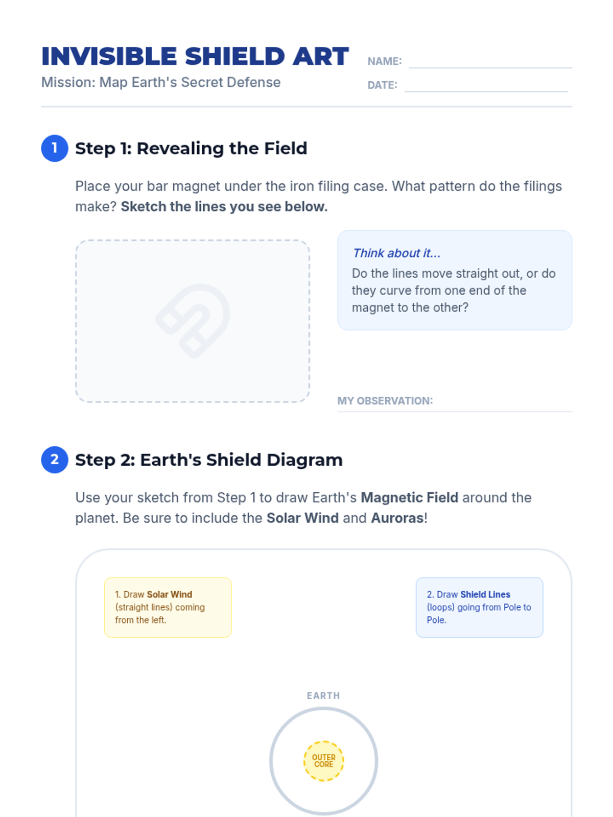 Students explore Earth's hidden defense system: the magnetic field. They discover how the spinning outer core creates a shield that protects life from solar wind, visualized through iron filing experiments and creative aurora art.