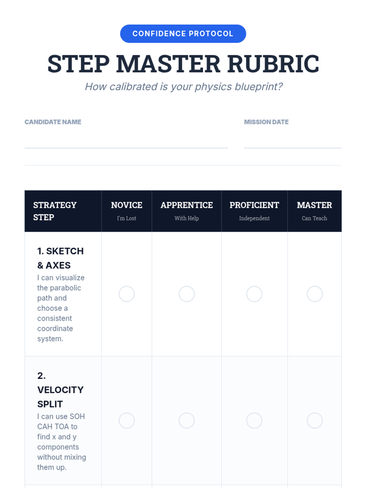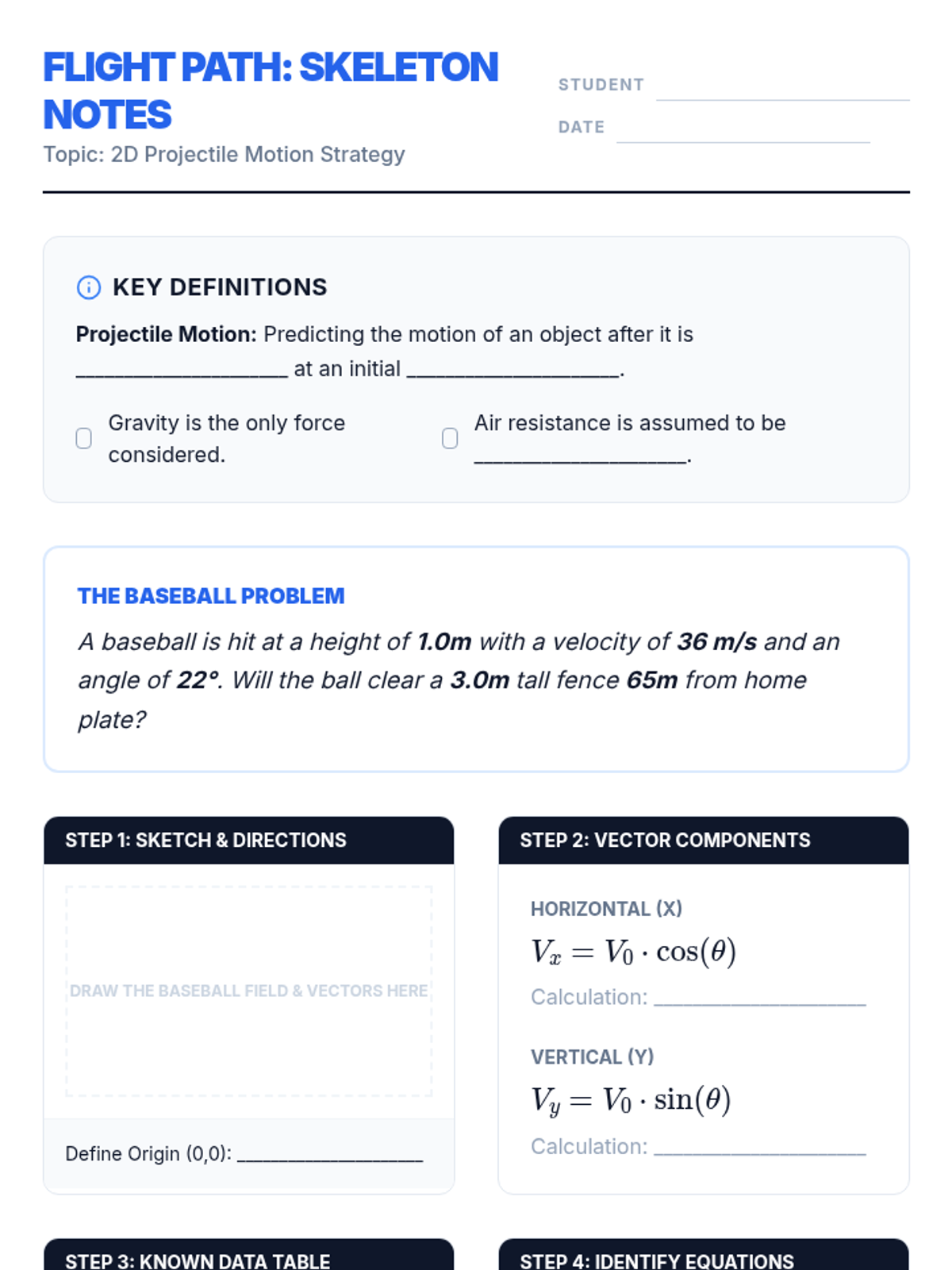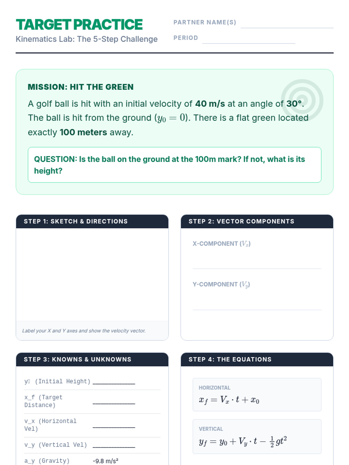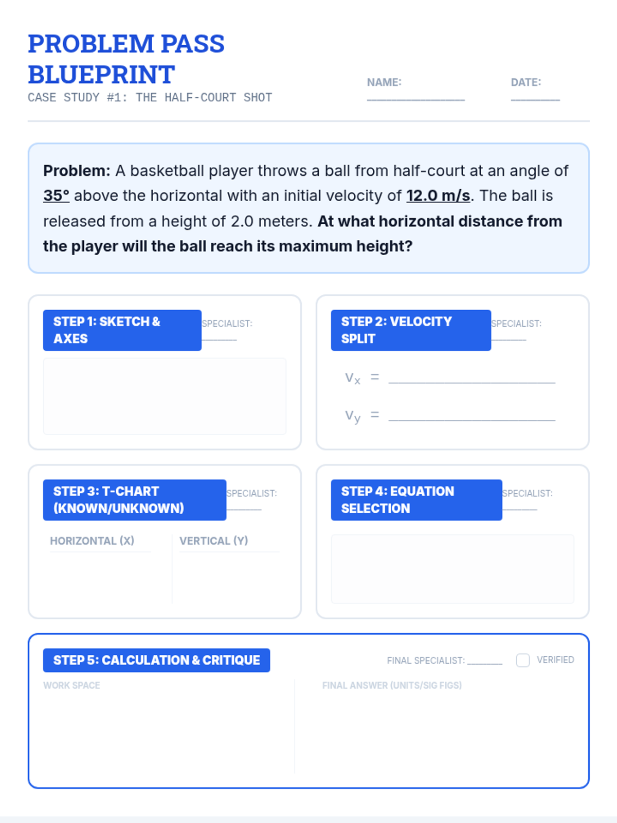 A high-energy lesson focused on mastering the 5-step problem-solving strategy for projectile motion through a collaborative 'Problem Pass' activity and video-based modeling. Students move from a jigsaw warm-up to a peer-critique practice session, ensuring mastery of sketches, components, and kinematic equations.