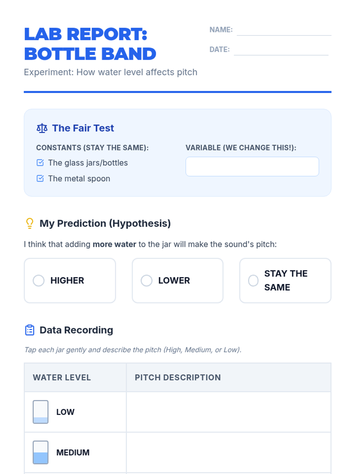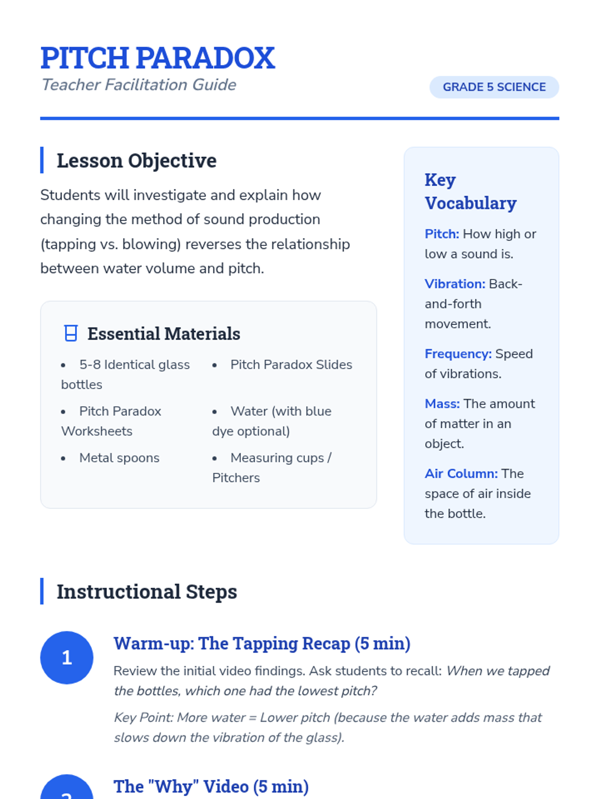 Students explore the relationship between mass and pitch by creating a 'bottle xylophone.' They will observe how water levels affect sound vibrations and apply this knowledge to precisely tune five bottles to play a simple song.