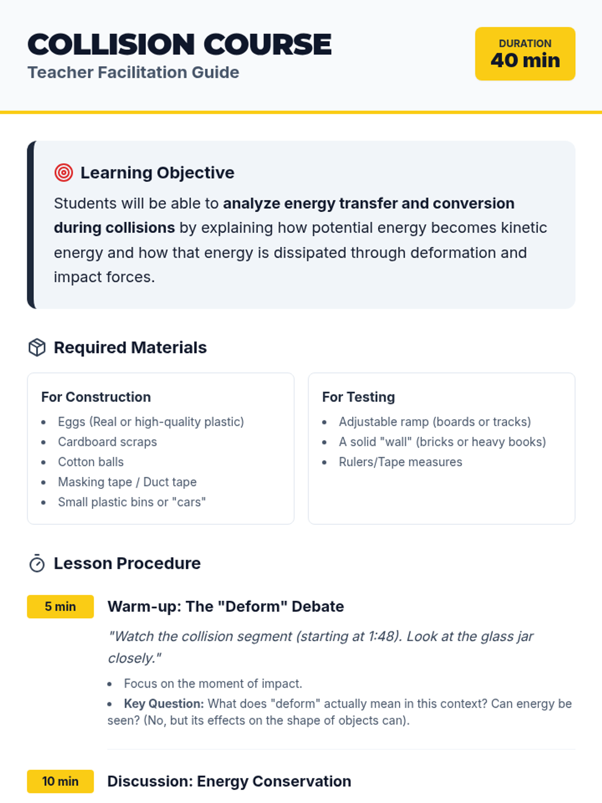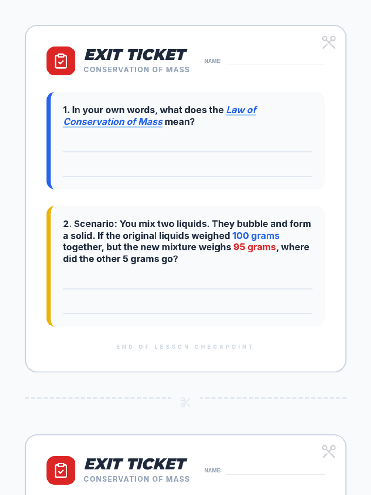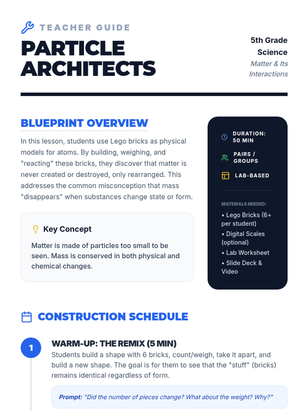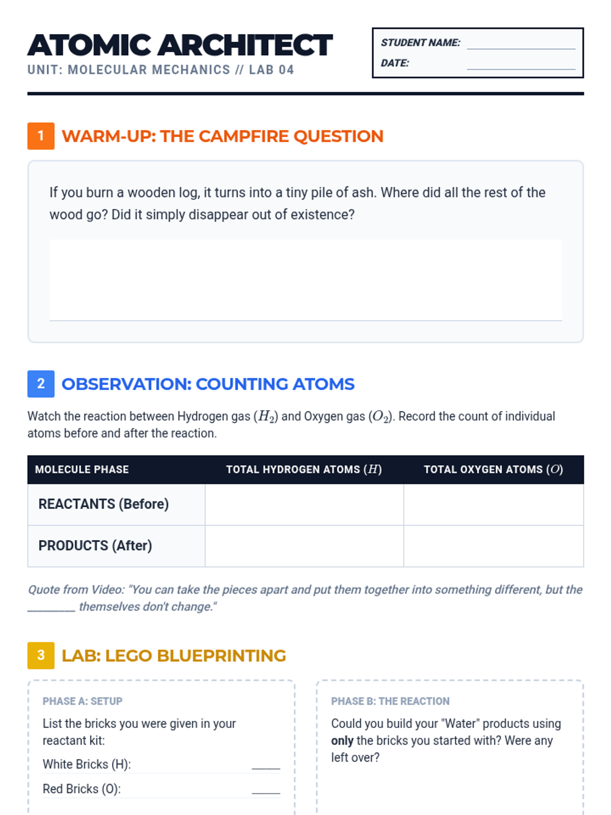 Students explore the conservation of mass and chemical reactions through a LEGO-based analogy, verifying that atoms are never created or destroyed, only rearranged. The lesson includes a video analysis, a hands-on building activity, and a reflection on chemical vs. nuclear reactions.