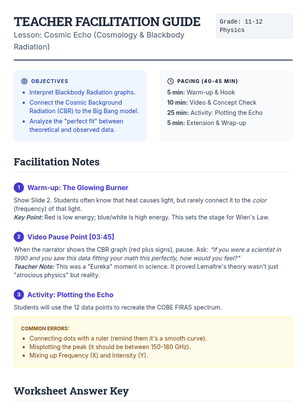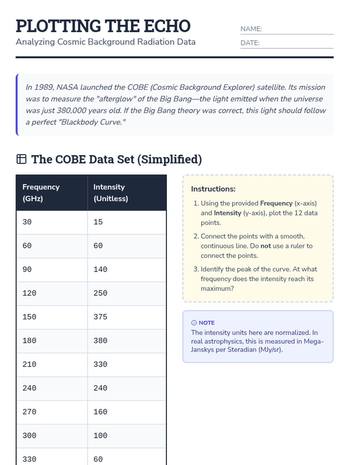 Students will analyze the Cosmic Background Radiation (CBR) as evidence for the Big Bang, focusing on interpreting blackbody radiation graphs and plotting actual cosmic data to witness the 'perfect fit' with theoretical models.