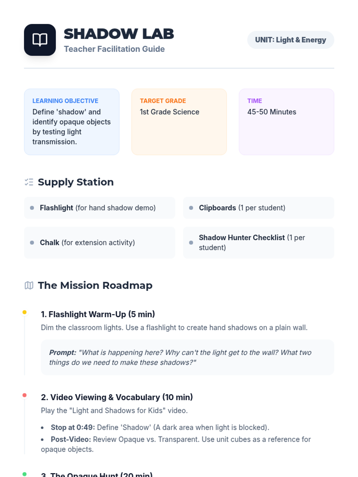 An introductory science lesson for 1st graders to explore how shadows are formed and identify opaque objects through a 'Shadow Hunter' classroom activity.