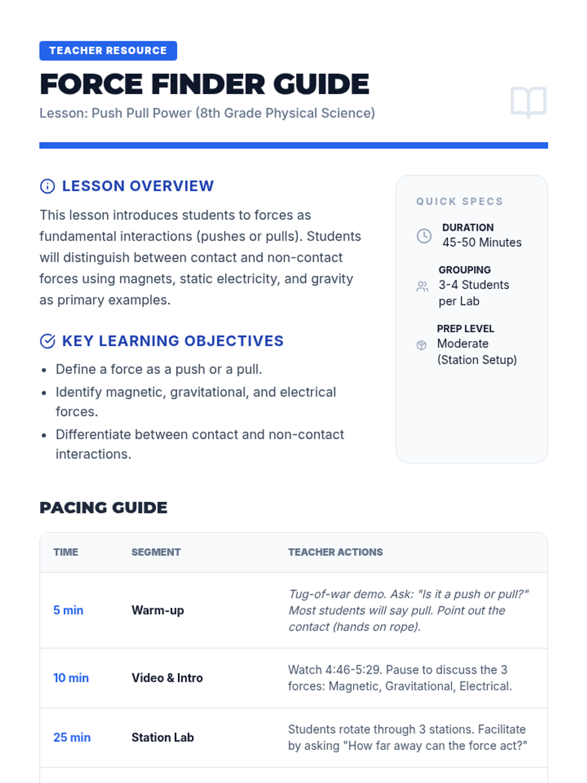 Students will investigate the fundamental nature of forces as pushes or pulls, exploring magnetic, gravitational, and electrical forces through hands-on lab stations and video analysis.