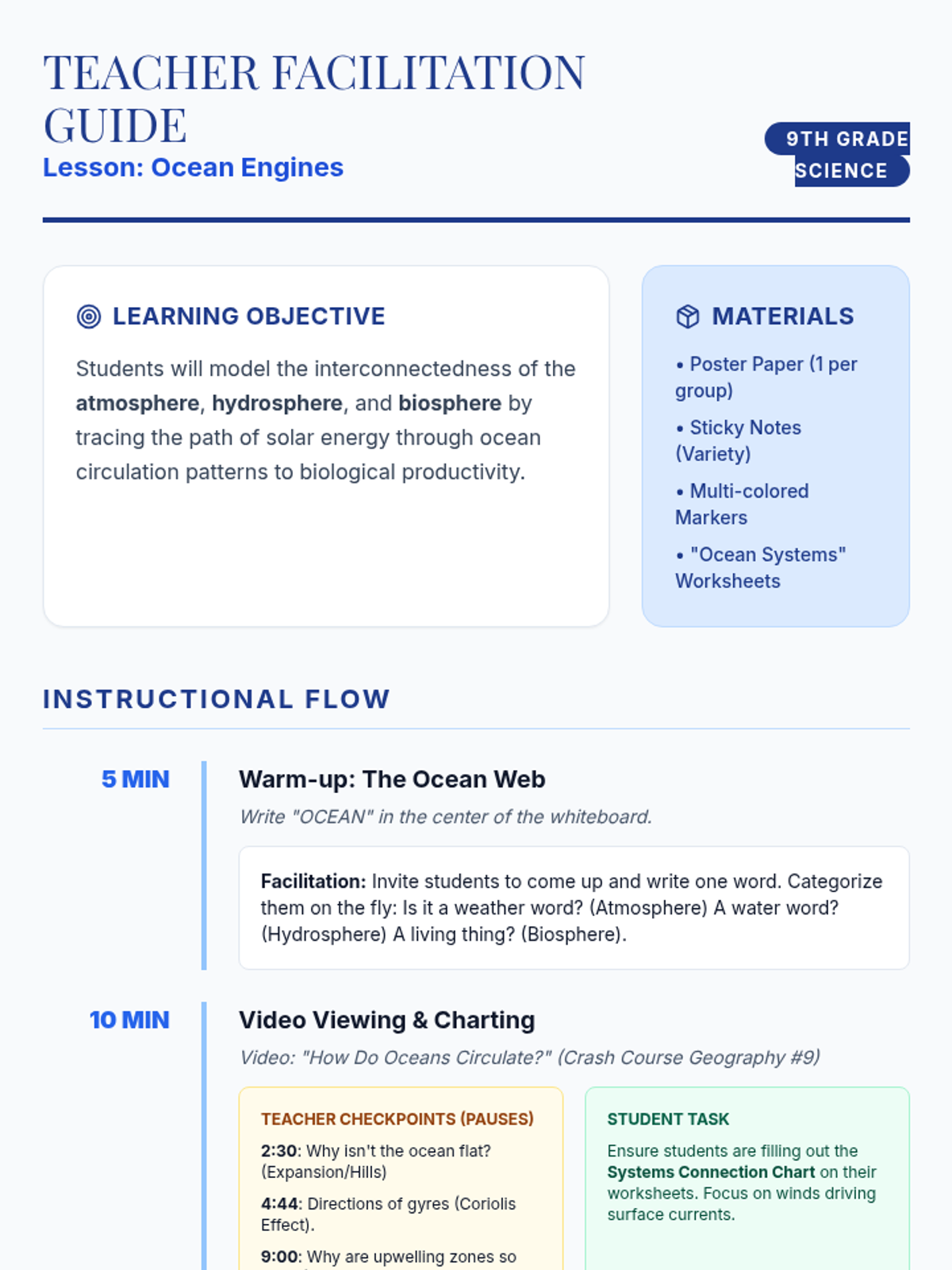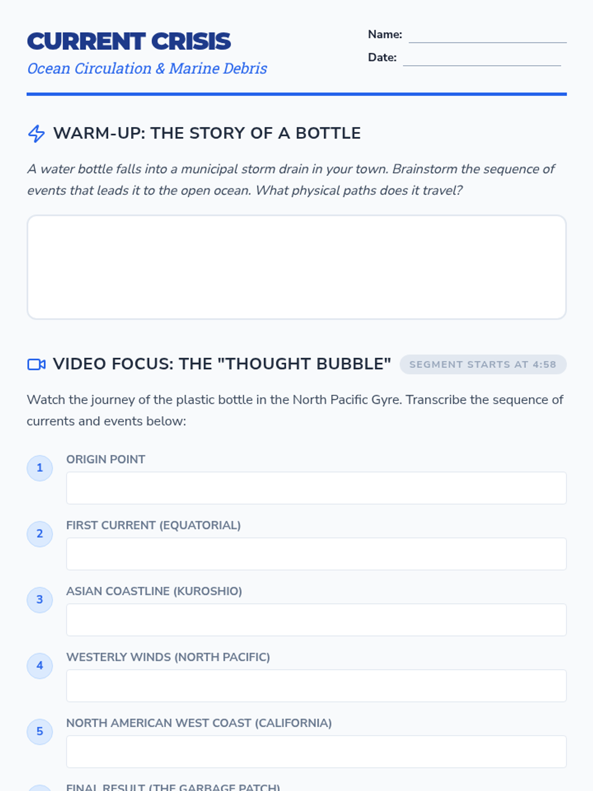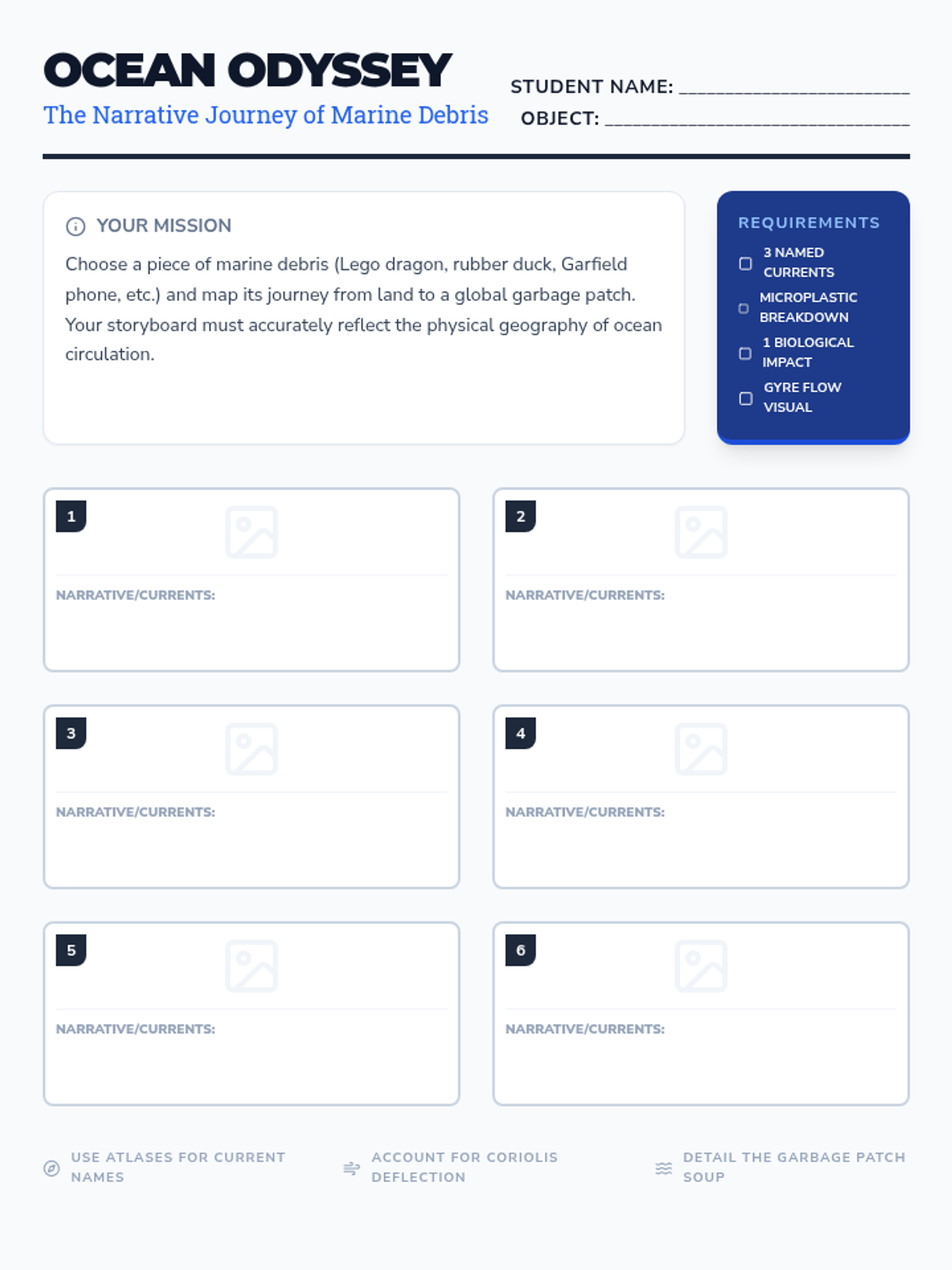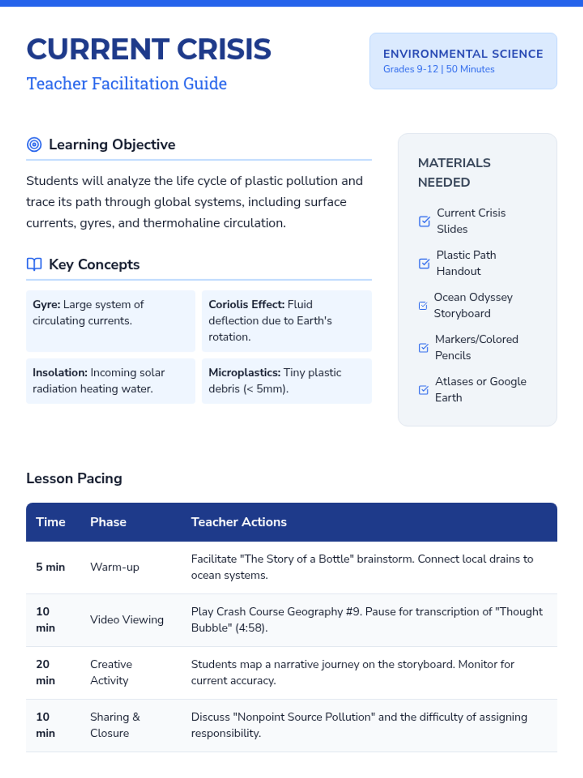 Students analyze the life cycle of plastic pollution, tracing its path through global ocean currents and gyres. The lesson focuses on the physical geography of ocean circulation and the environmental impact of nonpoint source pollution using real-world examples like the Lego dragon and Garfield phone spills.