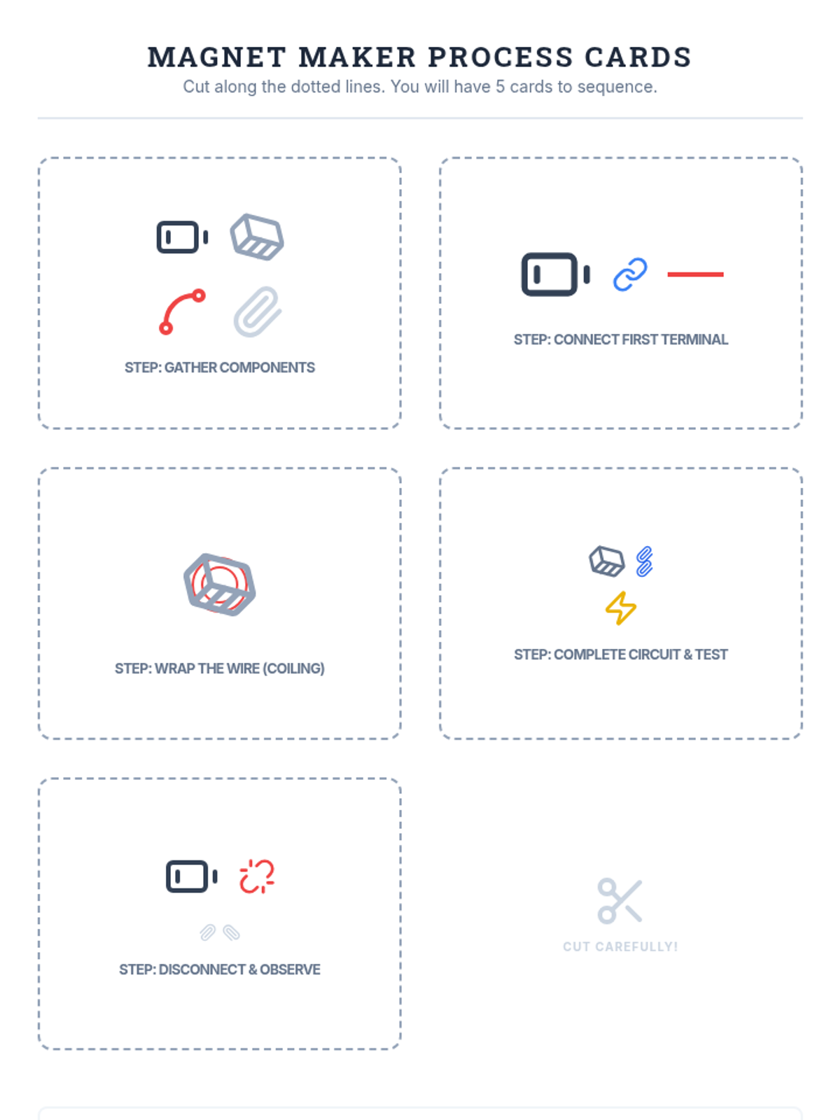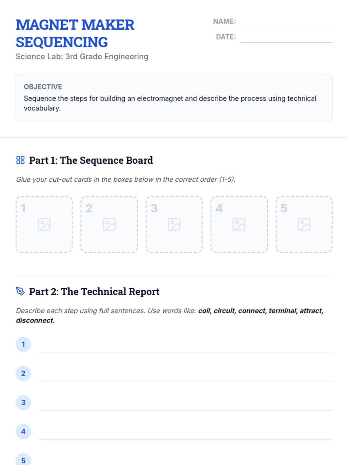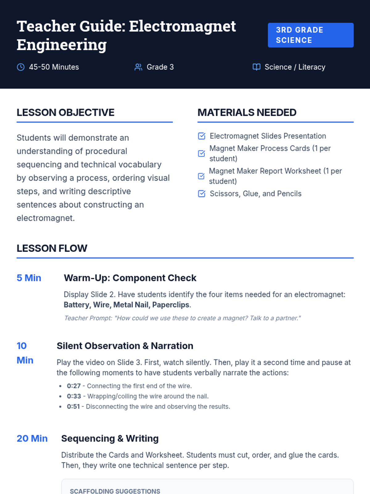 A hands-on science lesson where 3rd grade students explore the construction of an electromagnet through video observation, technical sequencing, and descriptive writing.
