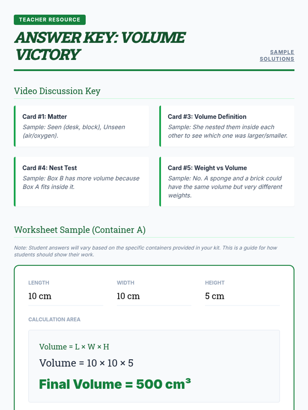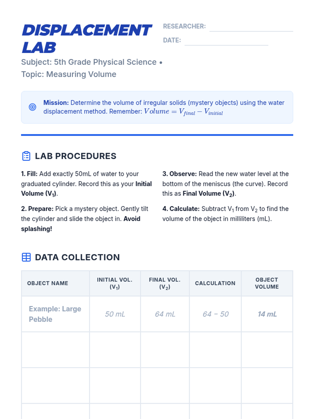 Students learn to measure the volume of irregular solids using the water displacement method through a combination of video analysis, hands-on laboratory experimentation, and data calculation.