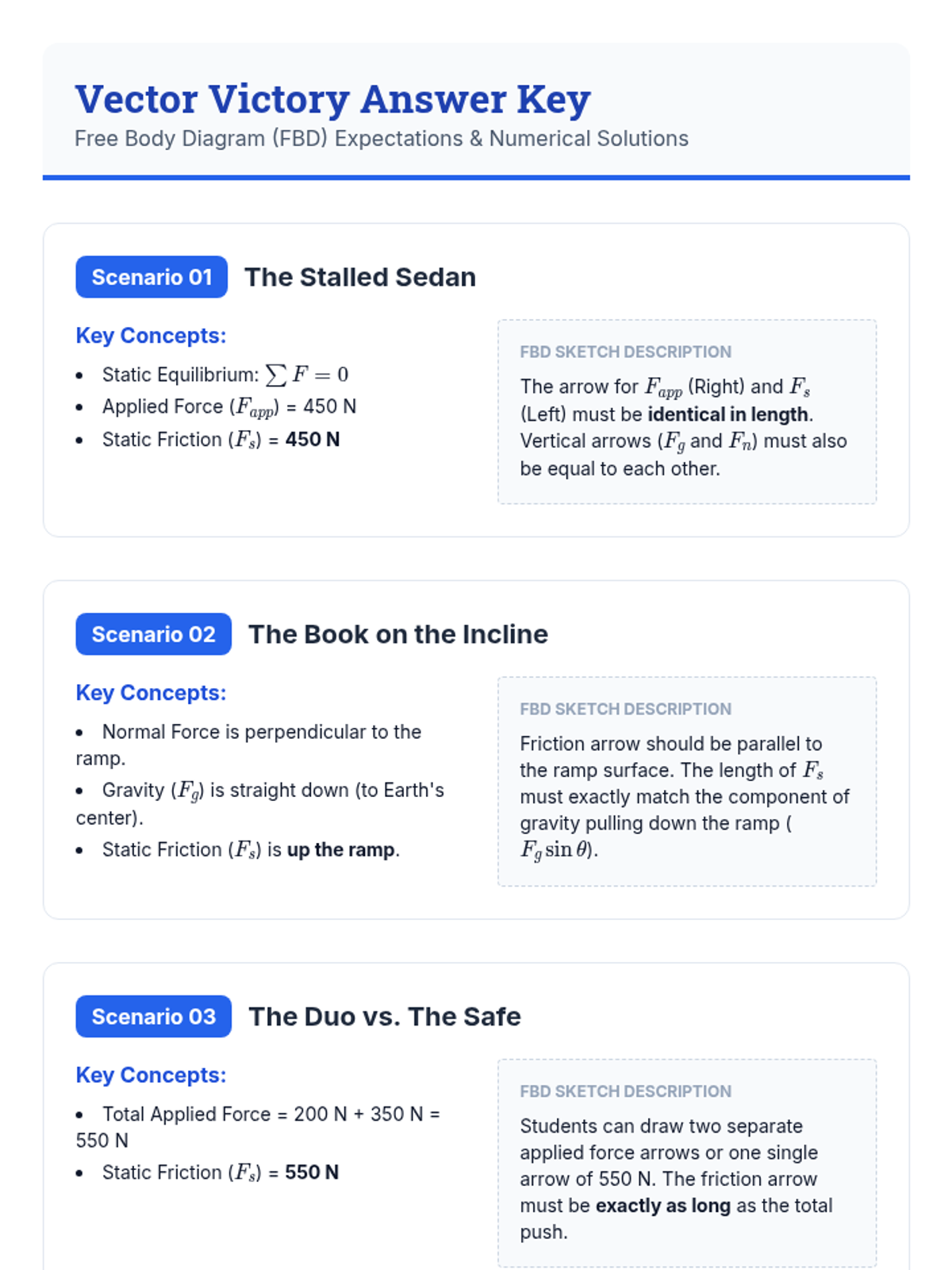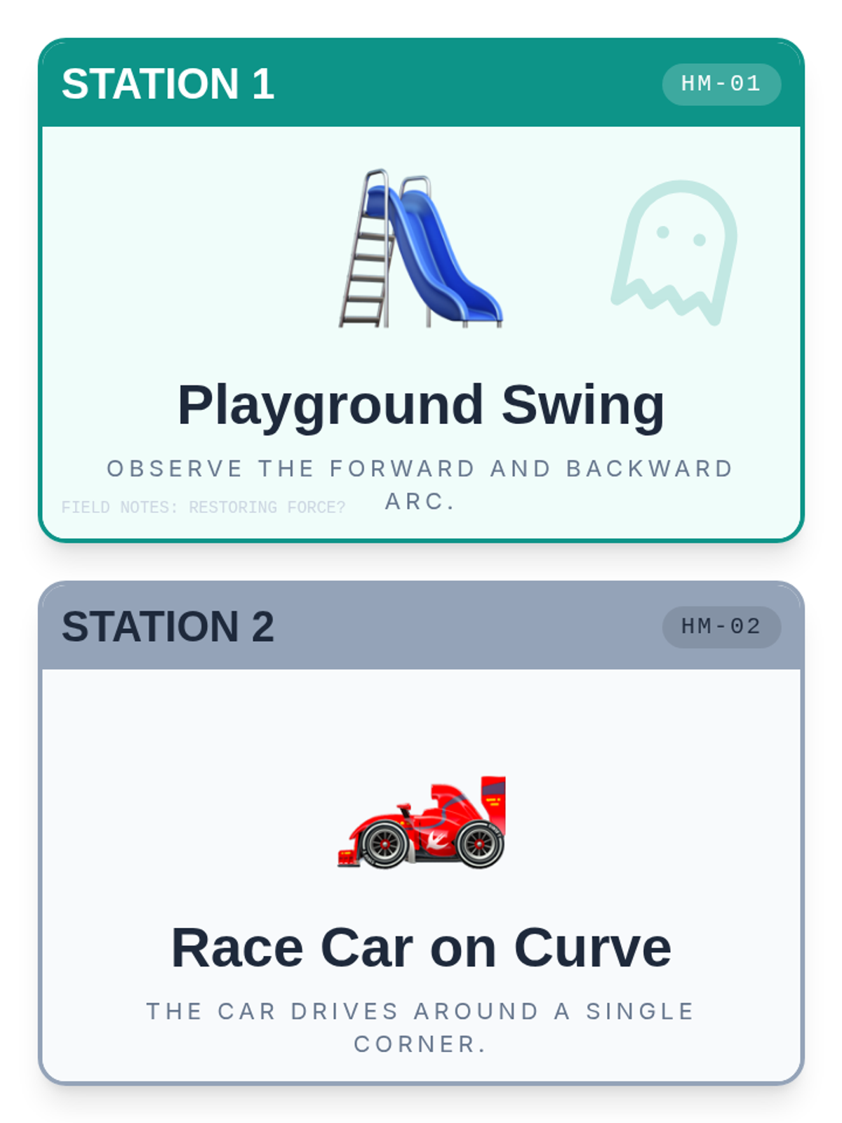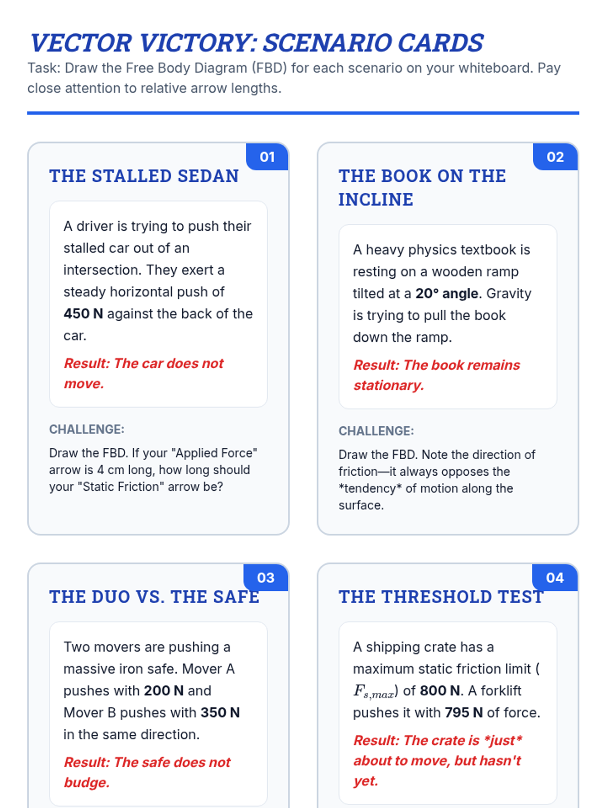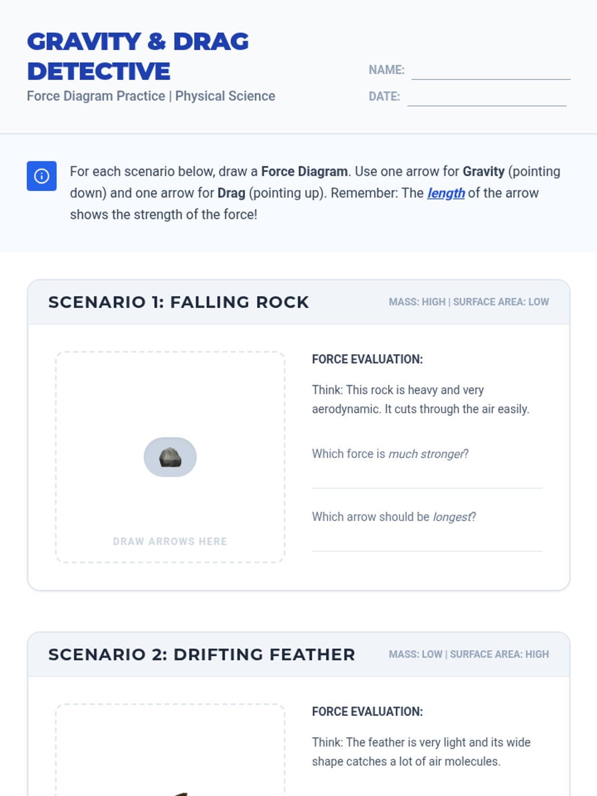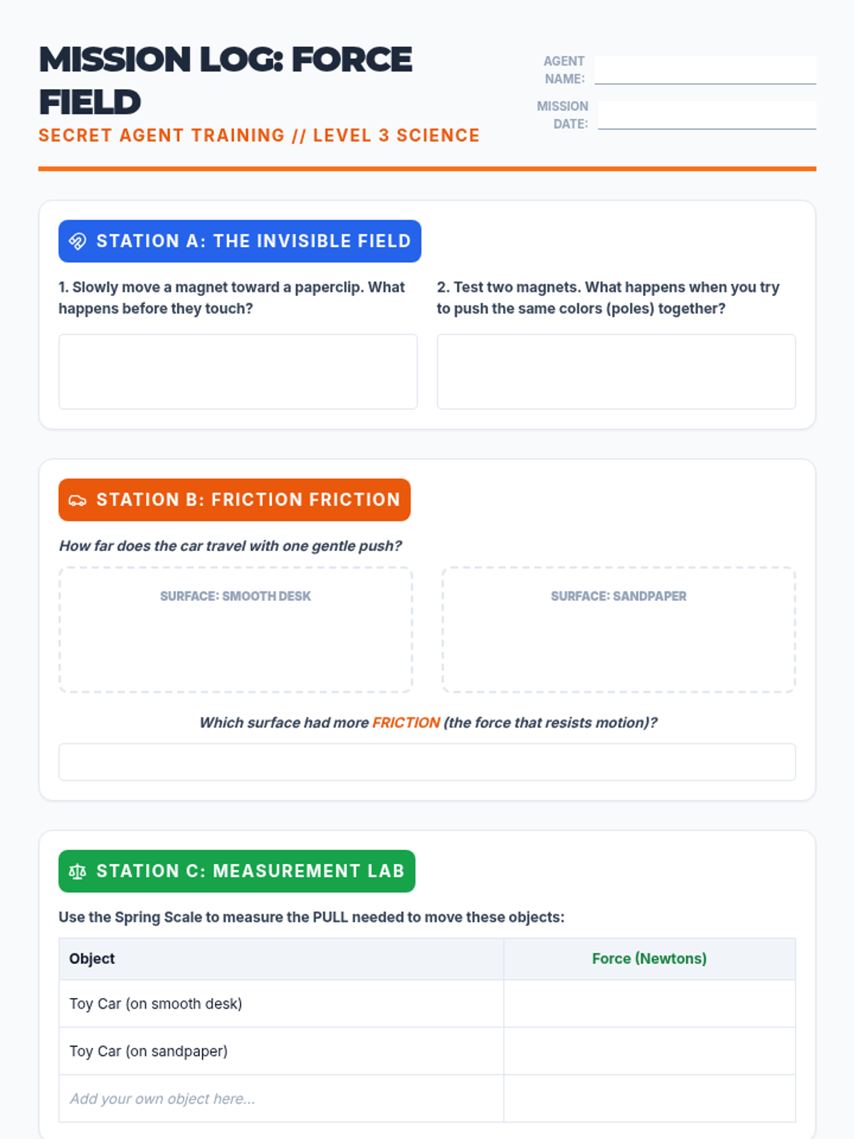 A station-based review lesson where students use physical models and diagrams to explore balanced and unbalanced forces, friction, gravity, and magnetism.