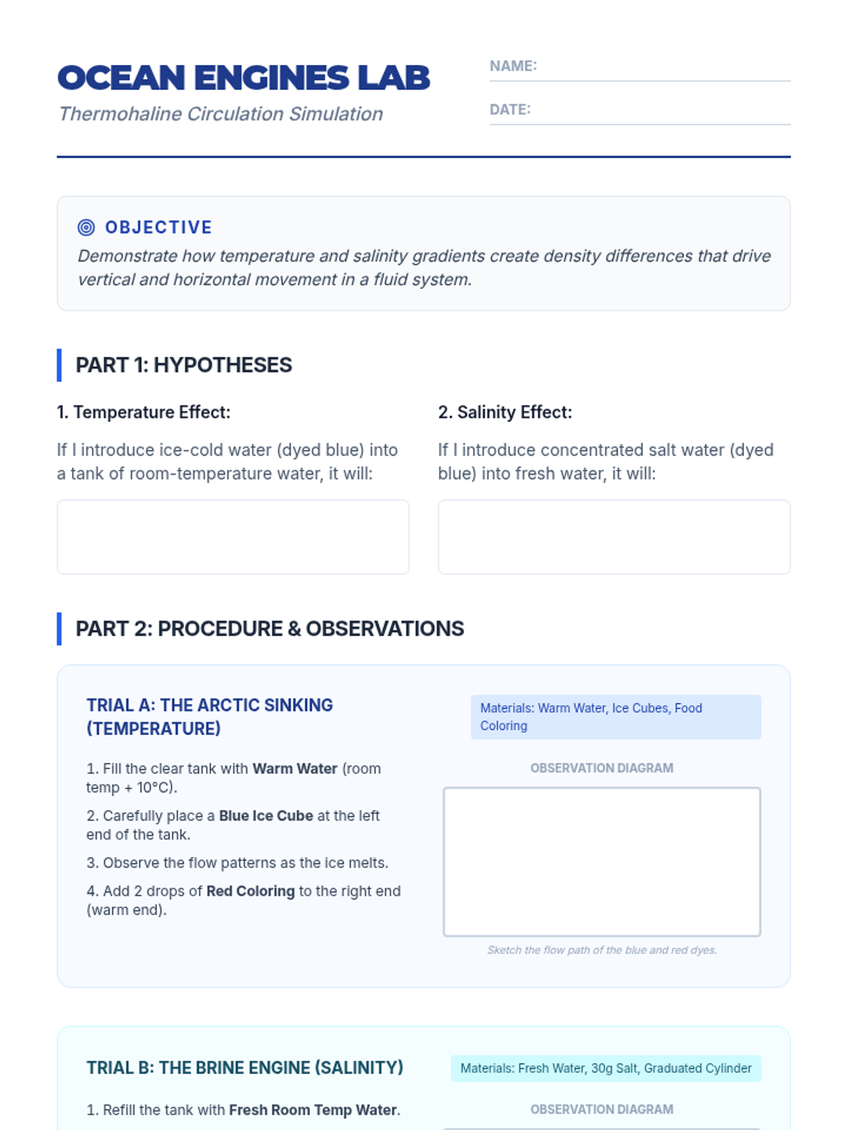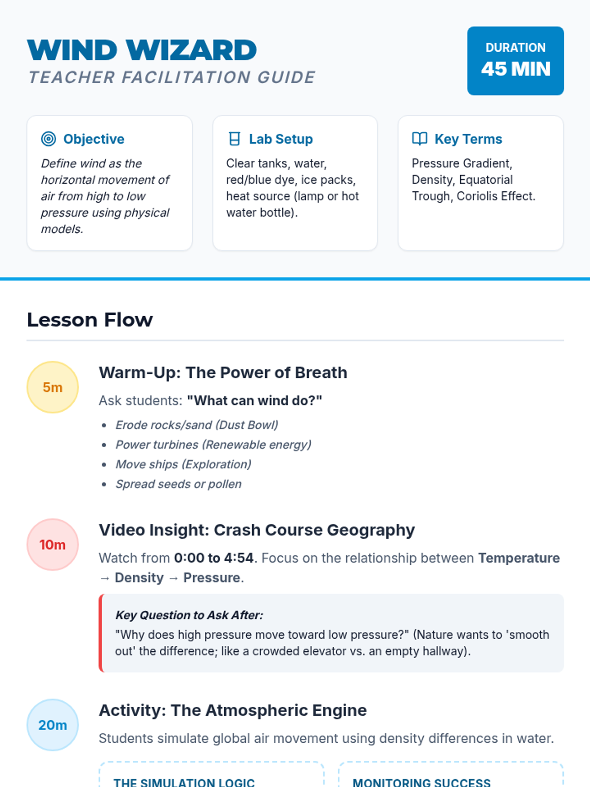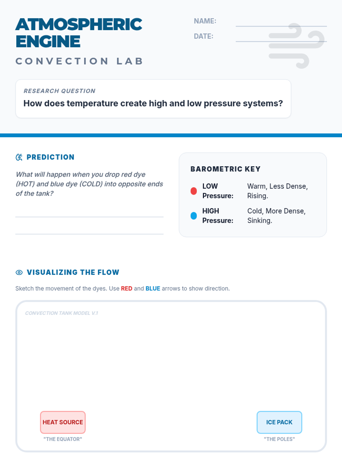 A hands-on Earth Science lesson for grades 6-8 exploring the relationship between density, pressure, and wind. Students use a convection tank model to simulate global air movement and identify the 'Equatorial Trough'.
