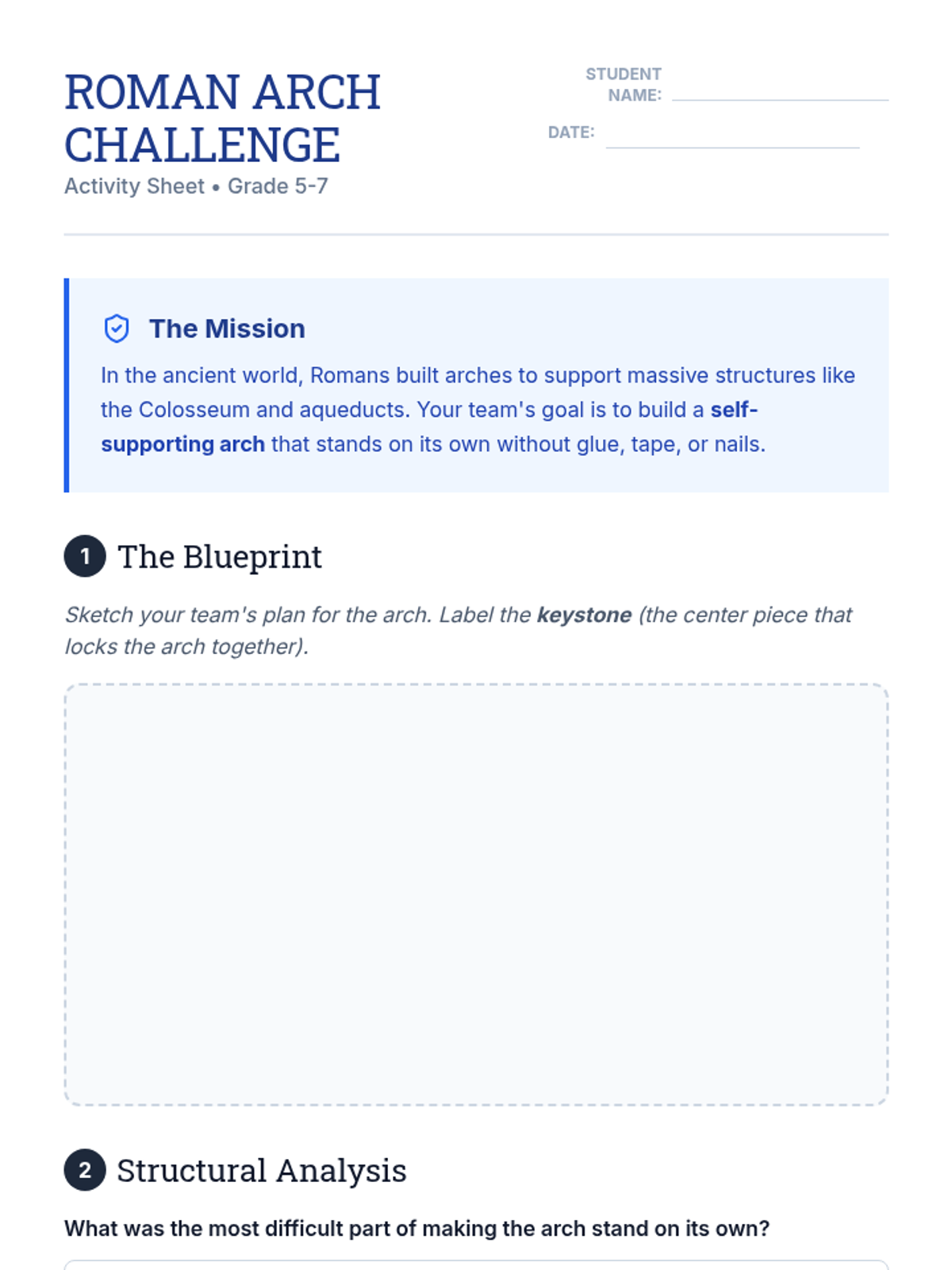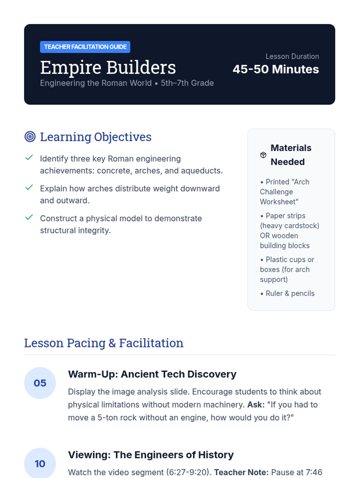 Students explore Roman engineering through the lens of concrete, arches, and aqueducts, culminating in a hands-on building challenge to understand structural integrity.