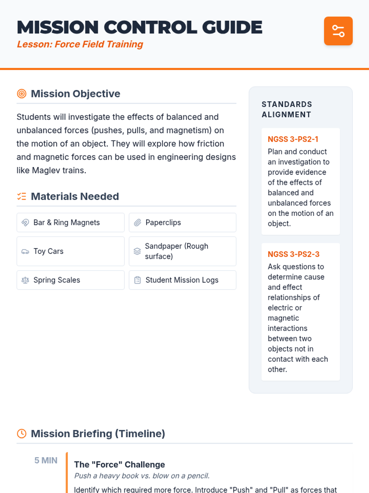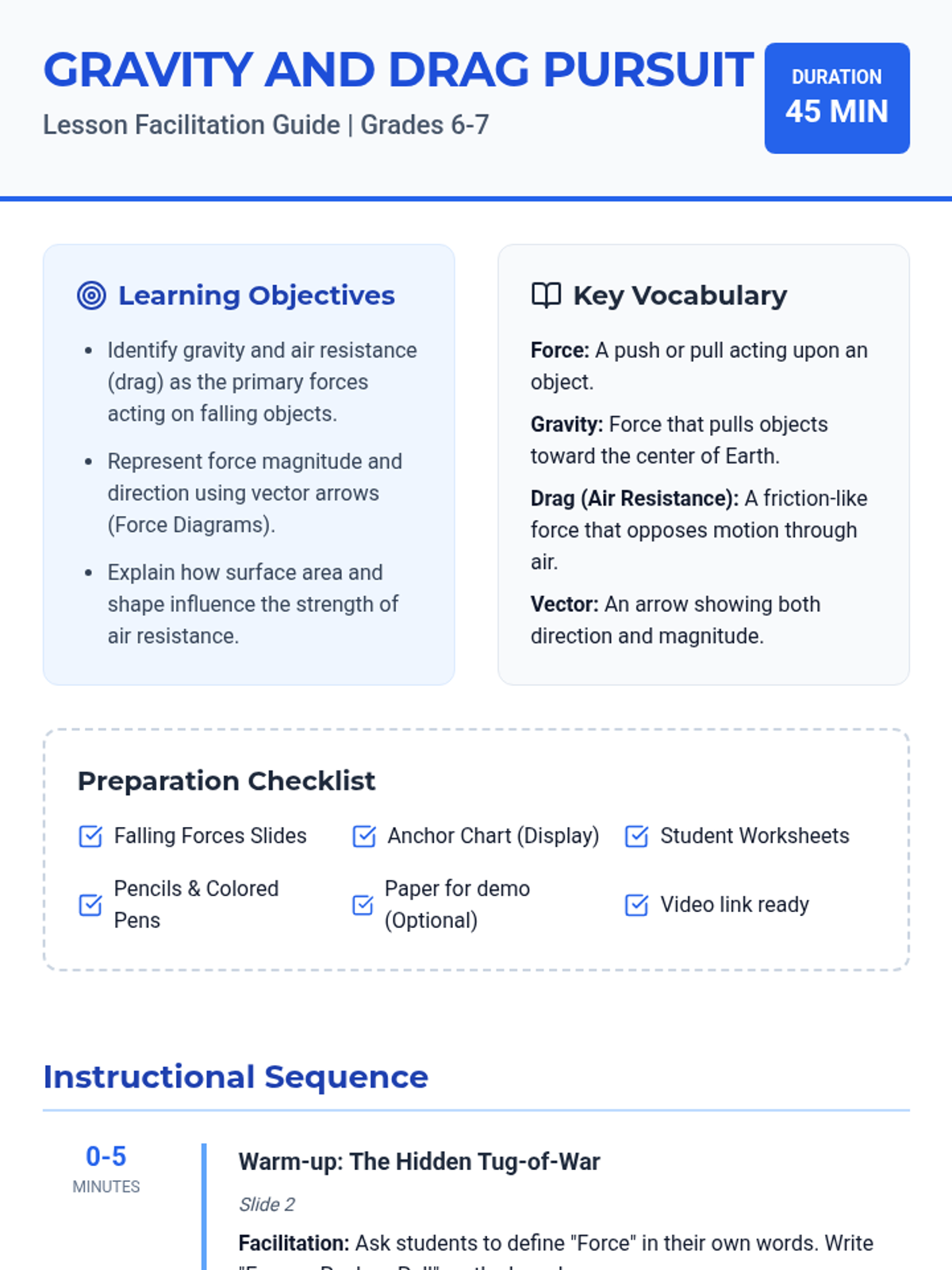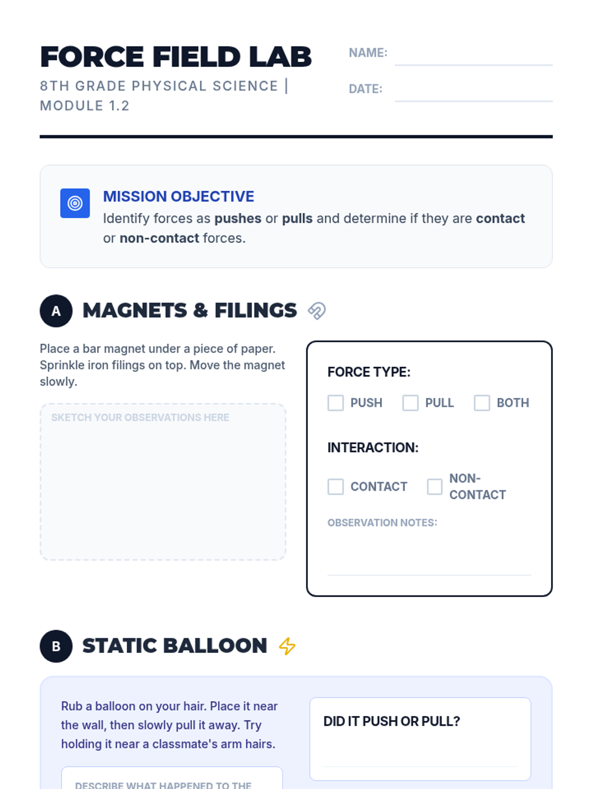 A comprehensive 60-minute science lesson for 7th grade students focused on how magnetic forces affect object motion without direct contact. Students will explore magnetic fields, poles, and specific magnetic materials through hands-on investigation.