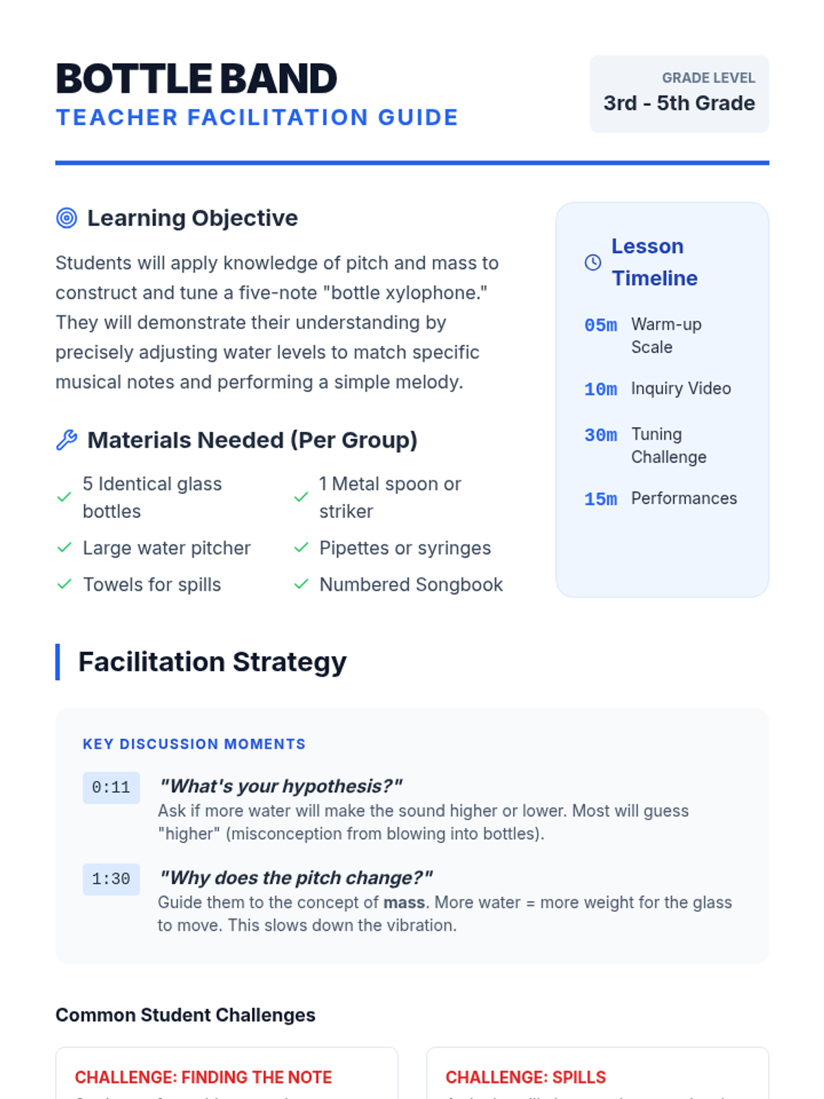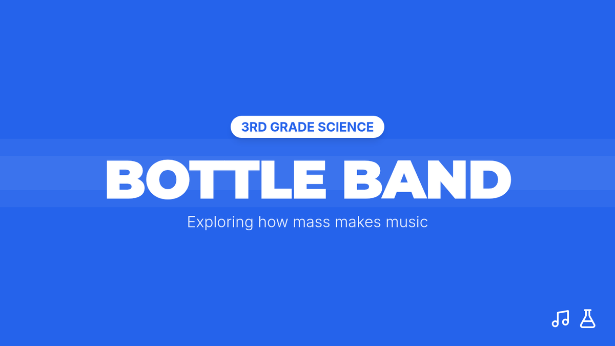 A hands-on exploration of sound and pitch for 2nd graders, featuring a glass bottle xylophone experiment to demonstrate how mass affects vibration and frequency.