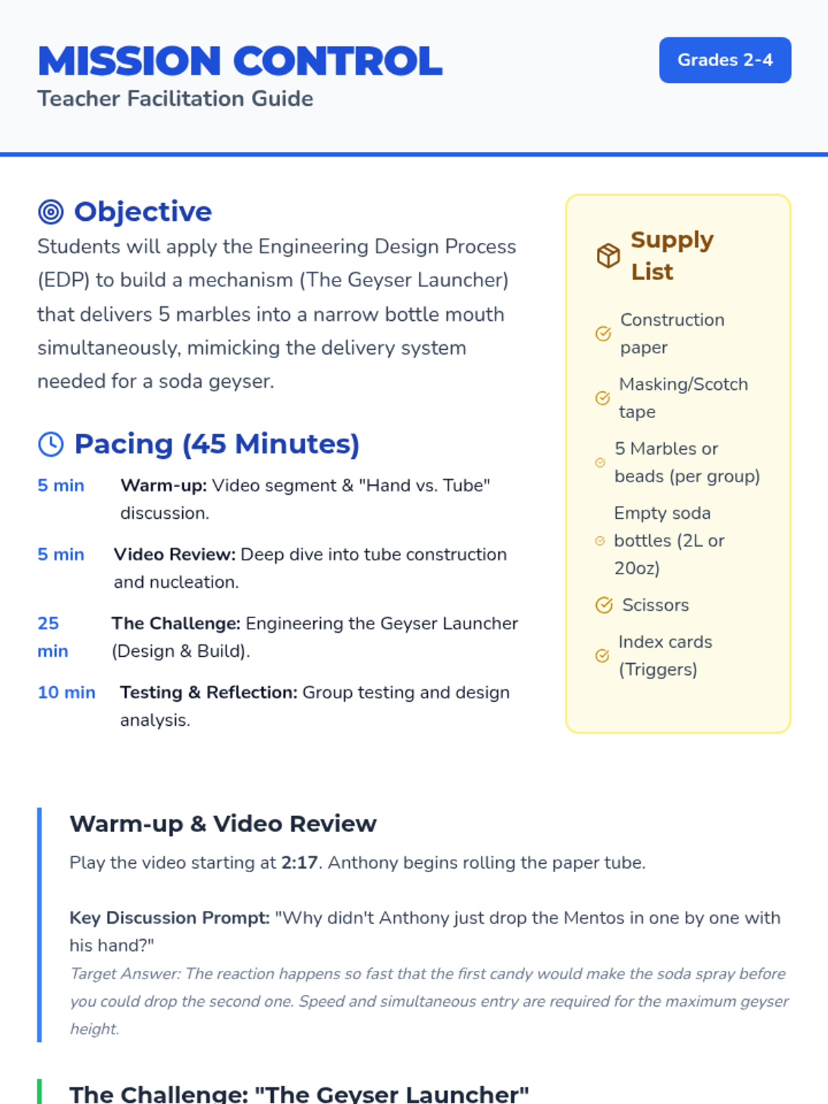Students explore the physics of nucleation and the engineering design process by building a mechanism to deliver multiple objects into a narrow container simultaneously. This lesson bridges science concepts from SciShow Kids with a hands-on engineering challenge.