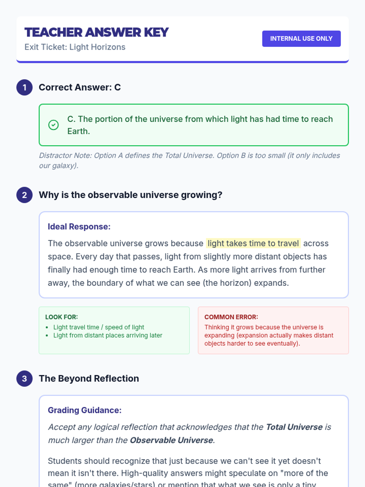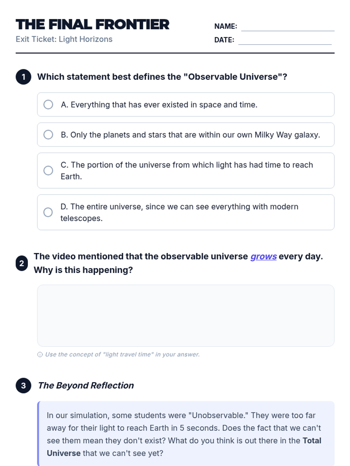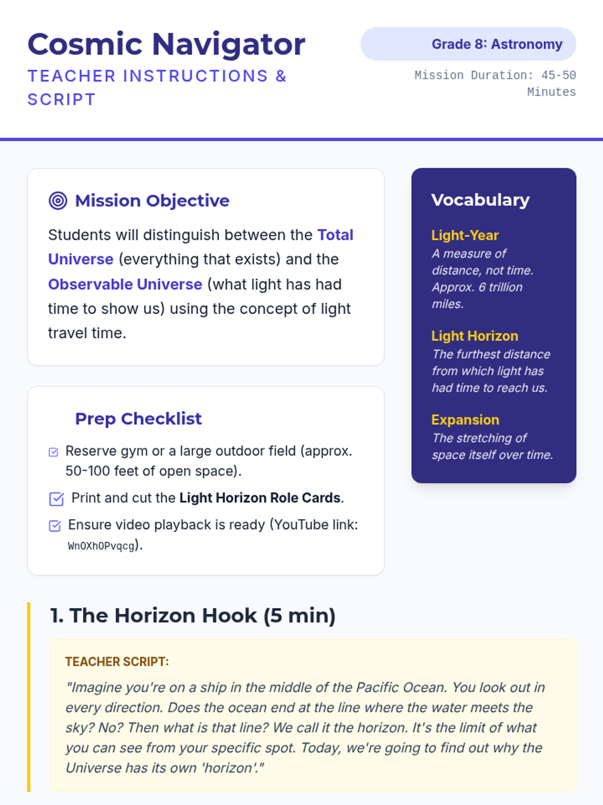 A comprehensive lesson exploring the distinction between the Total Universe and the Observable Universe through a horizon-based simulation and the concept of light travel time. Students move from the familiar 'cosmic address' to the limits of human observation.