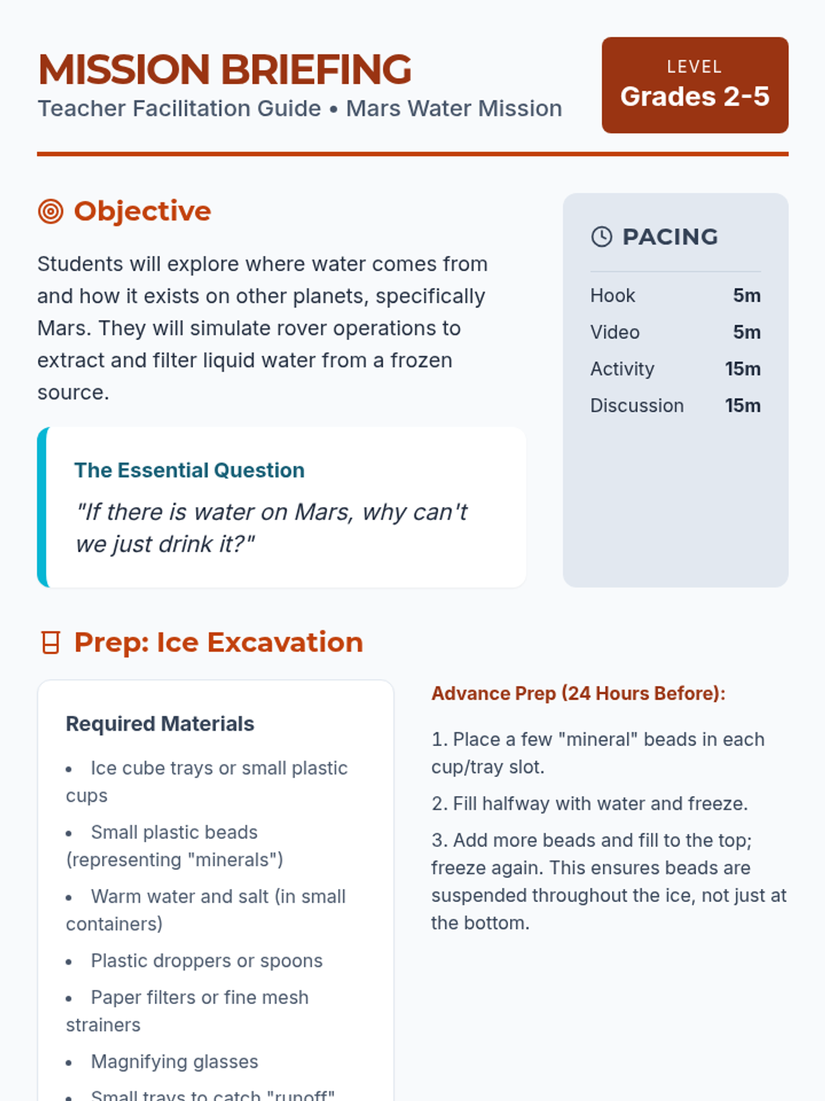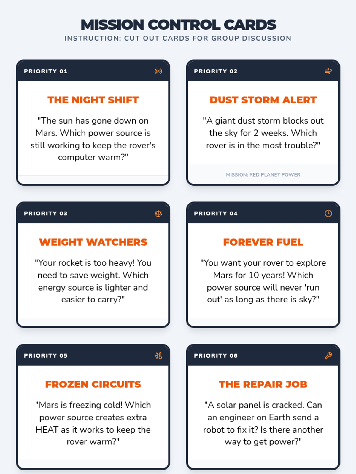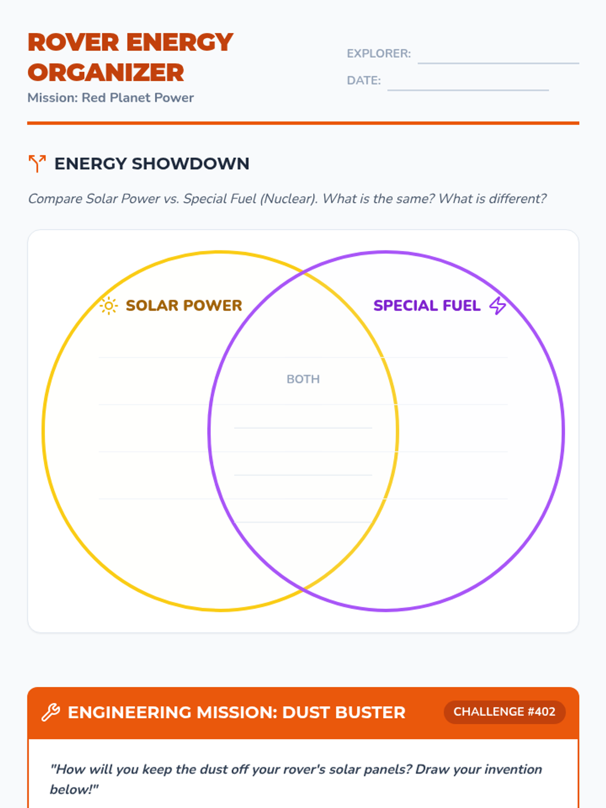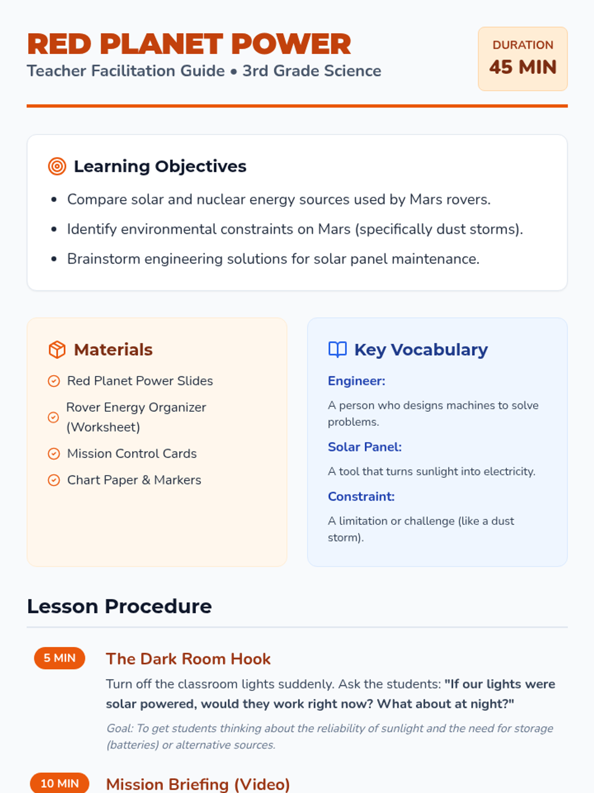 A 3rd-grade science lesson exploring energy sources for Mars rovers, focusing on the trade-offs between solar and nuclear power in the harsh Martian environment. Students will analyze constraints like dust storms and design engineering solutions for maintenance.