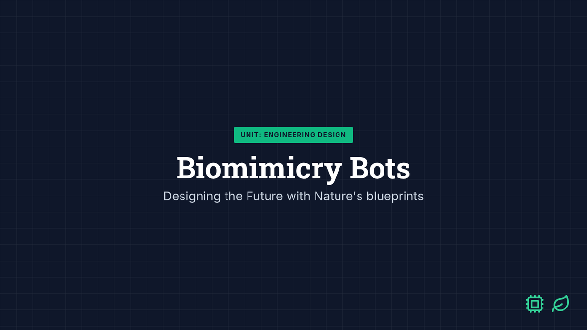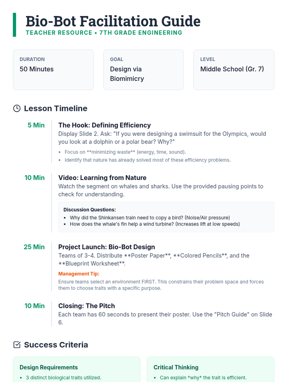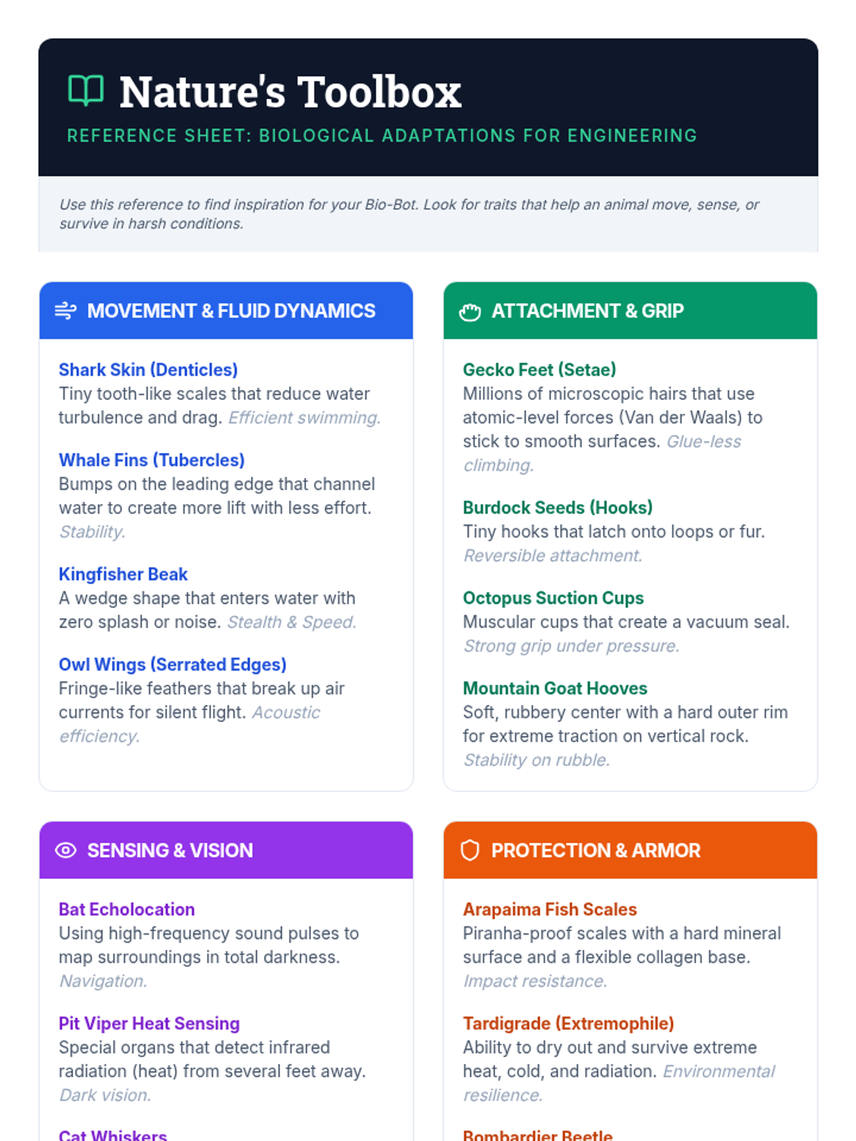 Students explore the concept of biomimicry, evaluate how nature solves engineering challenges, and design a 'Bio-Bot' robot for extreme environments using biological traits for efficiency.