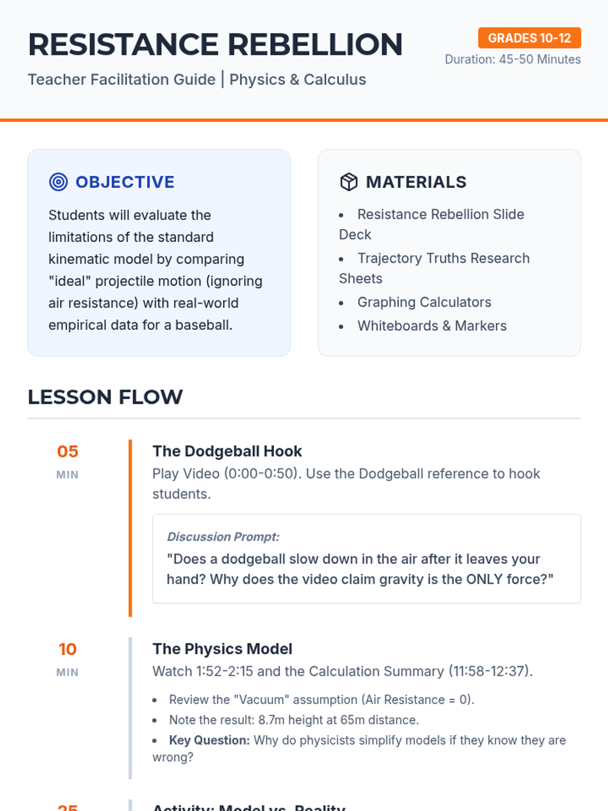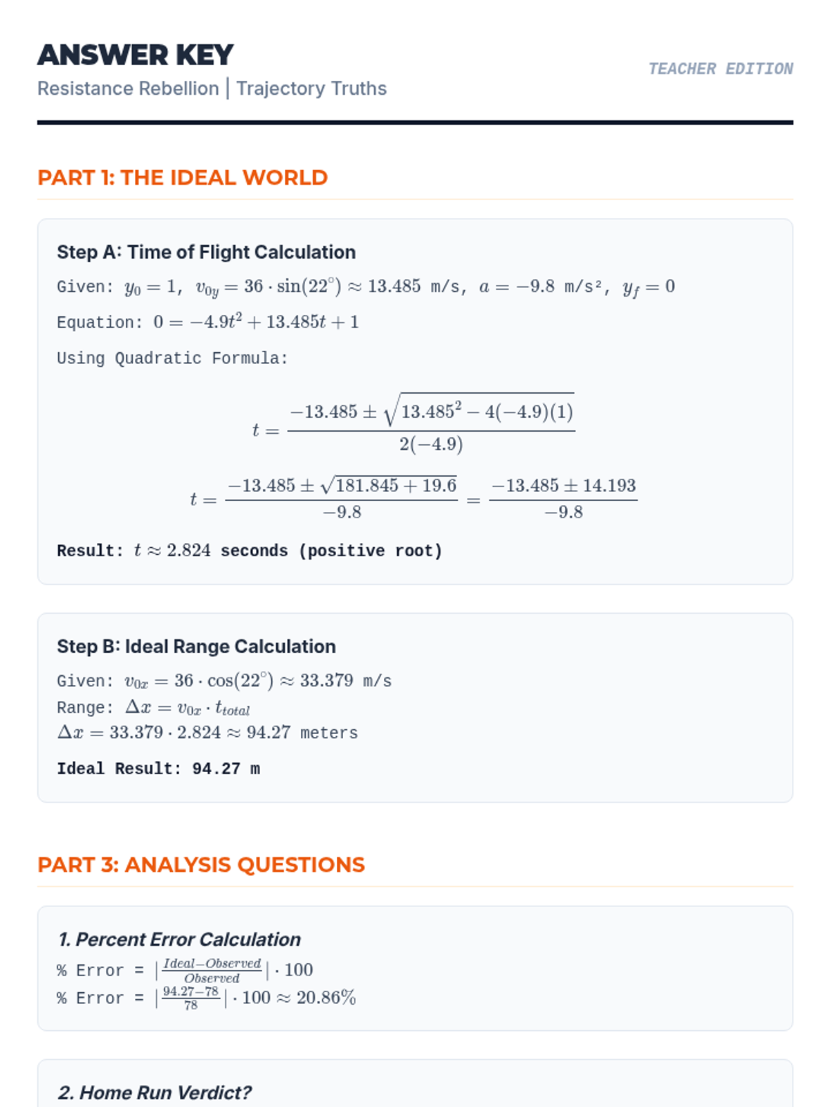 A high school physics lesson exploring the discrepancy between theoretical projectile motion models and real-world results influenced by air resistance. Students use a baseball home run example to compare 'ideal' calculations with actual trajectory data.