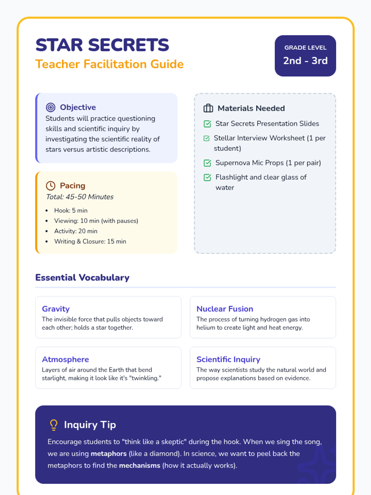 A lesson for 2nd-3rd graders that uses a humorous video to teach the scientific facts about stars while practicing questioning and inquiry skills. Students will role-play as reporters and stars, and rewrite the classic nursery rhyme with scientific accuracy.