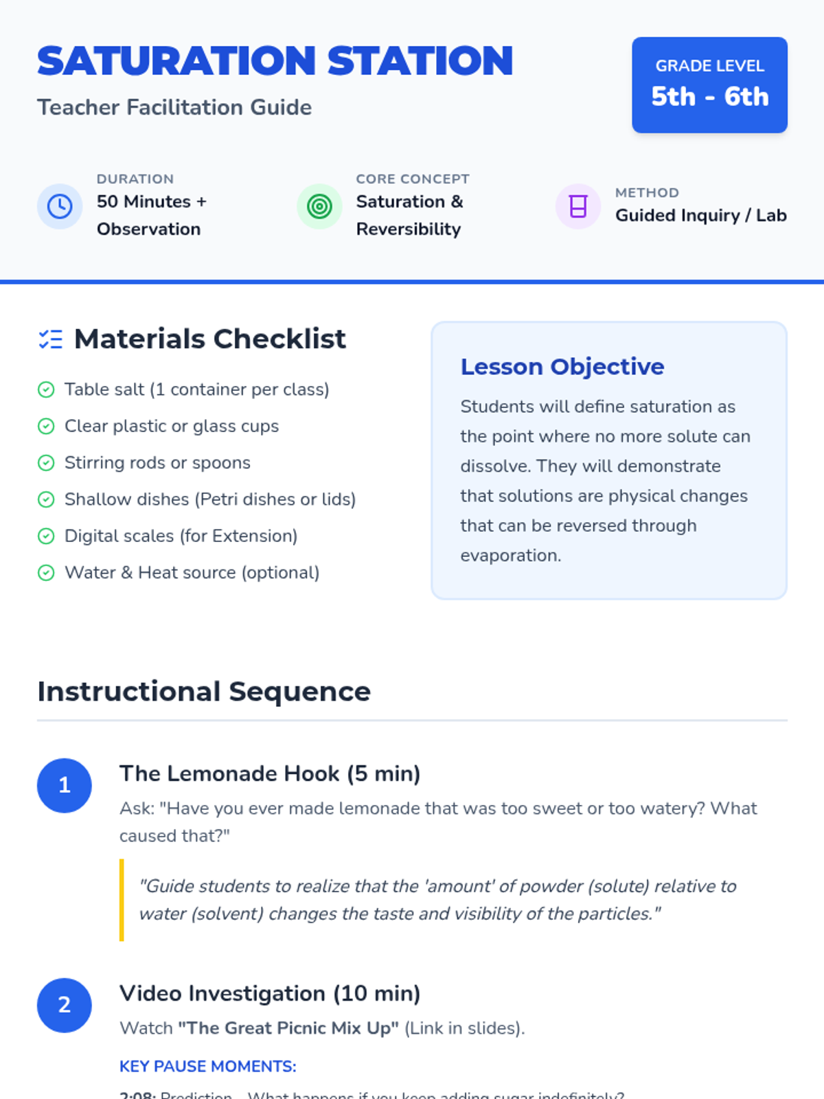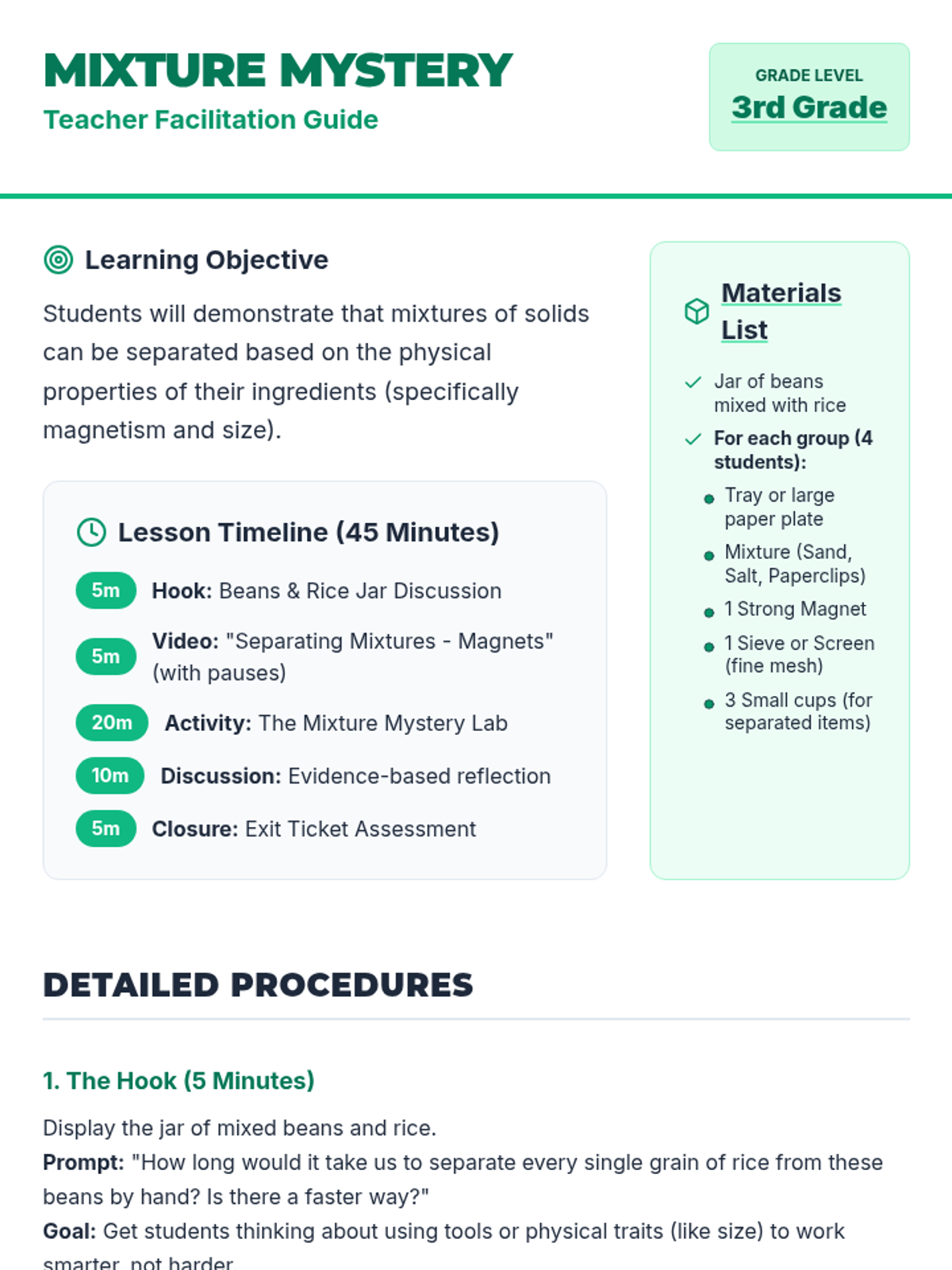 A hands-on science lesson where 3rd-grade students explore how to separate mixtures of solids using physical properties like magnetism and size. Students engage with a video demonstration and a laboratory challenge to separate sand, salt, and paperclips.