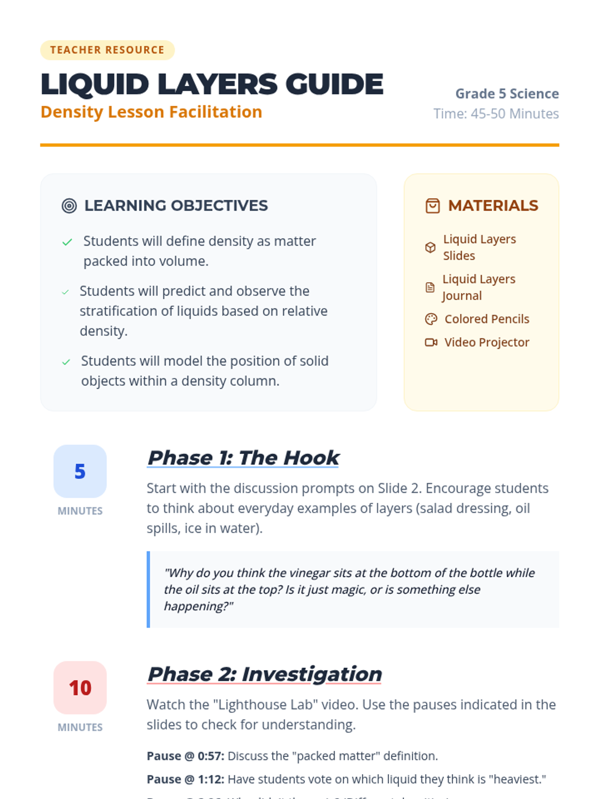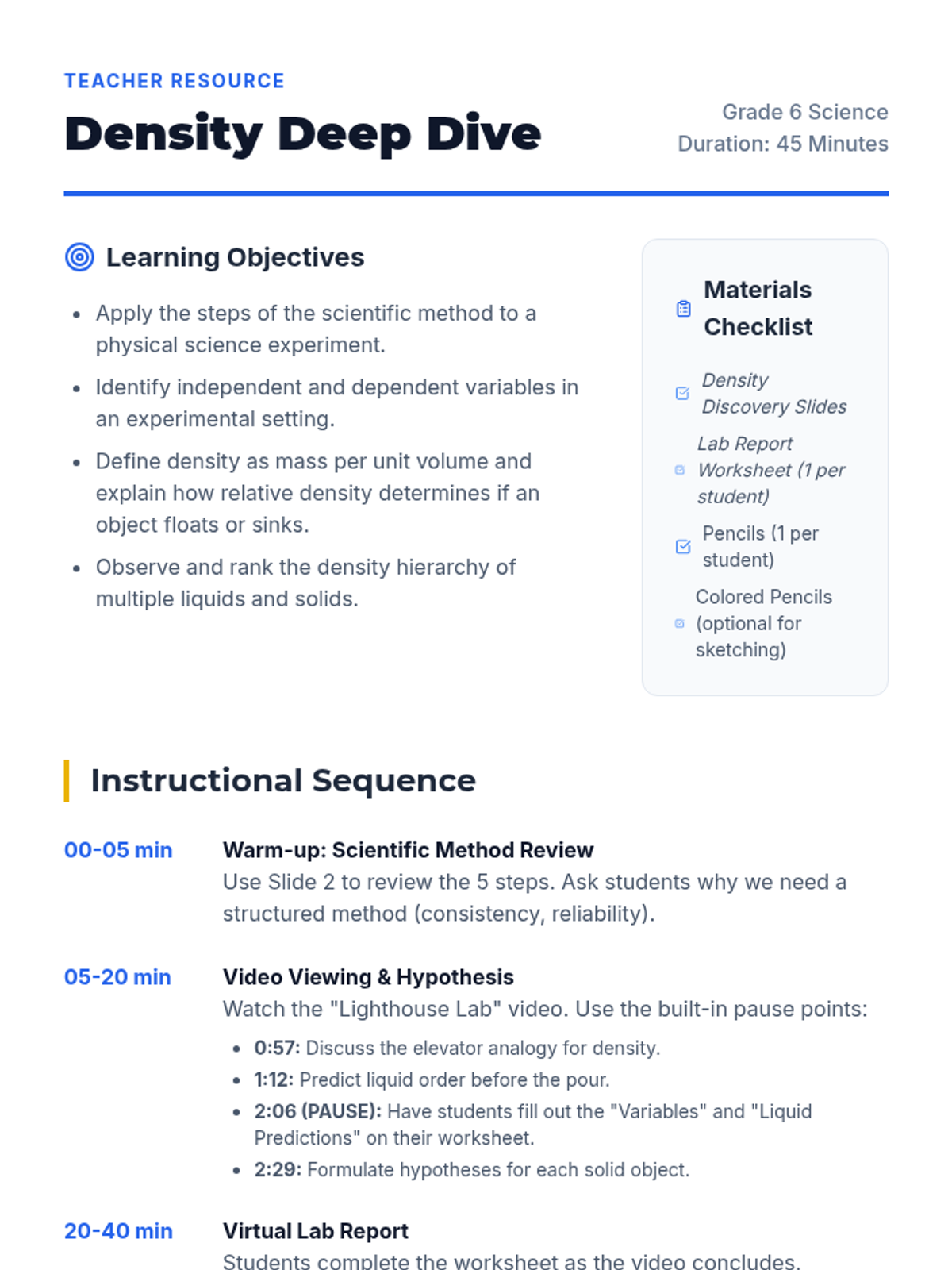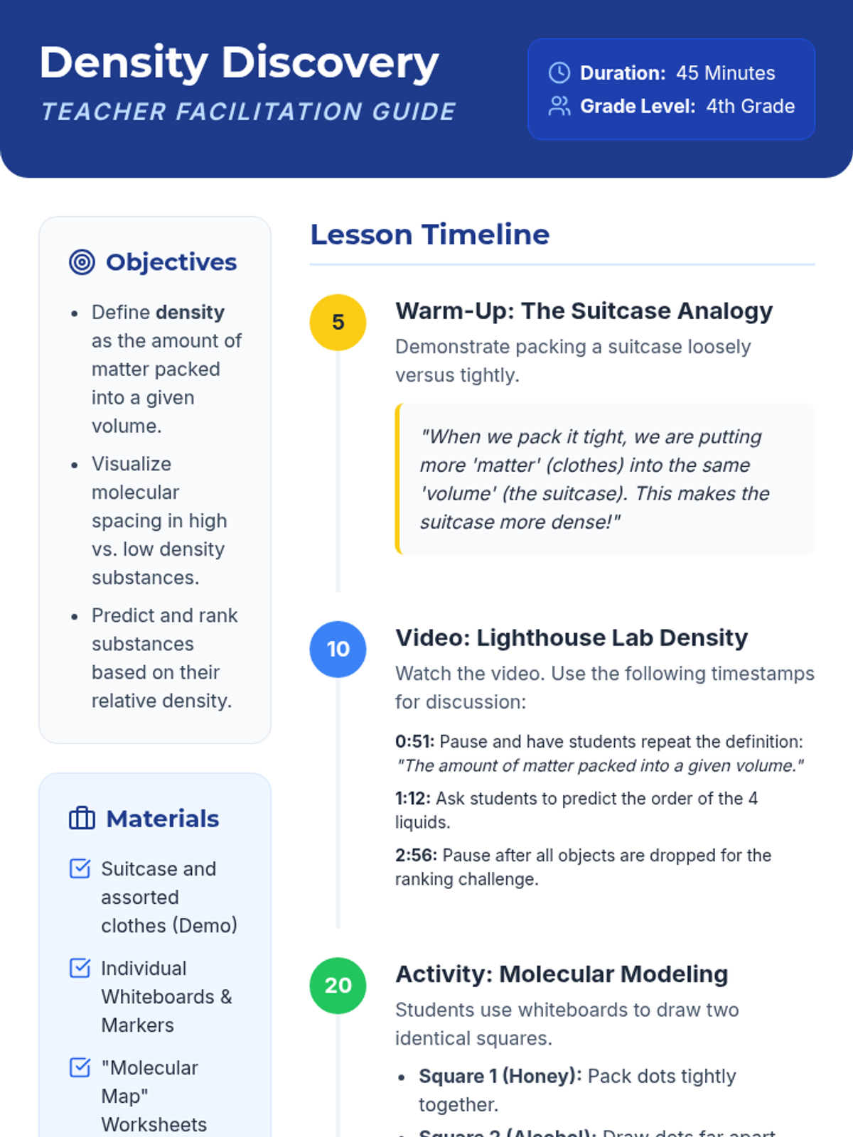 Students explore the concept of density through a hands-on 'Sink or Float' activity and a guided video demonstration. They will learn to define density as 'matter packed into a volume' and make predictions based on observations of various objects and liquids.